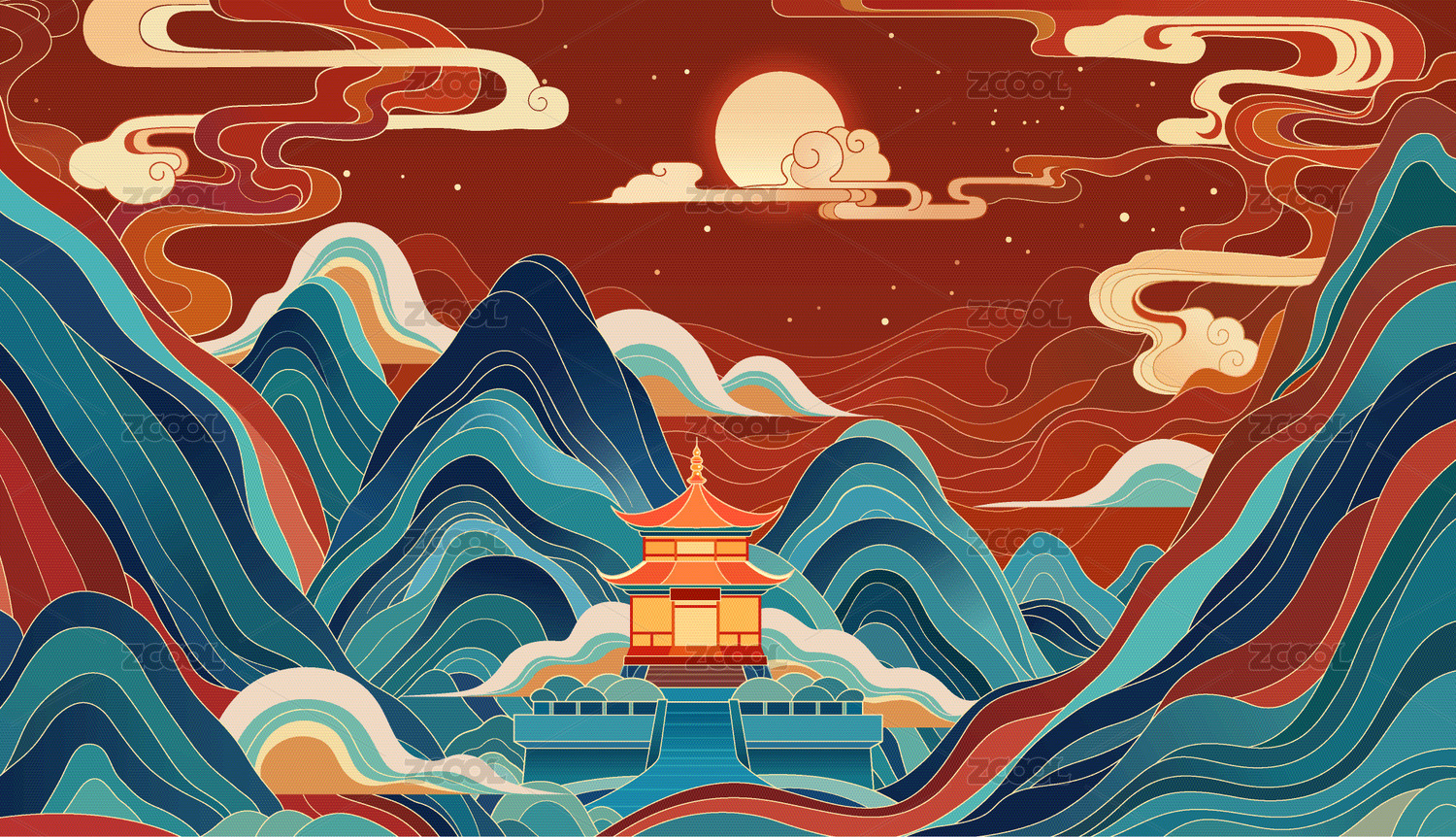 祥云山中樓閣國(guó)潮矢量插畫(huà)