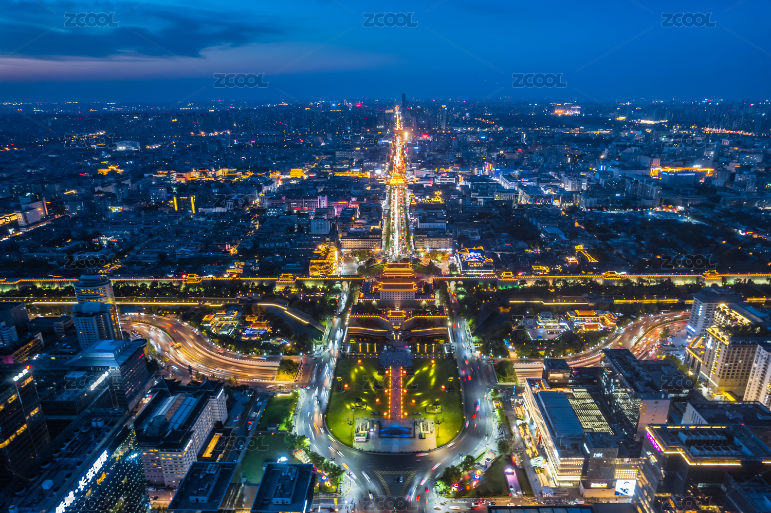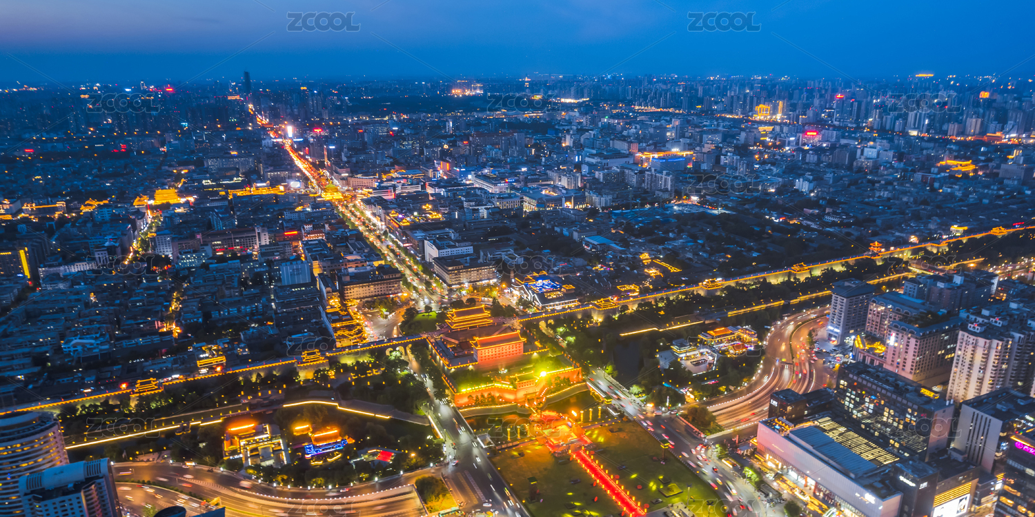 中國(guó)陜西西安城墻南門永寧門天際線夜景航拍
