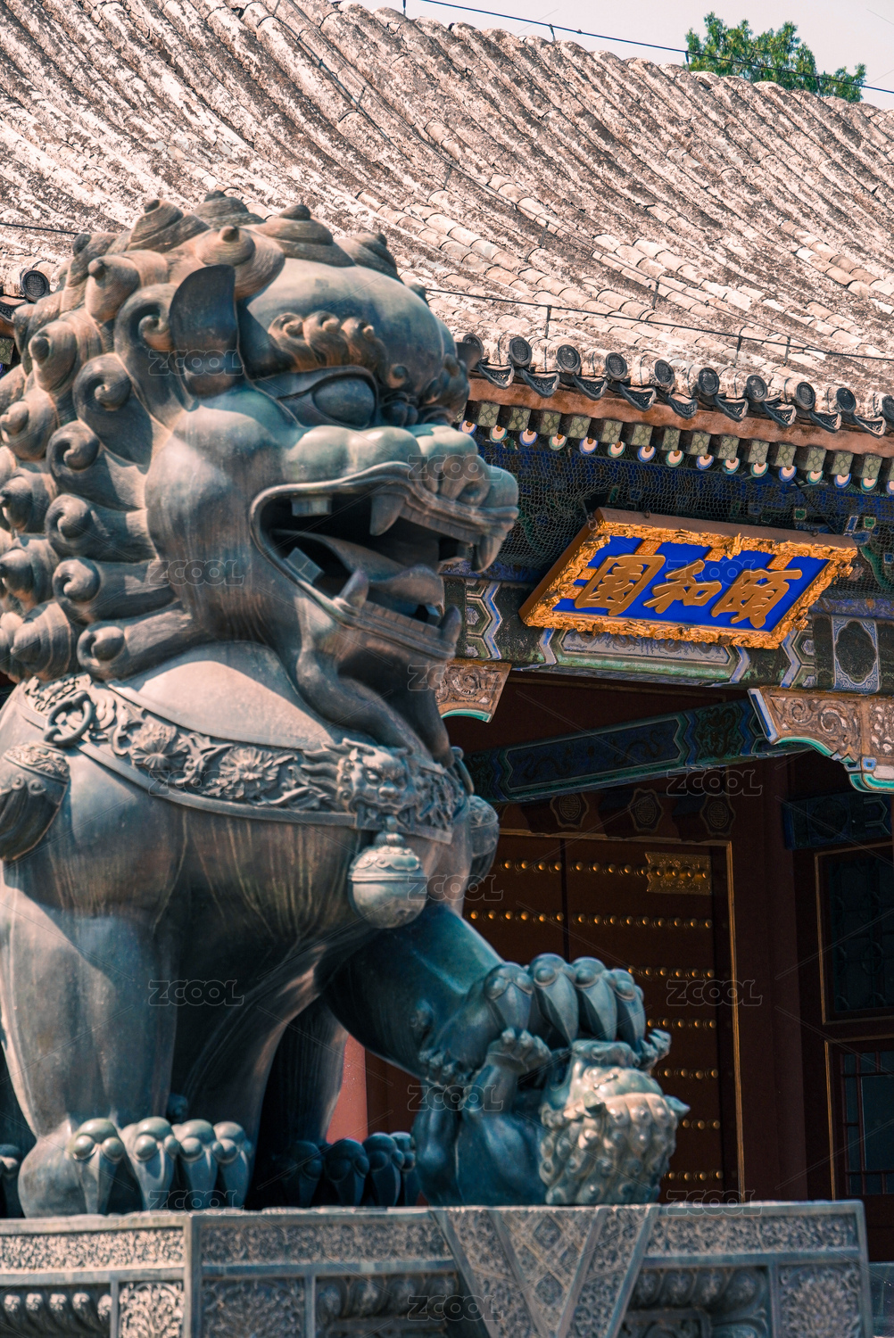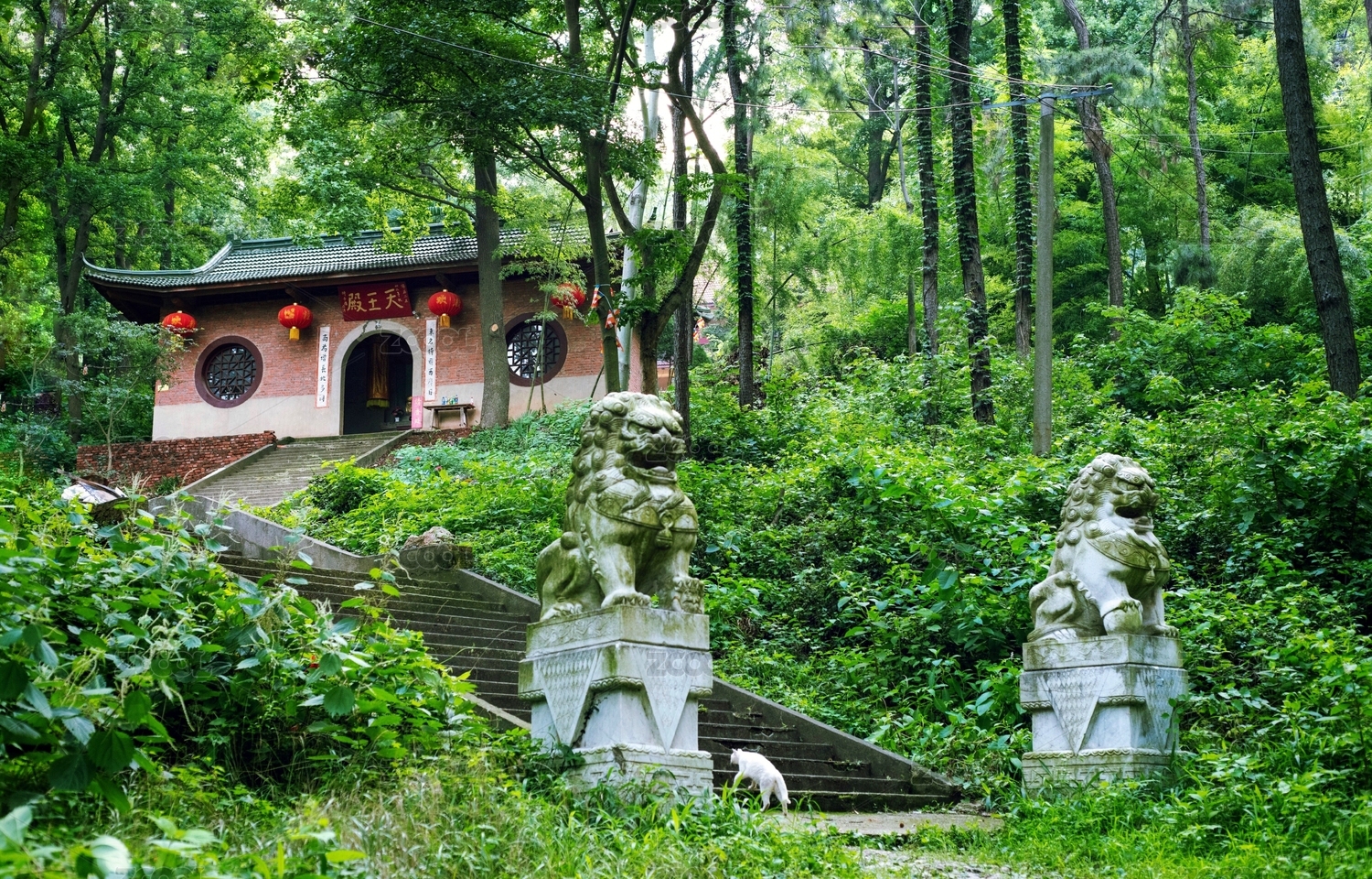 江蘇南京老山森林公園兜率寺的傳統(tǒng)建筑與石獅子