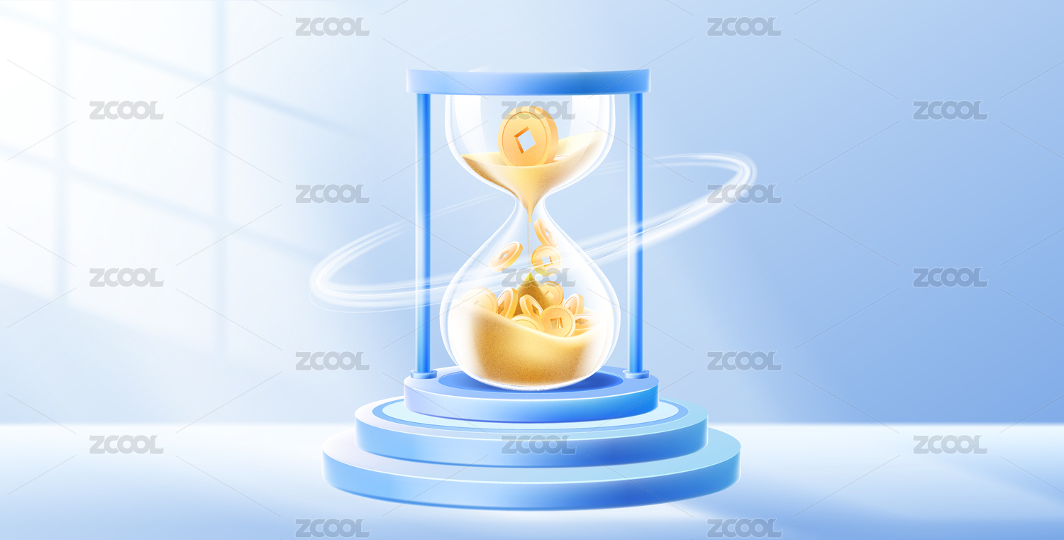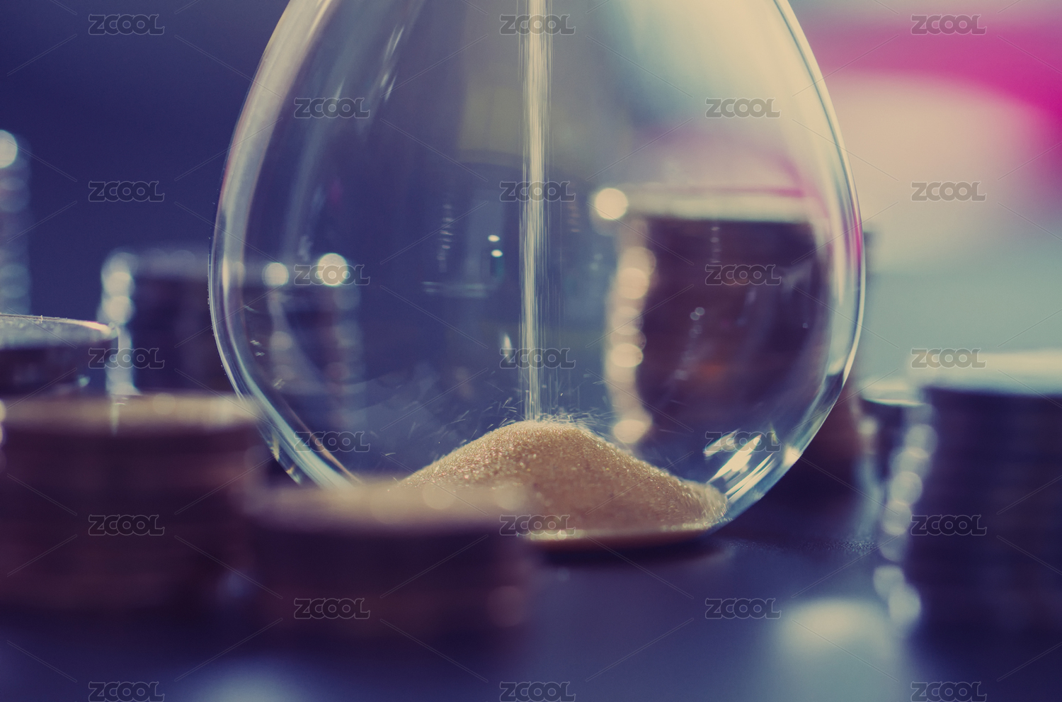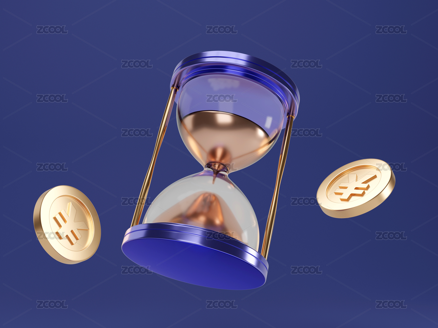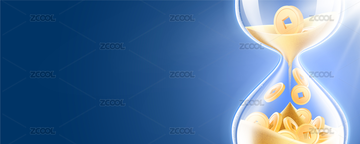 藍色背景中的時間沙漏和金幣創(chuàng)意素材