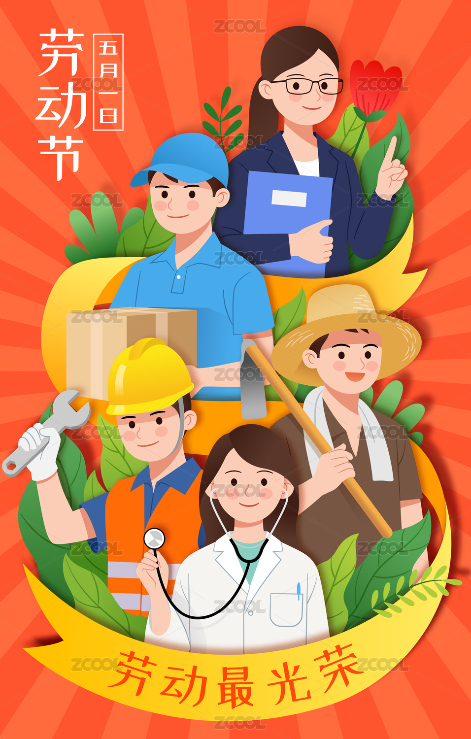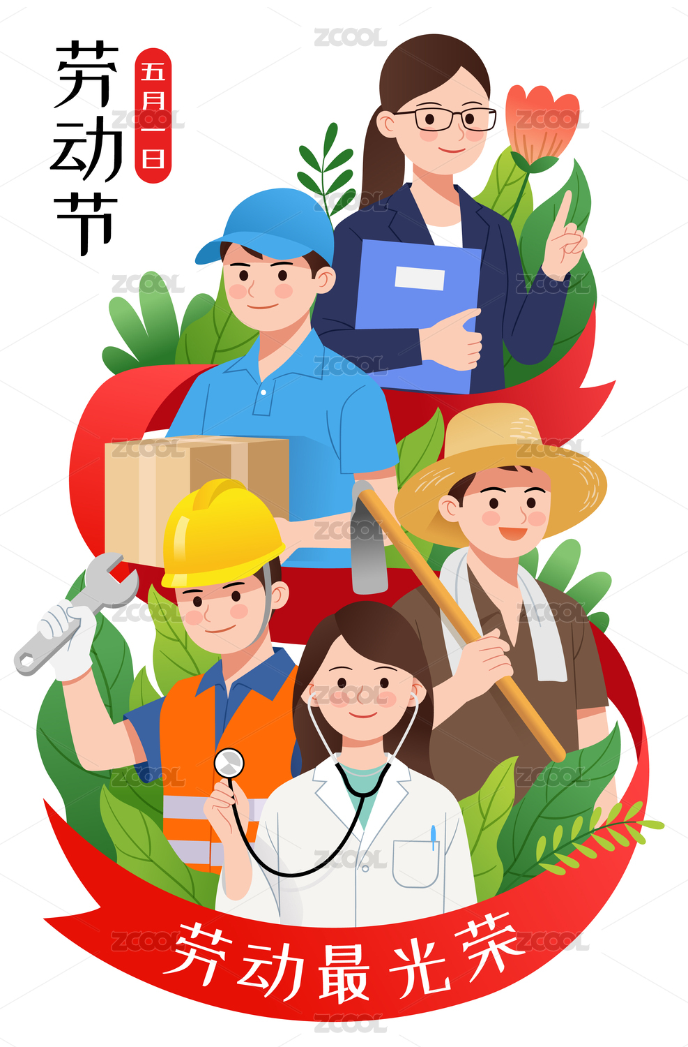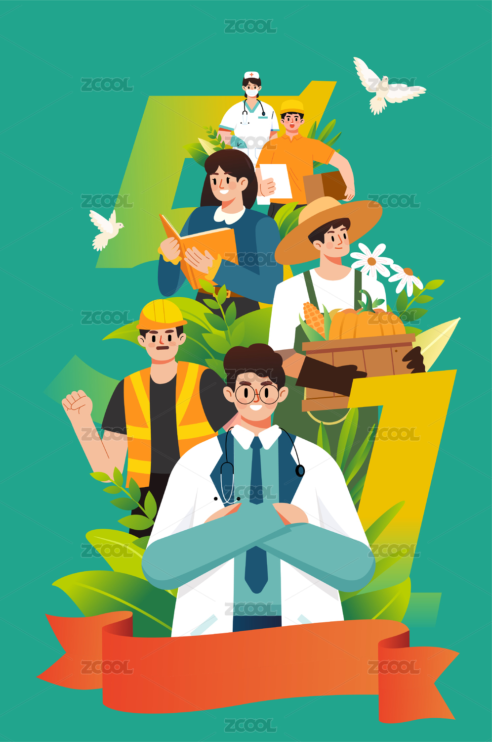 勞動節(jié)不同職業(yè)人物和紅色絲帶數(shù)字5