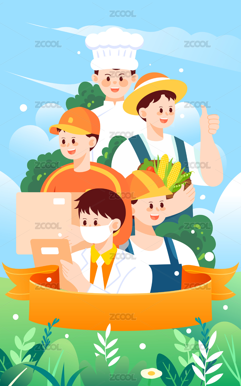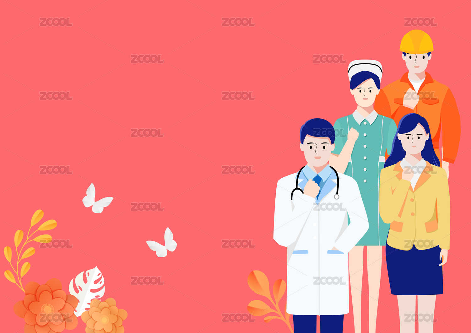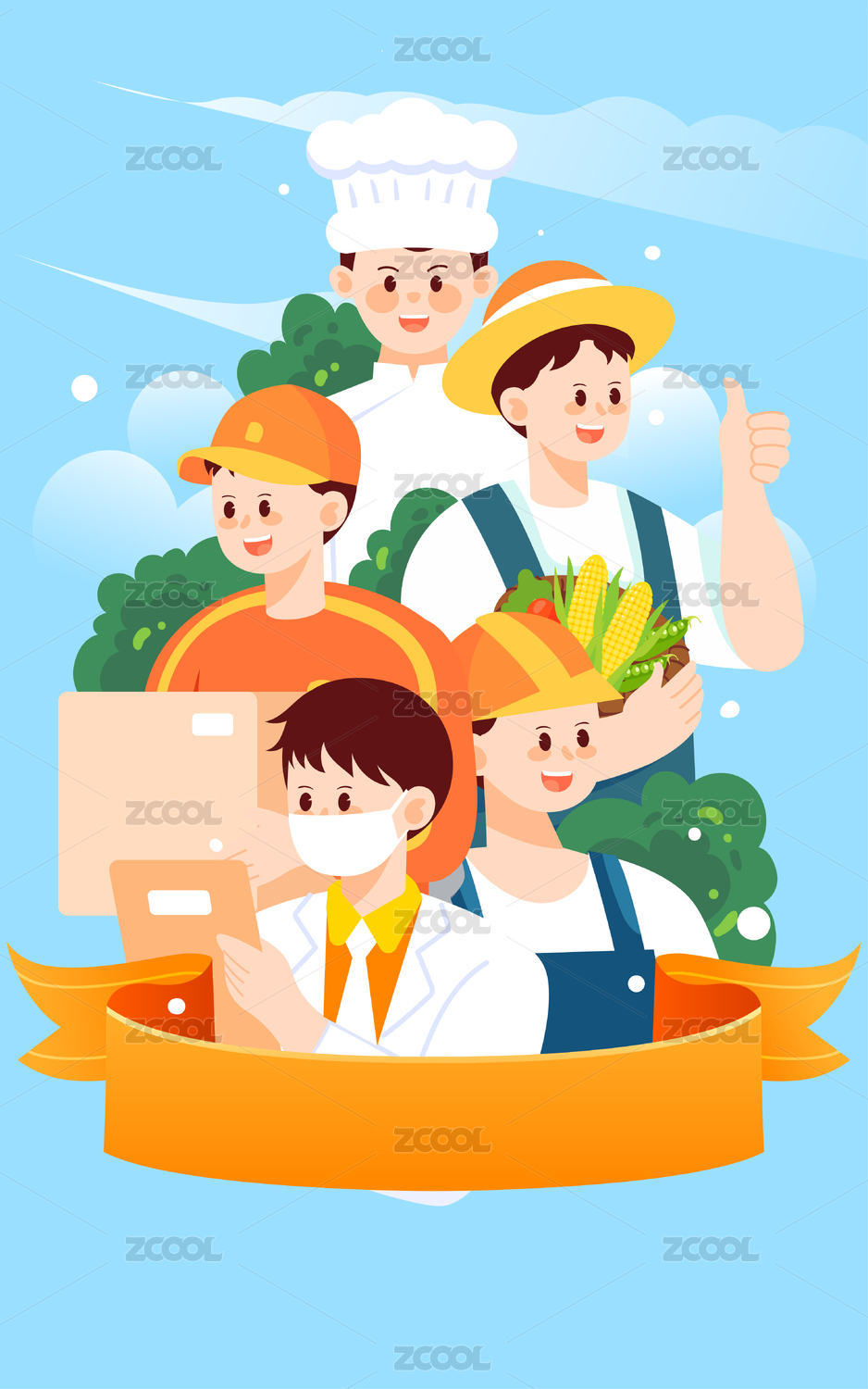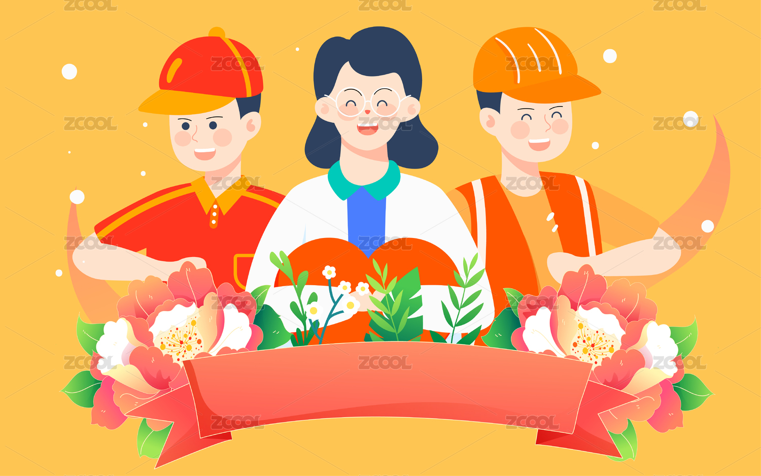 勞動節(jié)不同職業(yè)人物和紅色絲帶數(shù)字5