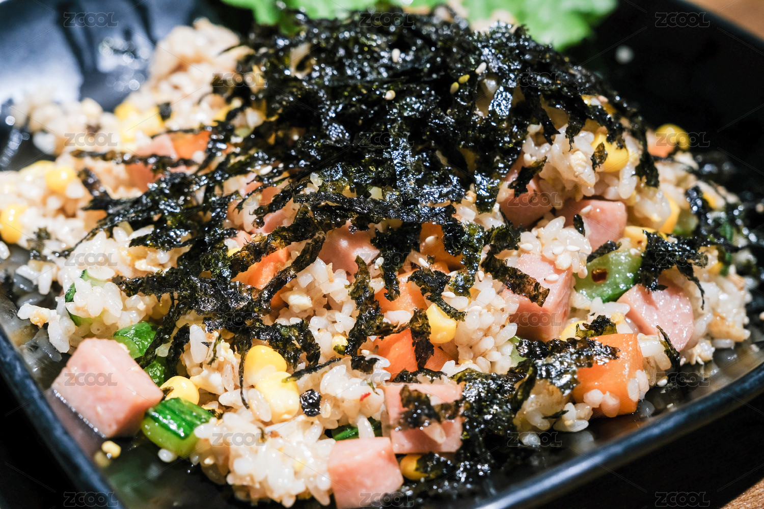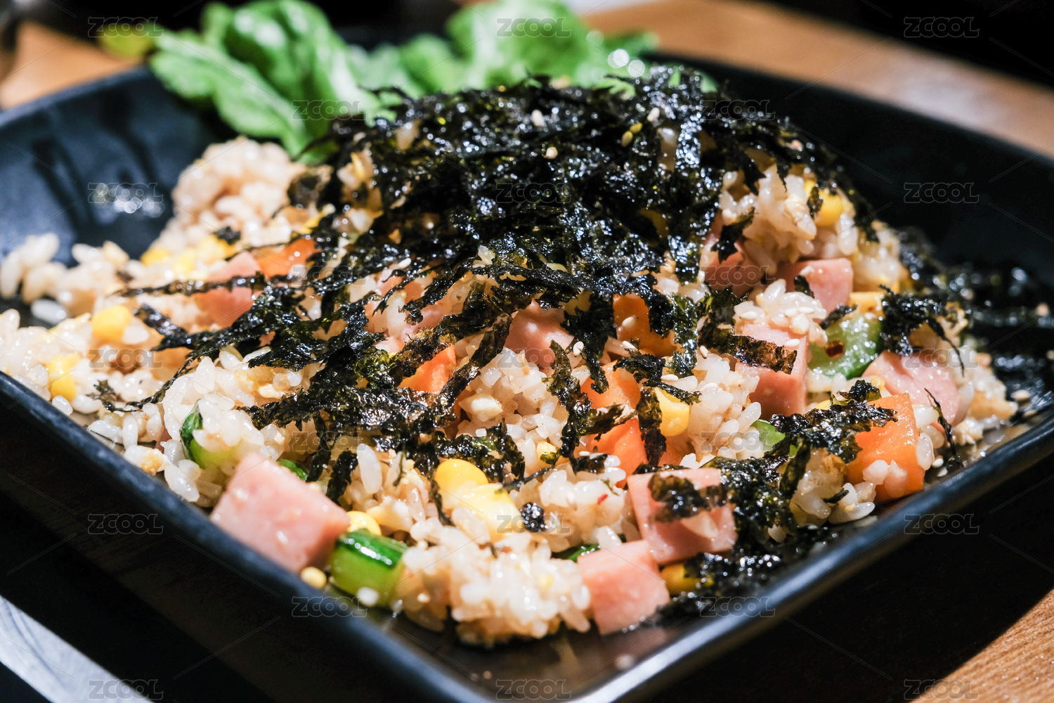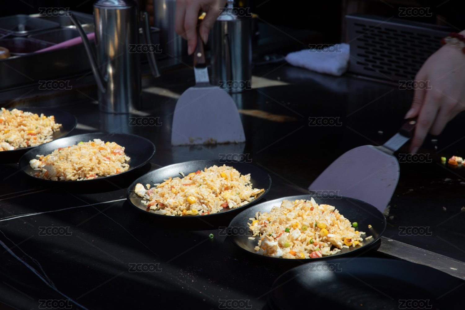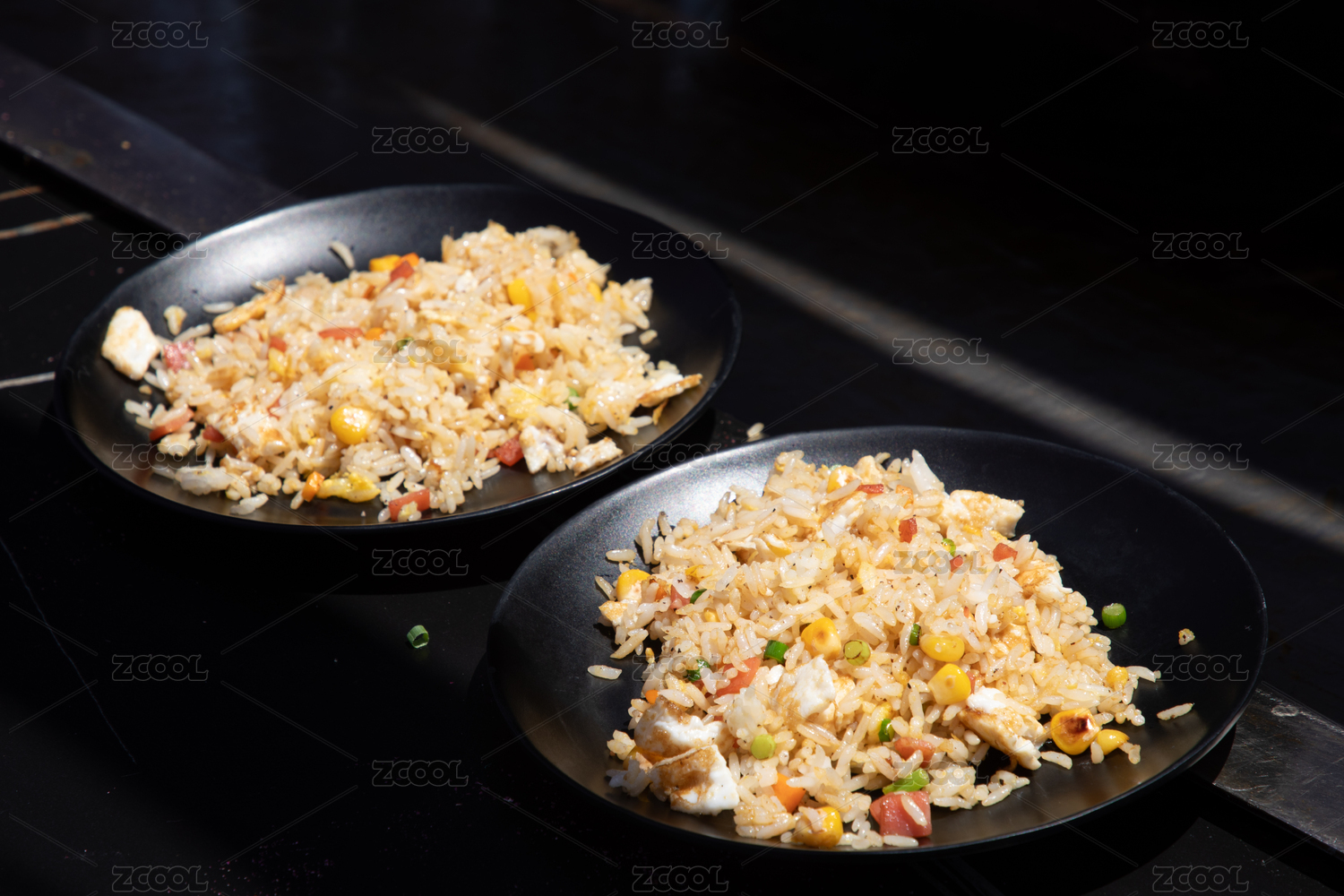 美味的什錦炒飯放在黑色的料理臺(tái)上