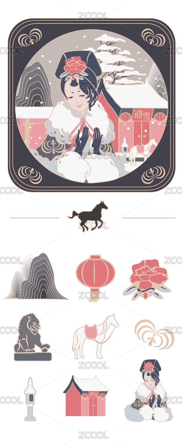 中國風府邸前清朝美女迎雪矢量插畫與素材