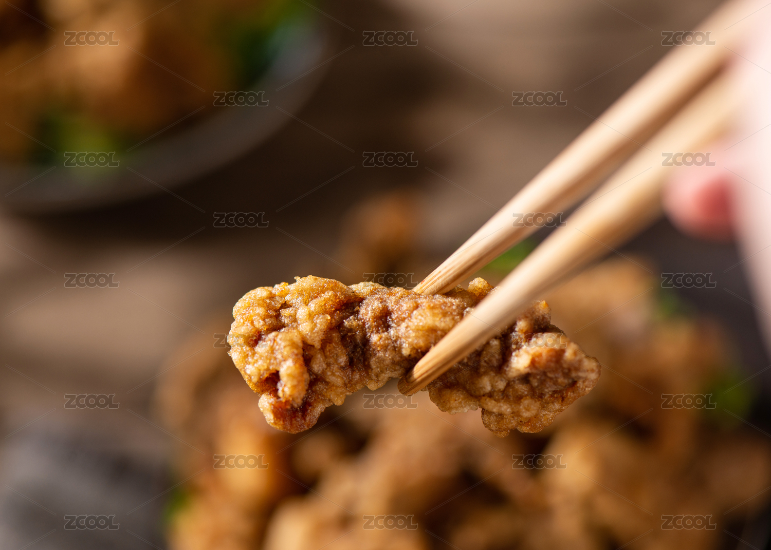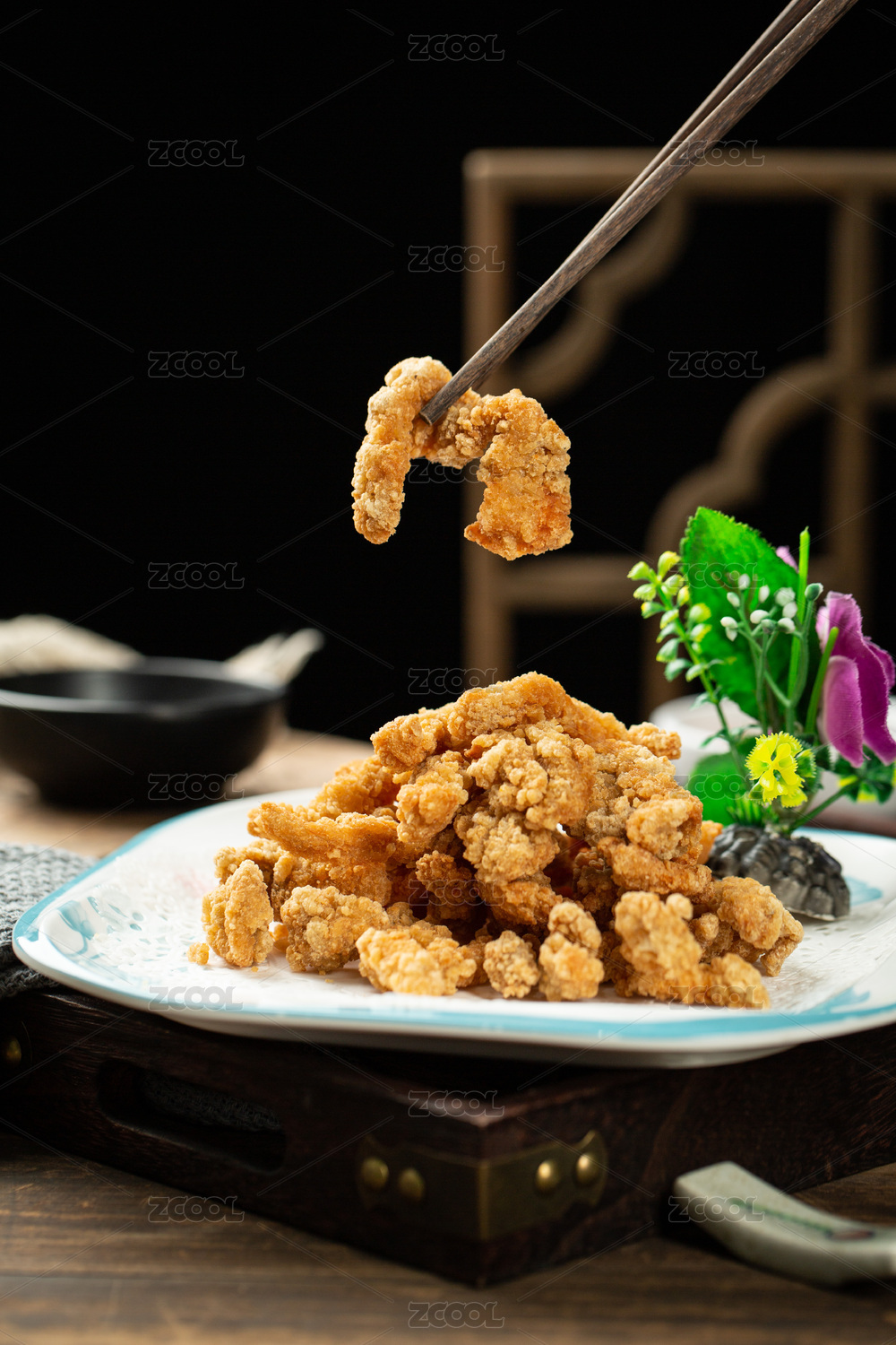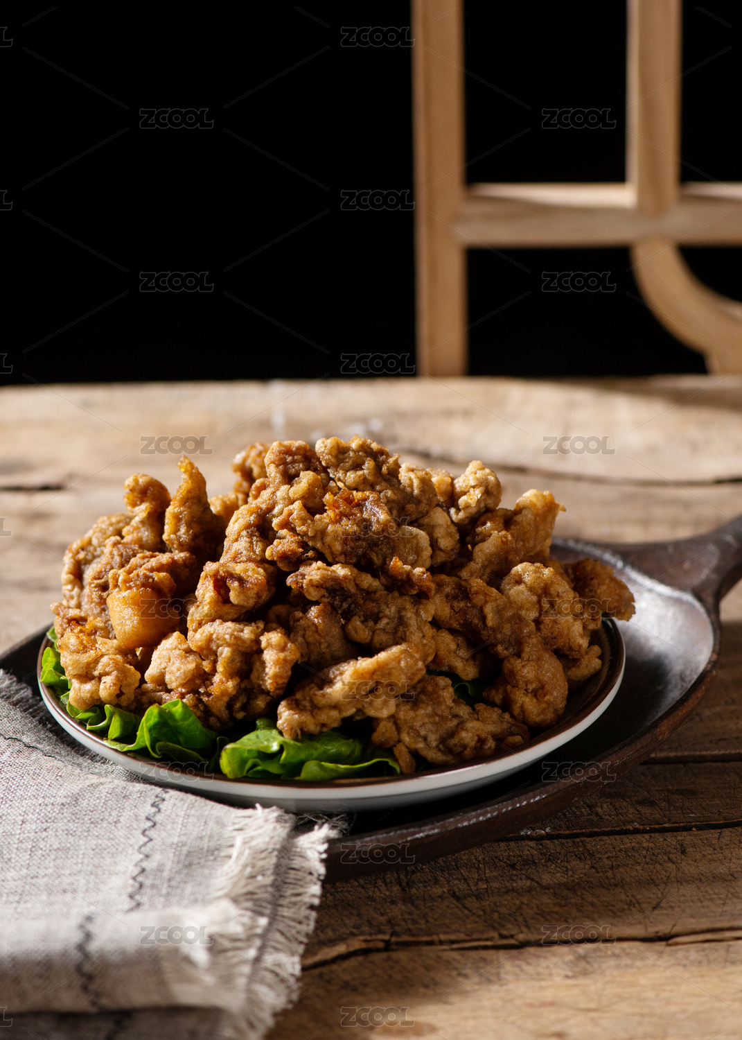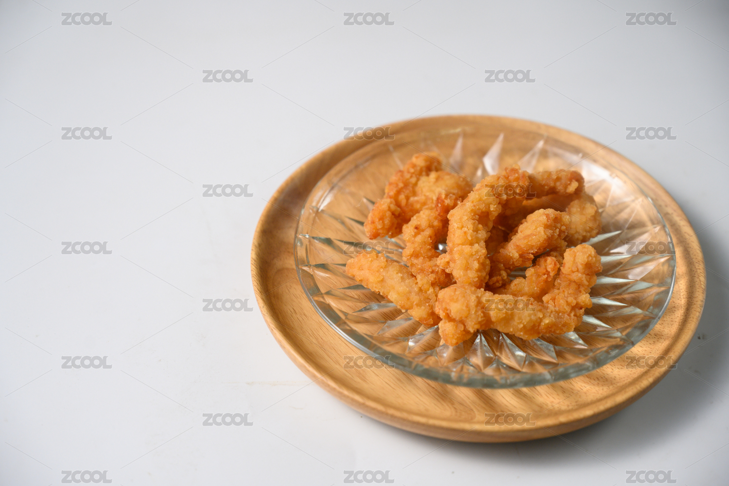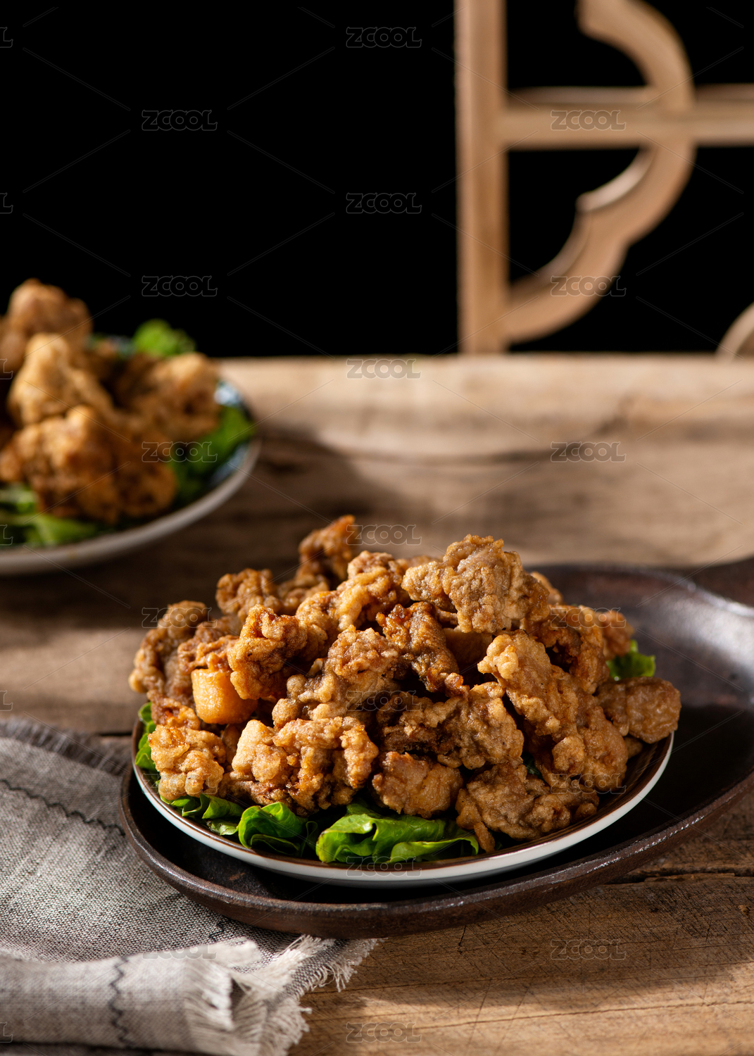 木質(zhì)背景上餐盤里擺放的小酥肉
