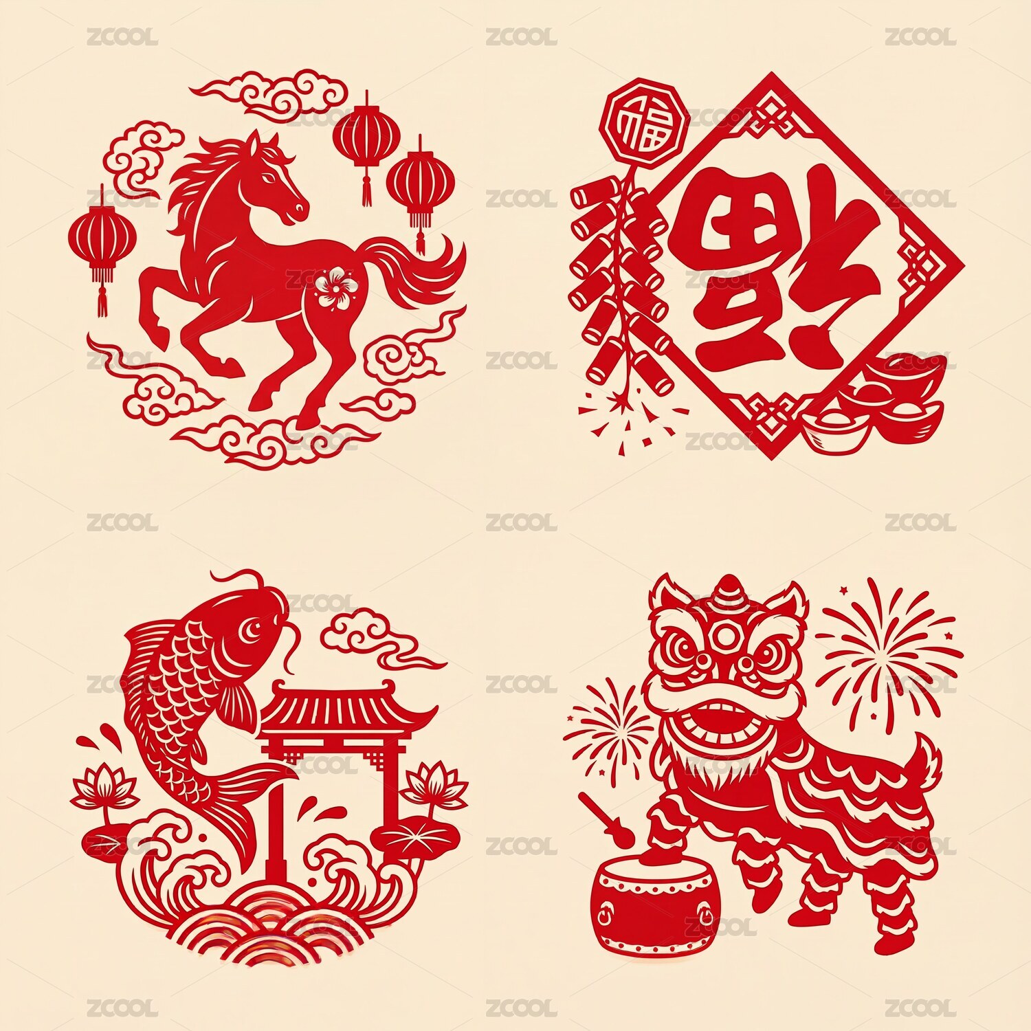 馬魚獅等傳統(tǒng)喜慶剪紙圖案