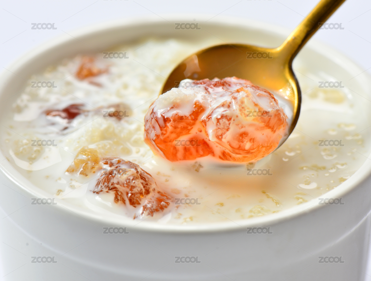 淺色背景上白色餐具中盛放的牛奶燉桃膠雪燕
