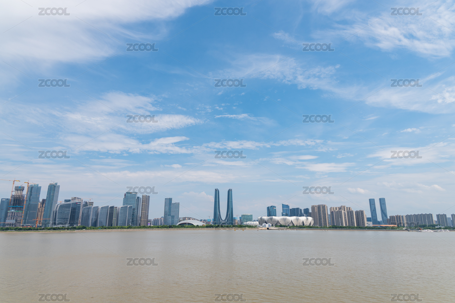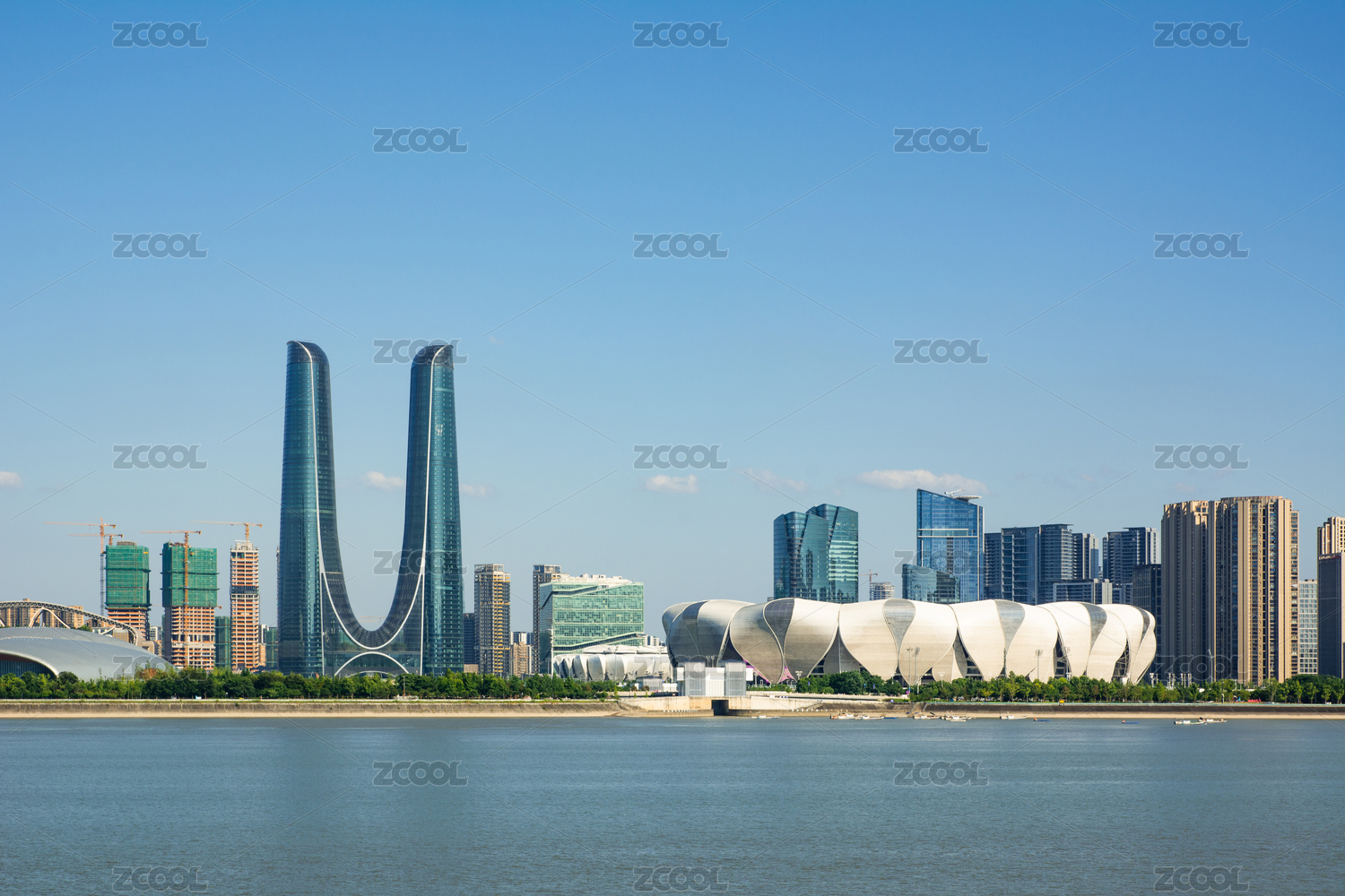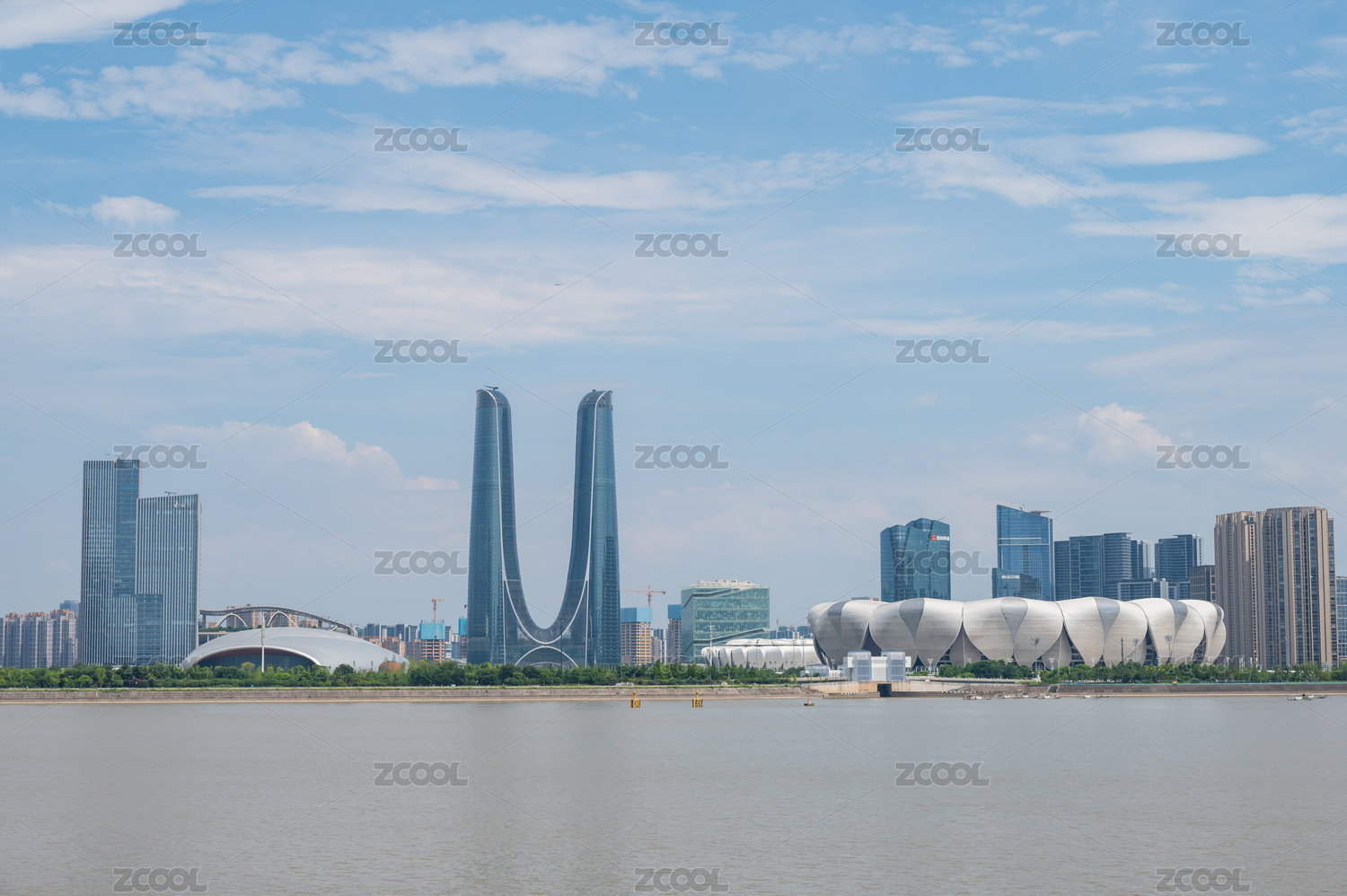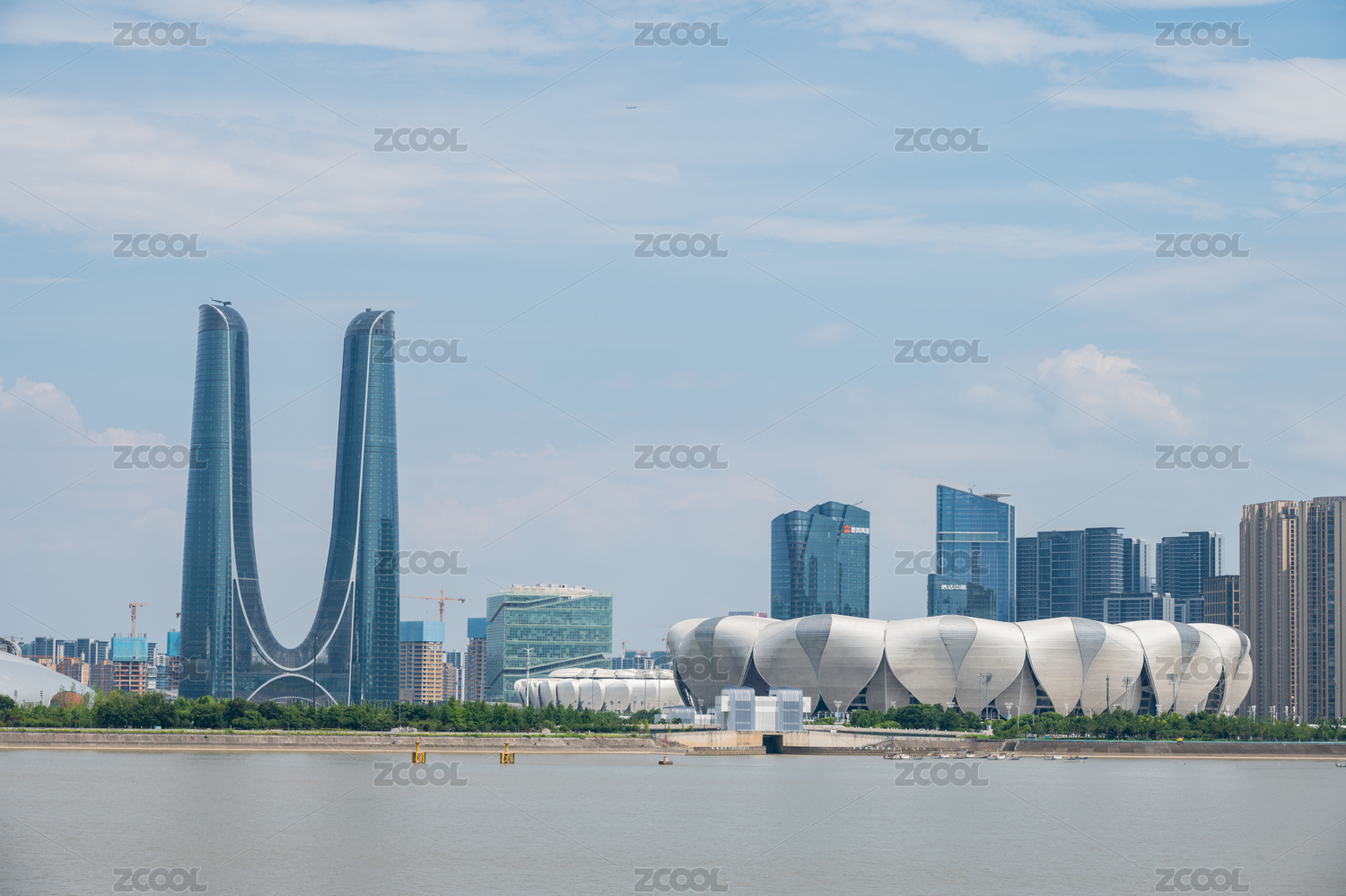 中國(guó)浙江杭州錢(qián)塘江邊的杭州之門(mén)和奧體中心