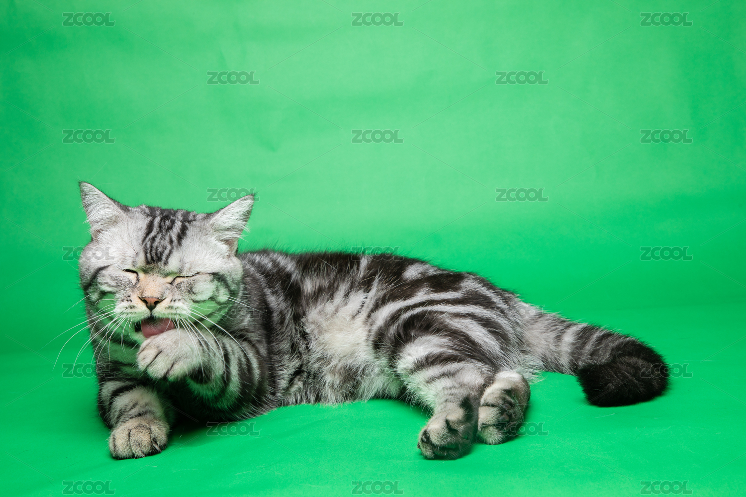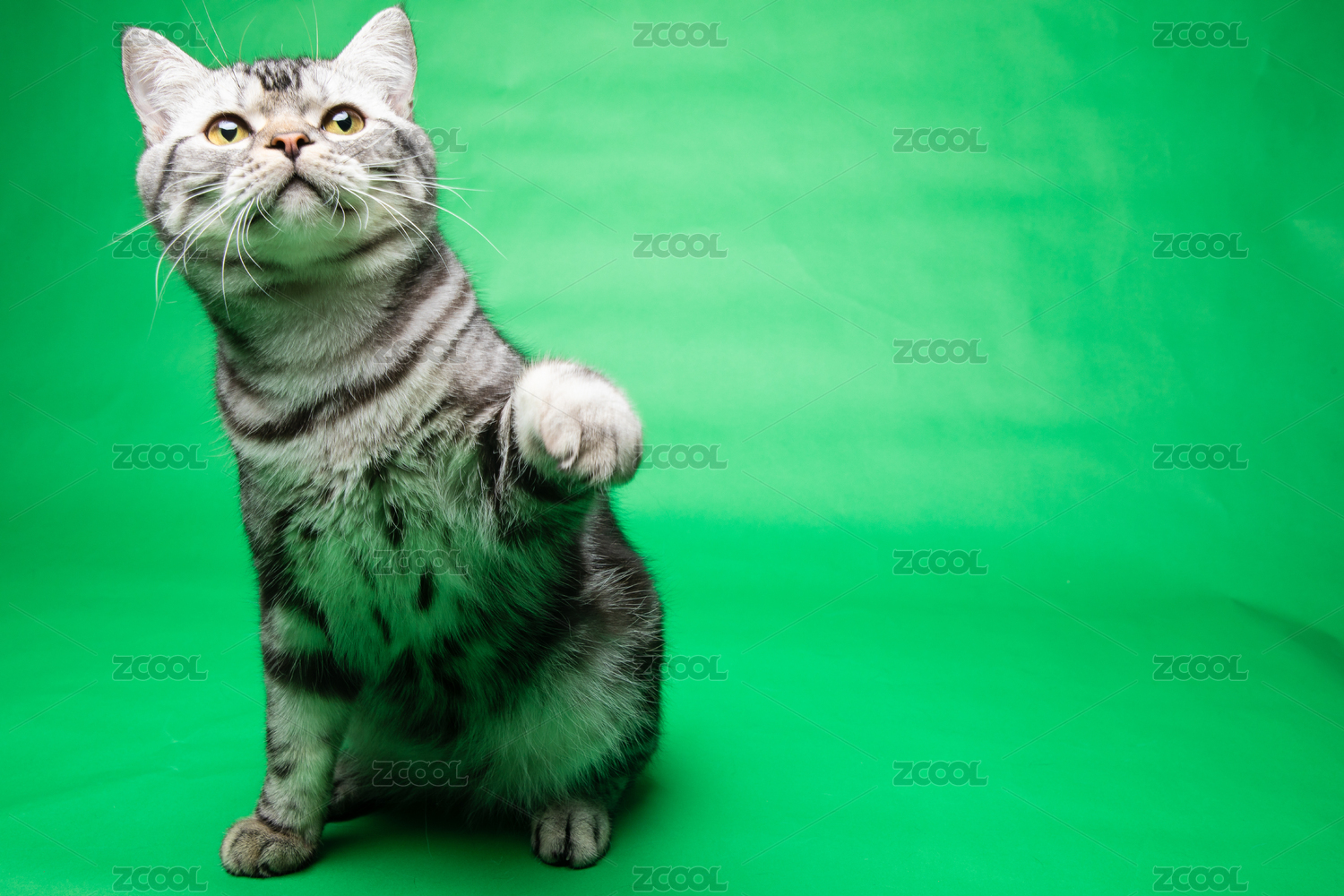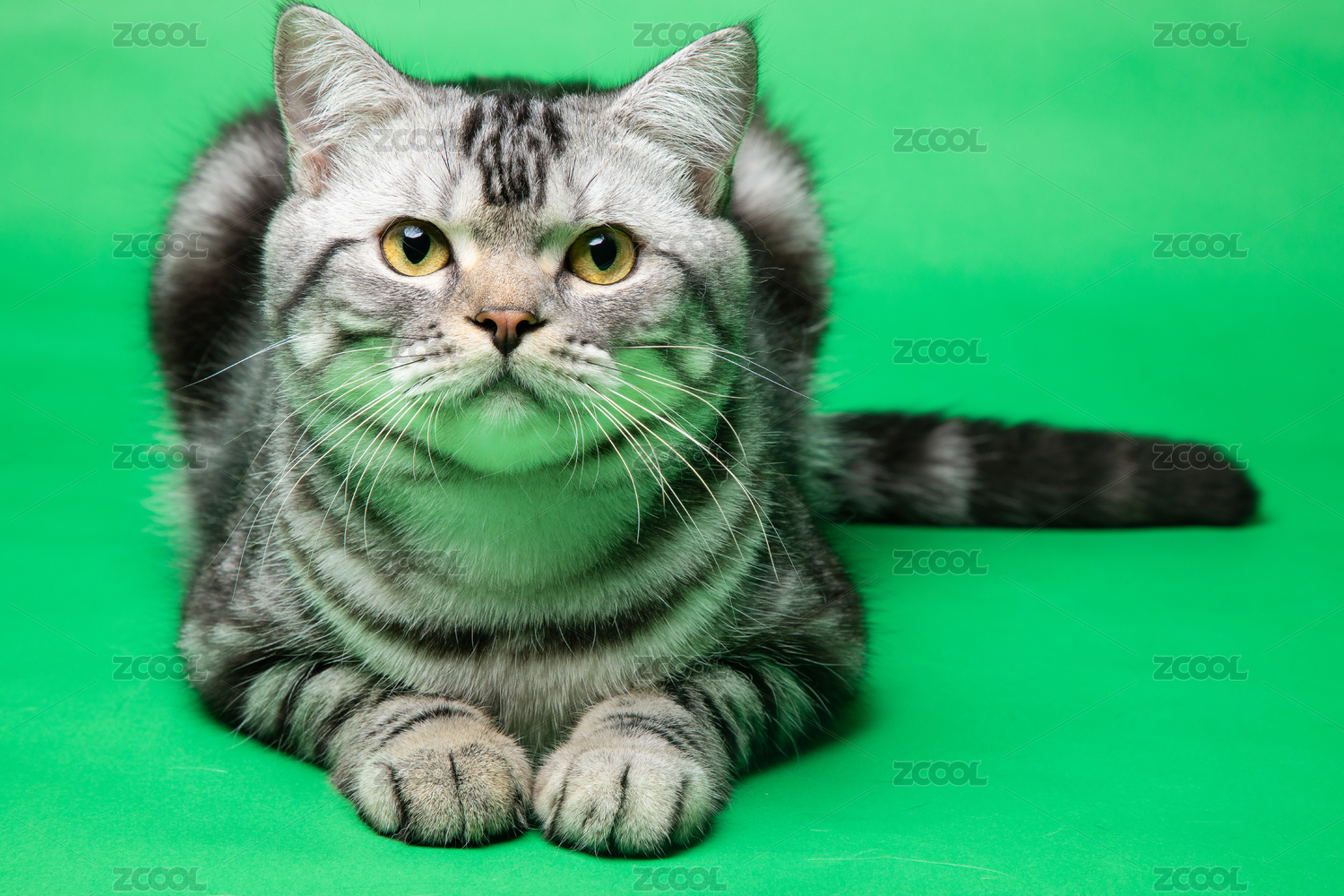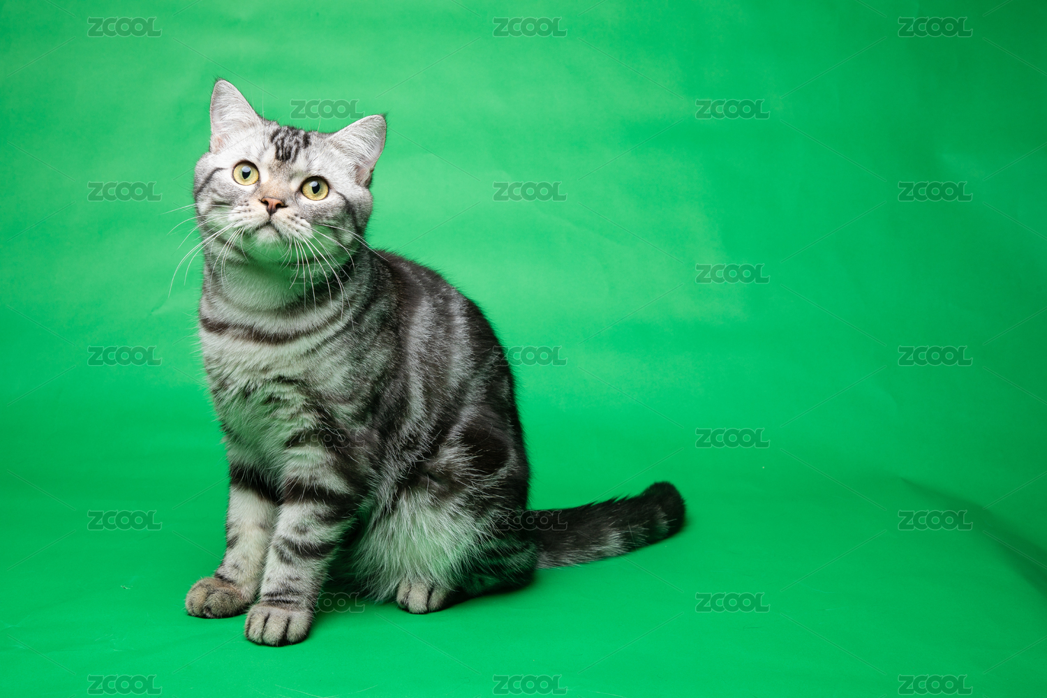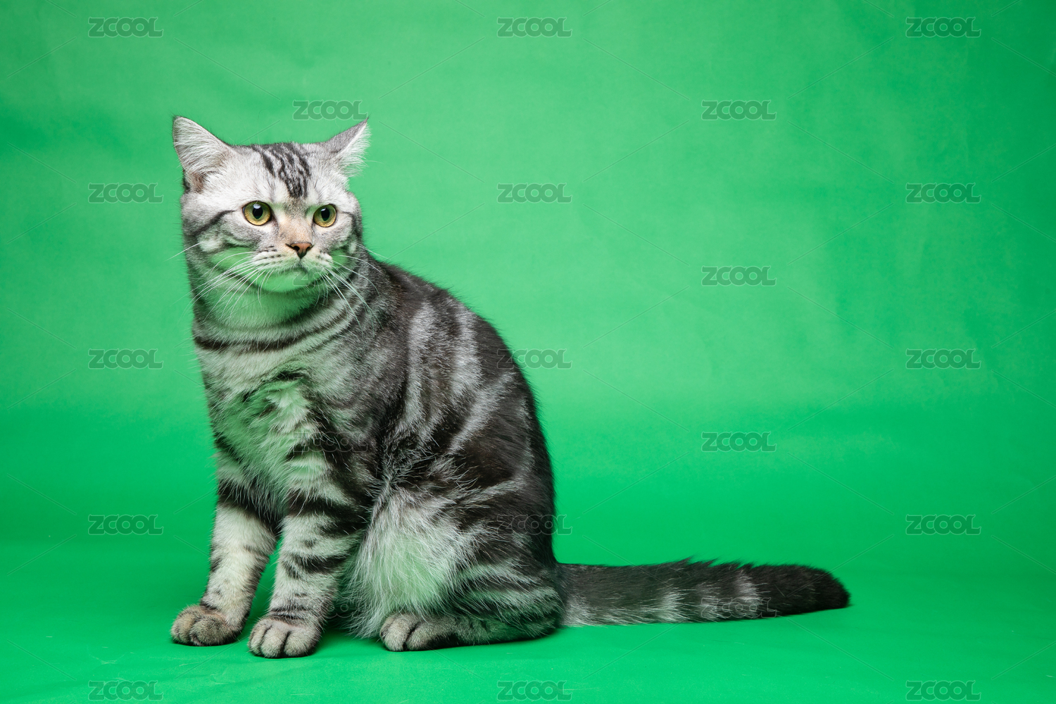 綠色背景分離特寫條紋虎斑美國短毛貓