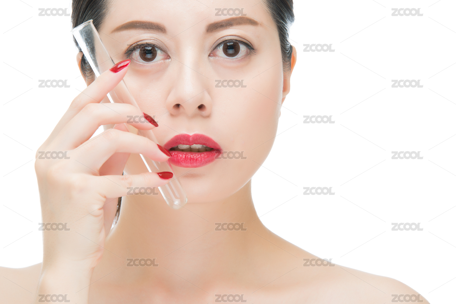 時(shí)尚亞洲女性紅嘴唇釘子和保持化學(xué)測試實(shí)驗(yàn)室管,在白色背景分離的
