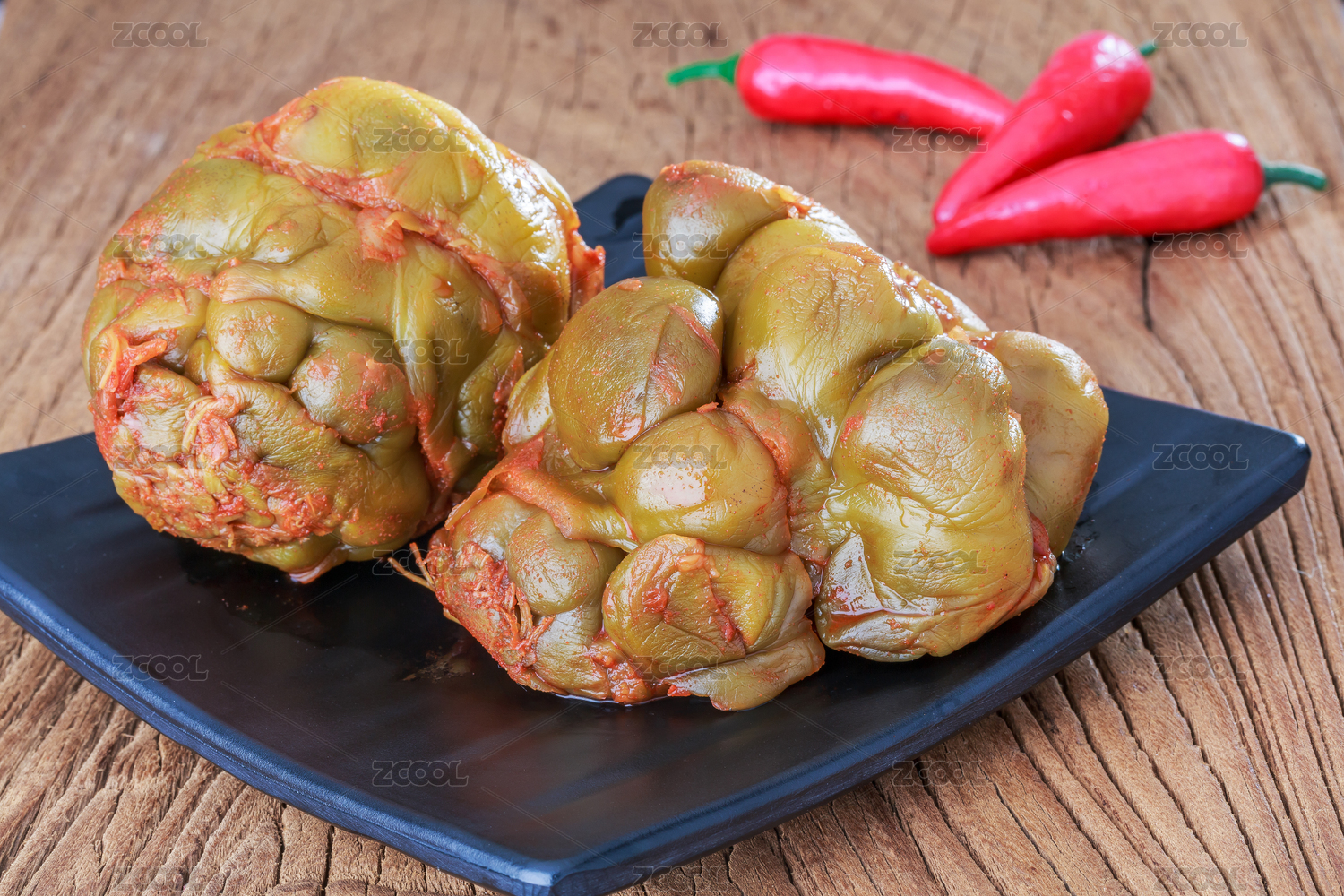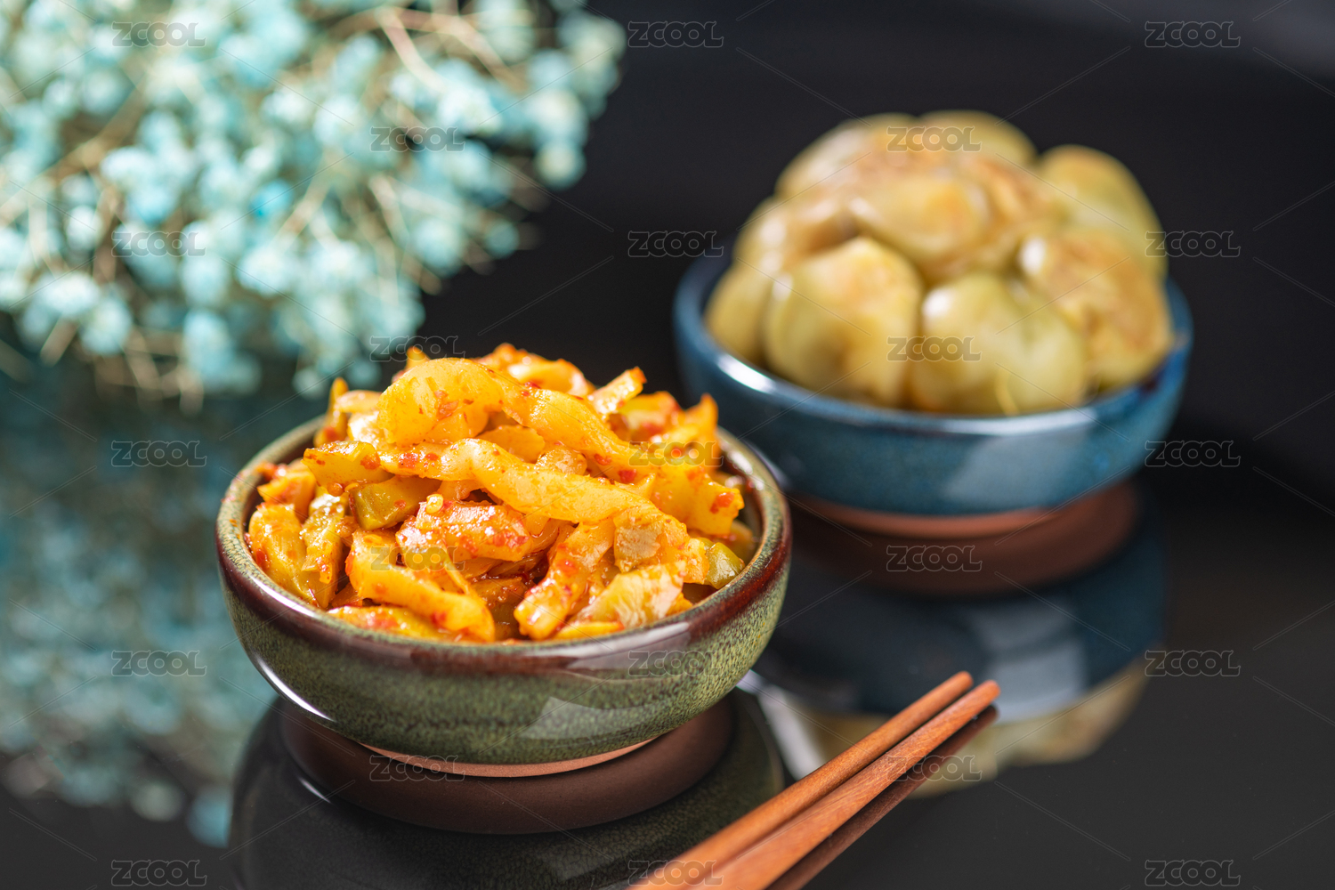 桌面上餐碟里的兩個(gè)腌榨菜頭