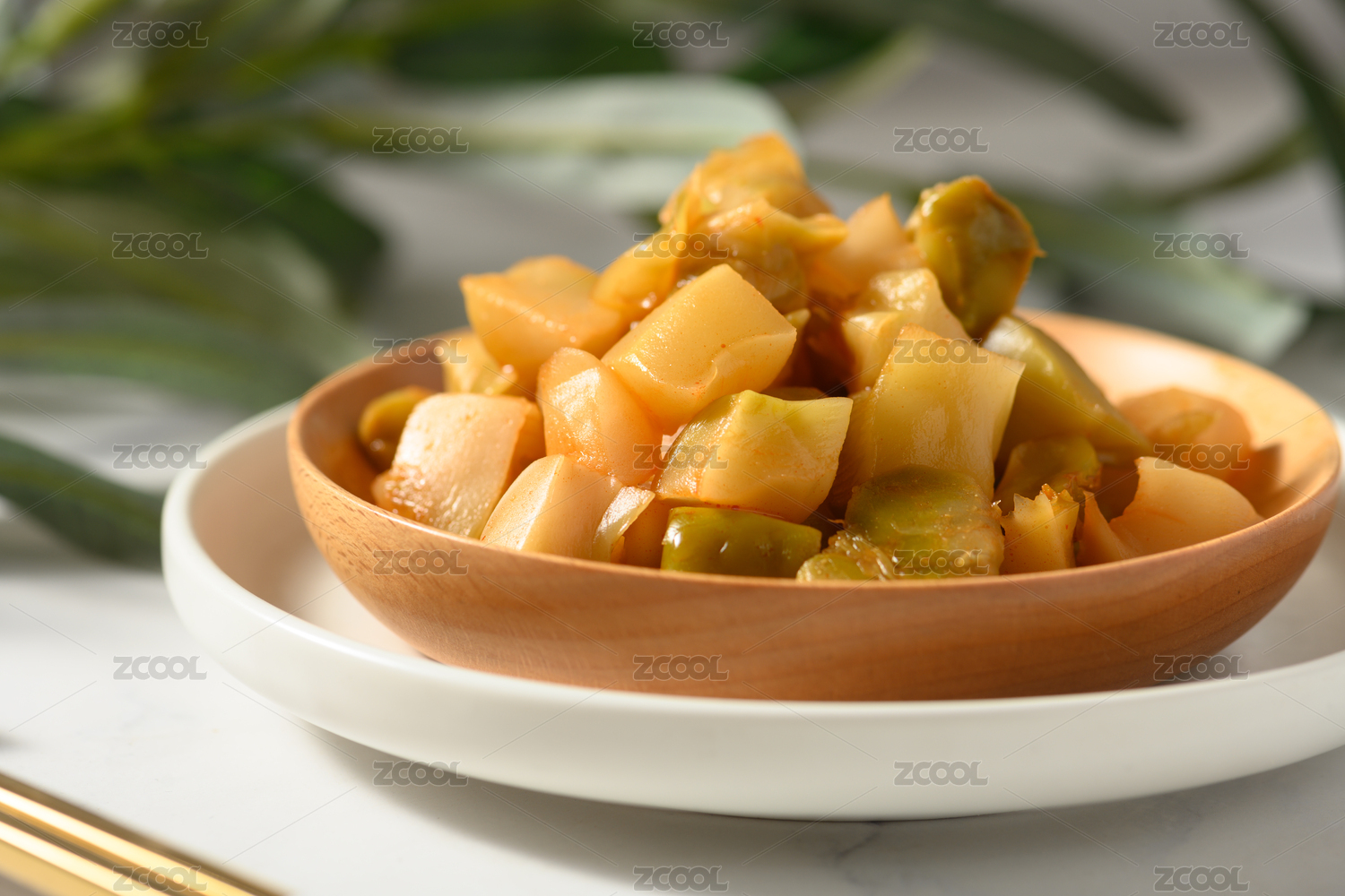 桌面上的木紋盤(pán)子里的美味可口的榨菜芯
