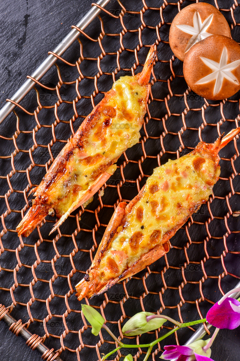 兩只黃色芝士焗大蝦放在烤網上
