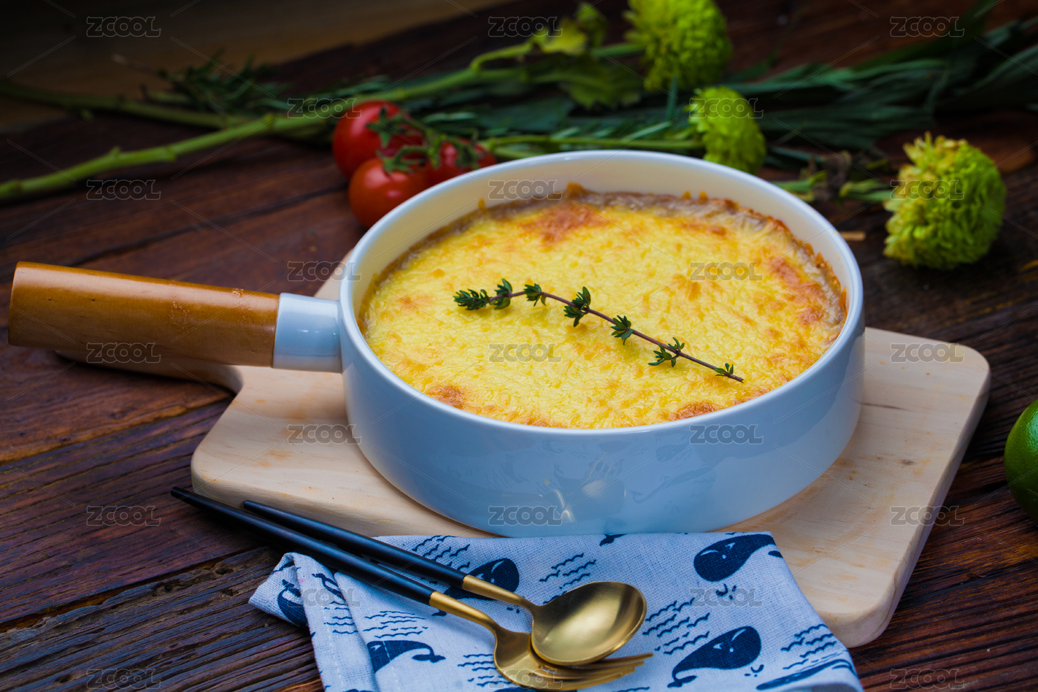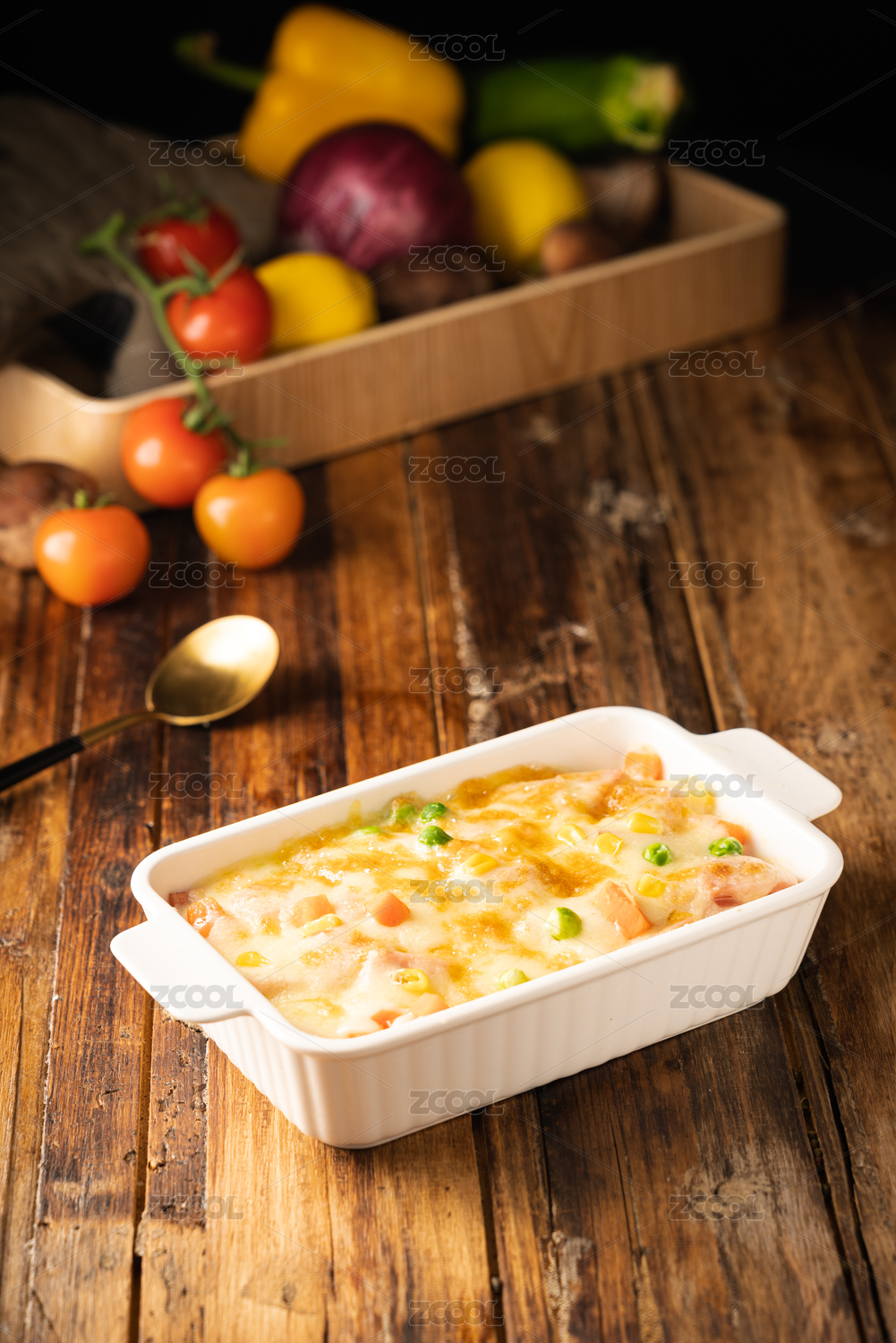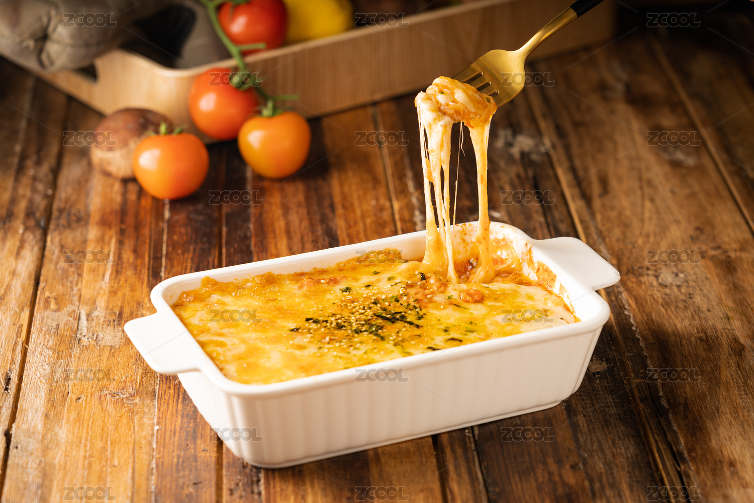 木質桌子上的一份芝士焗飯
