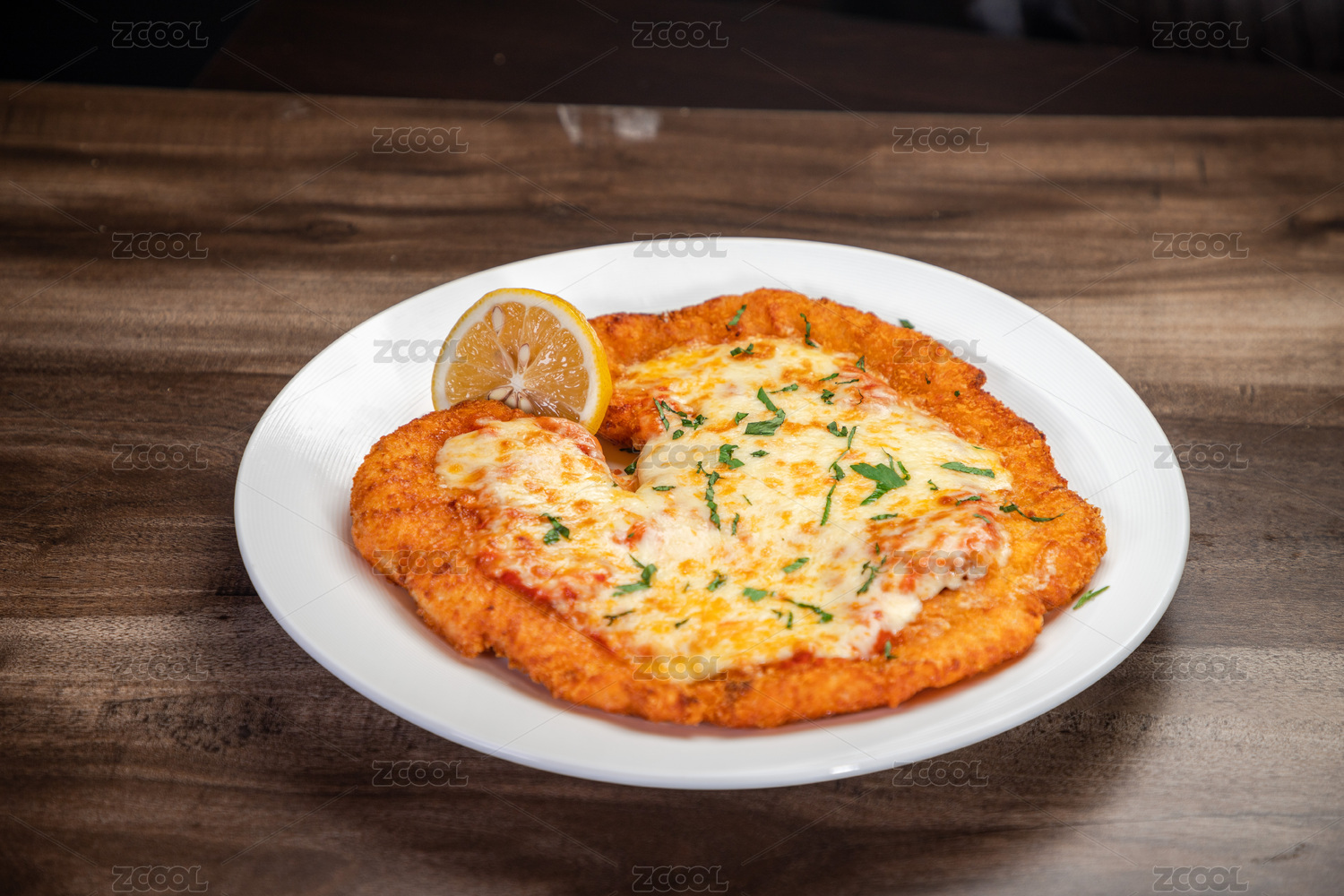 棕色木紋桌上放著一盤意大利風味芝士雞排