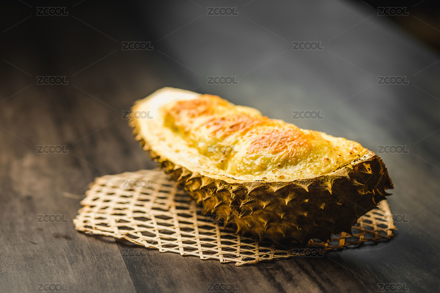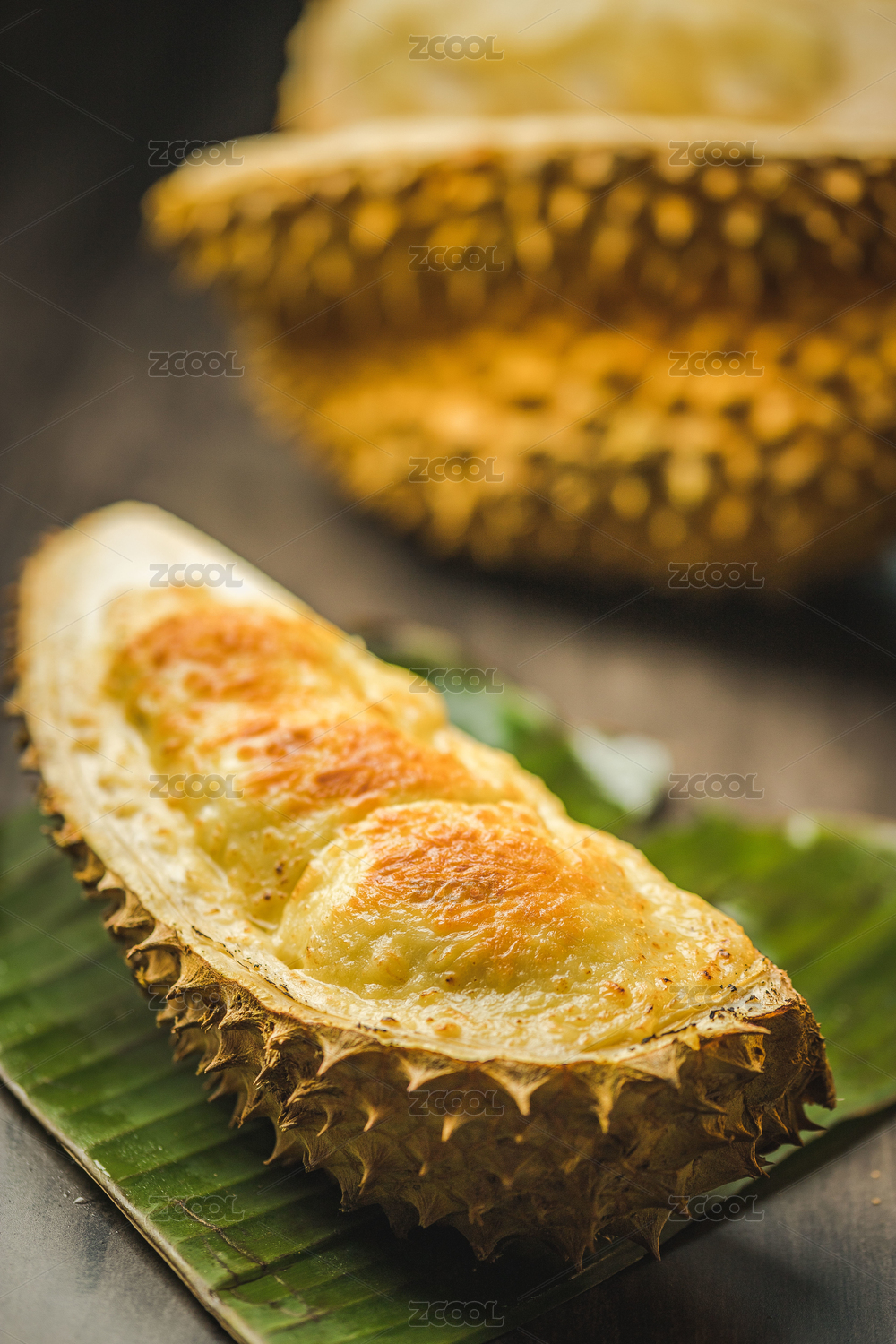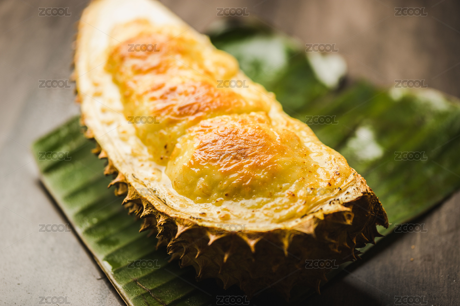 暗色木紋桌面上放著一份馬蘇里拉芝士焗榴蓮