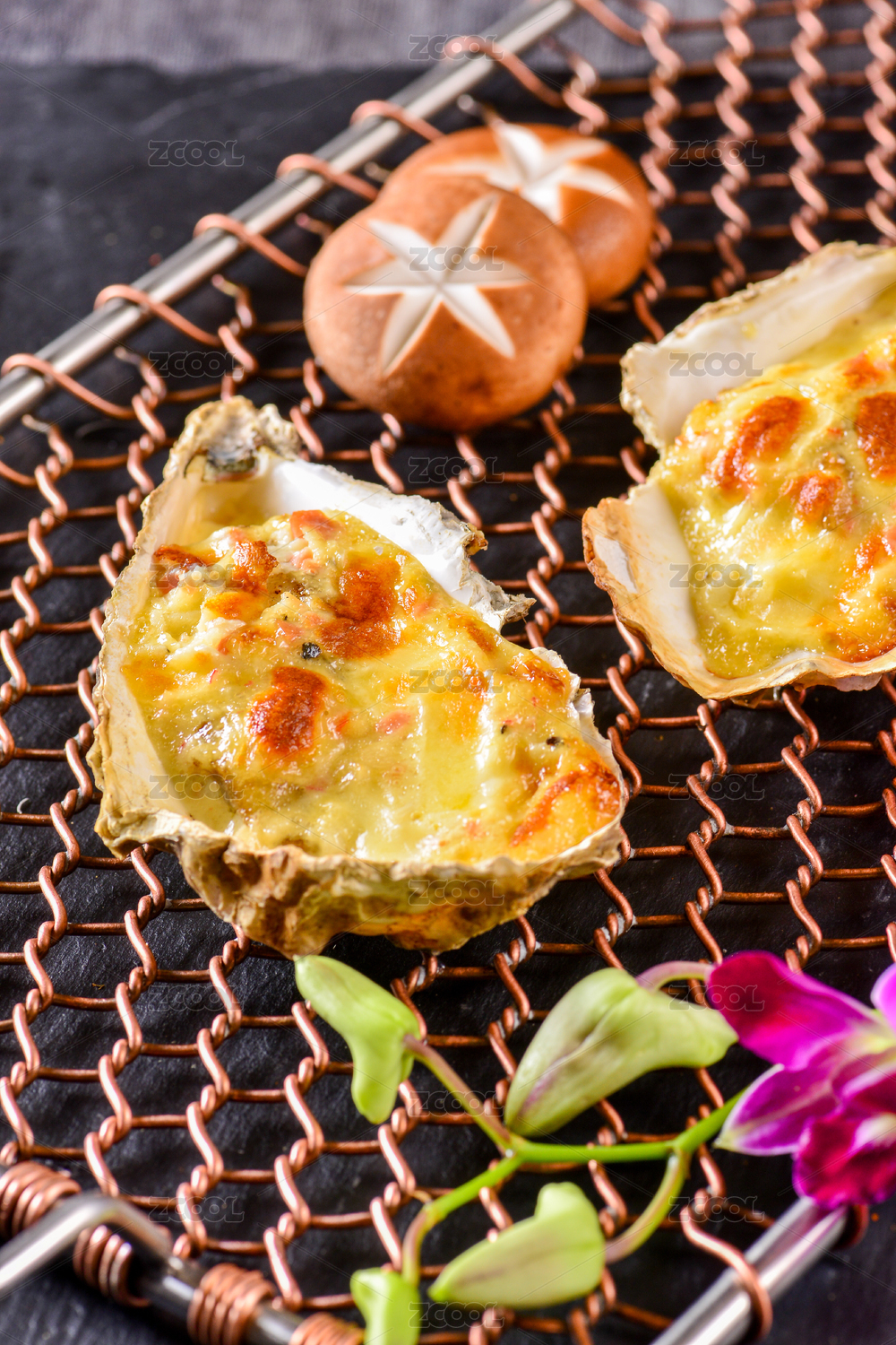 兩個芝士焗生蠔放在鐵網烤盤上