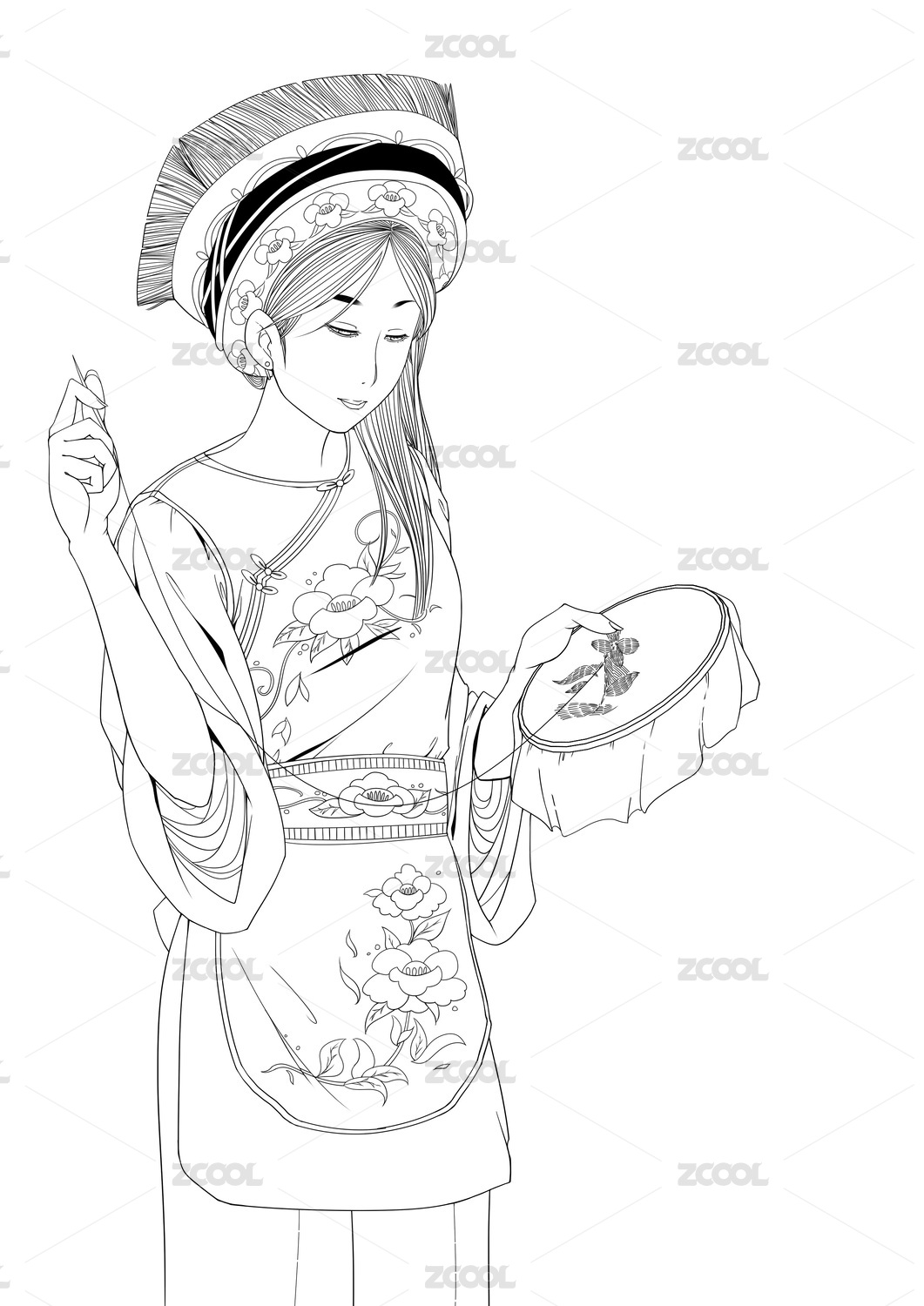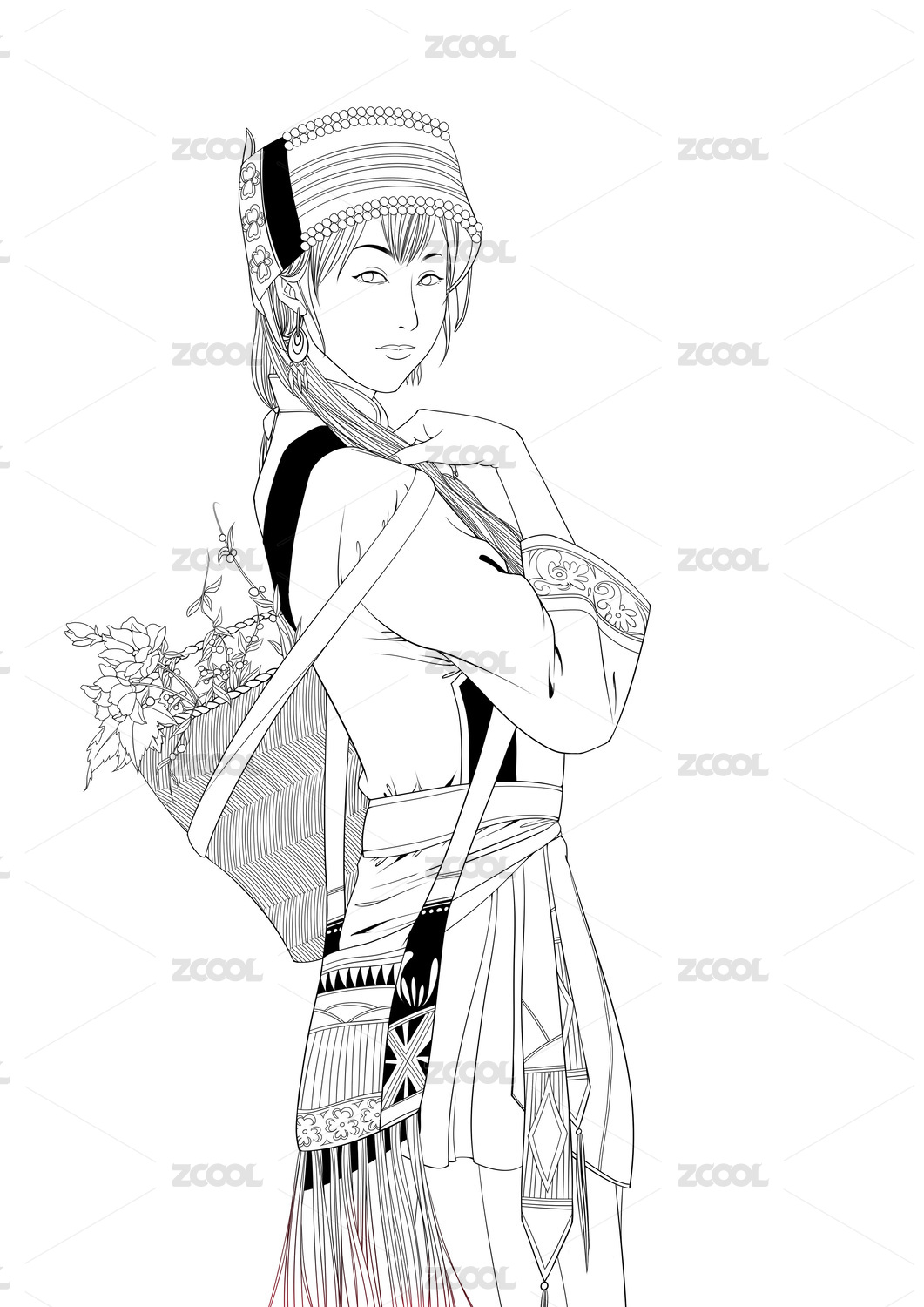 彝族民族女性工筆線條人物插畫(huà)