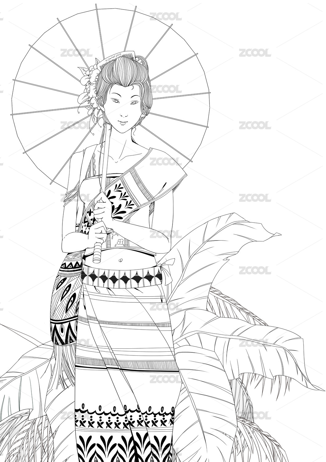 傣族民族女性工筆線條人物插畫(huà)