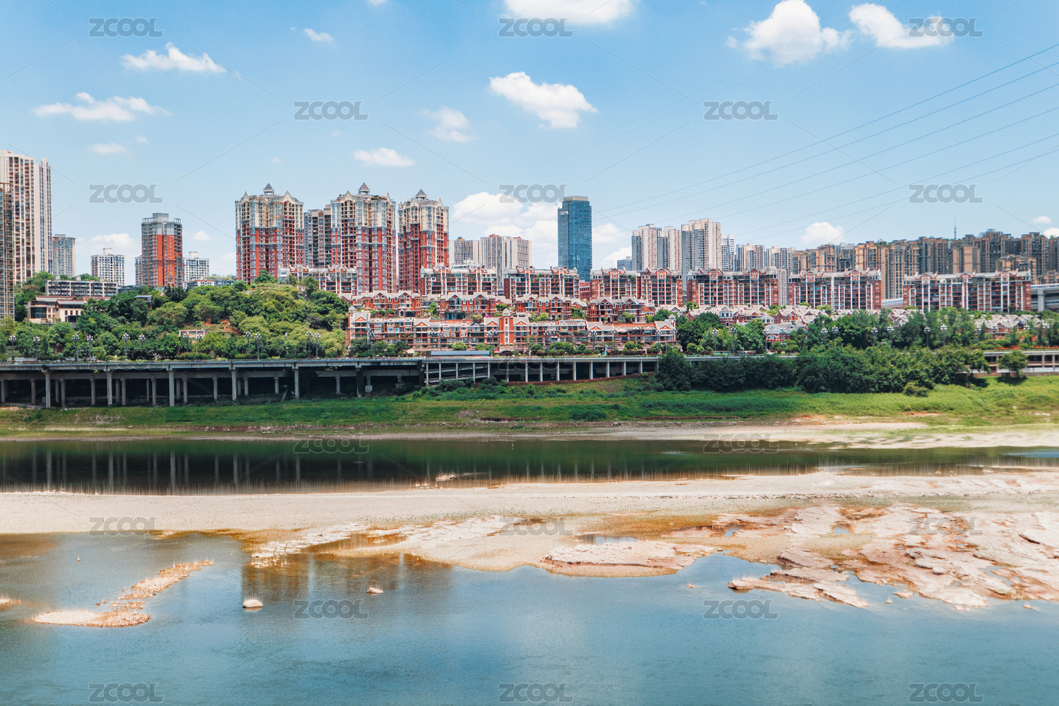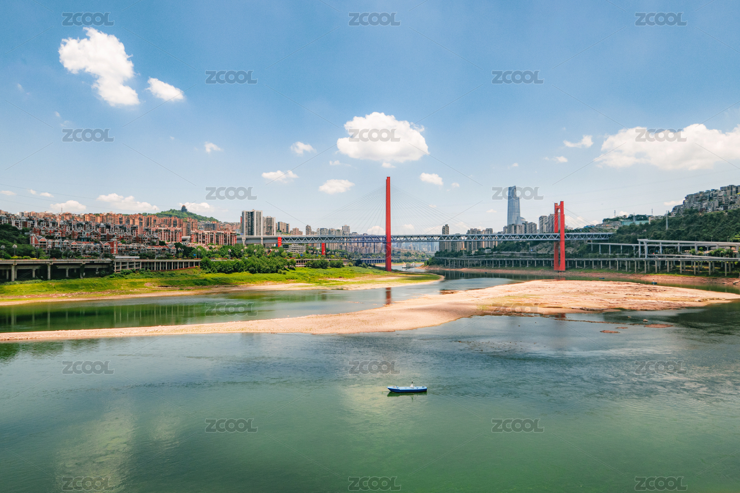 晴朗天空下的重慶沙濱路江景與城景