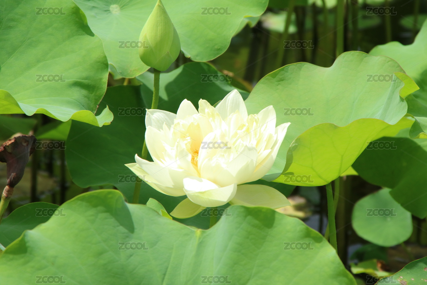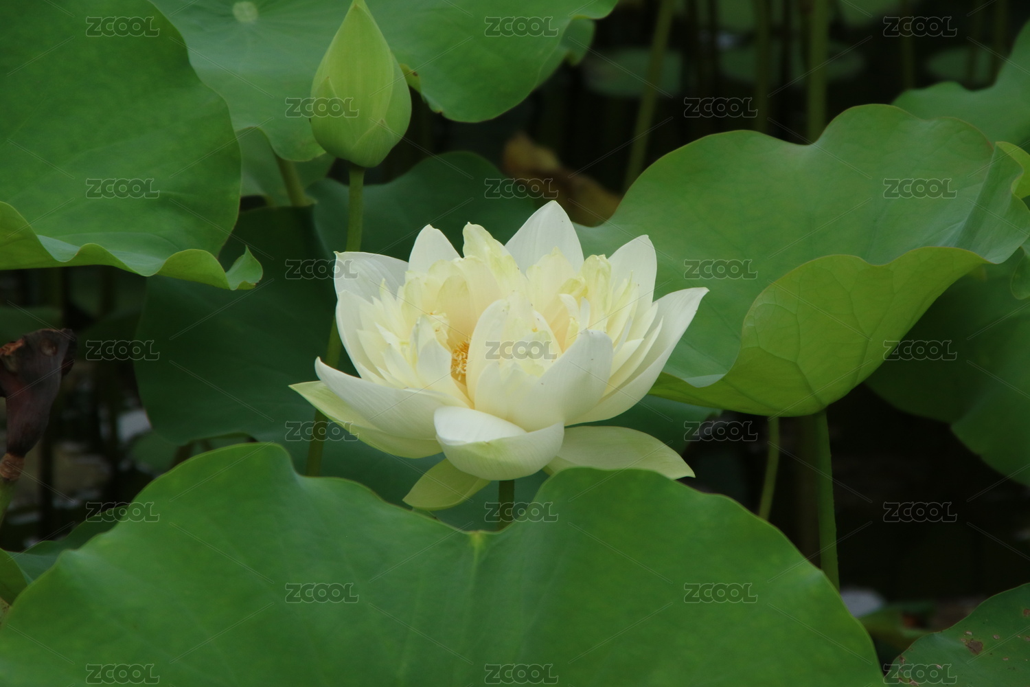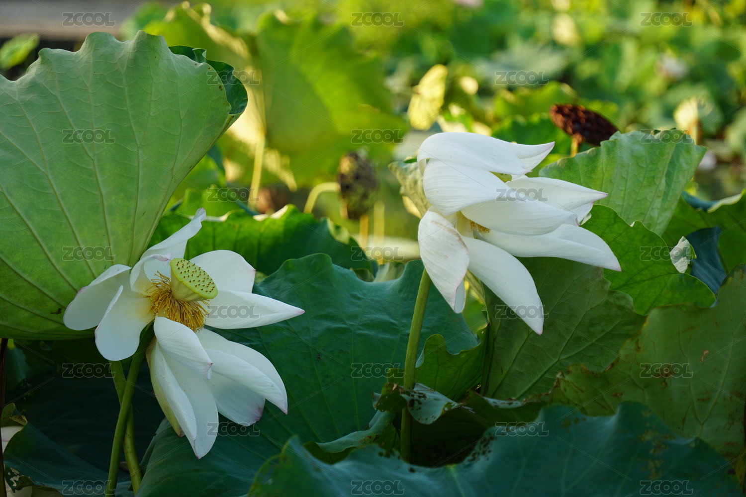 蓮葉中一朵盛開(kāi)的帶有蓮蓬的白蓮花