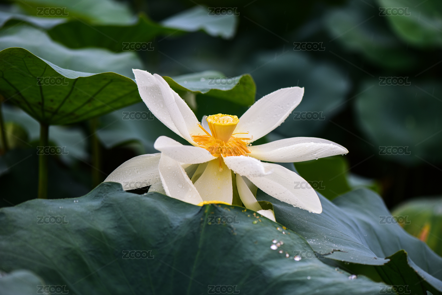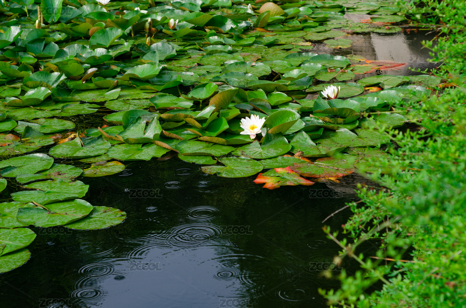 夏天雨天,池塘里盛開(kāi)著白蓮花