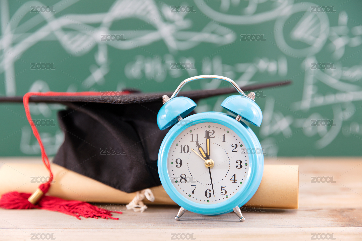 黑板前的博士帽和卷著的畢業(yè)證及一個鬧鐘