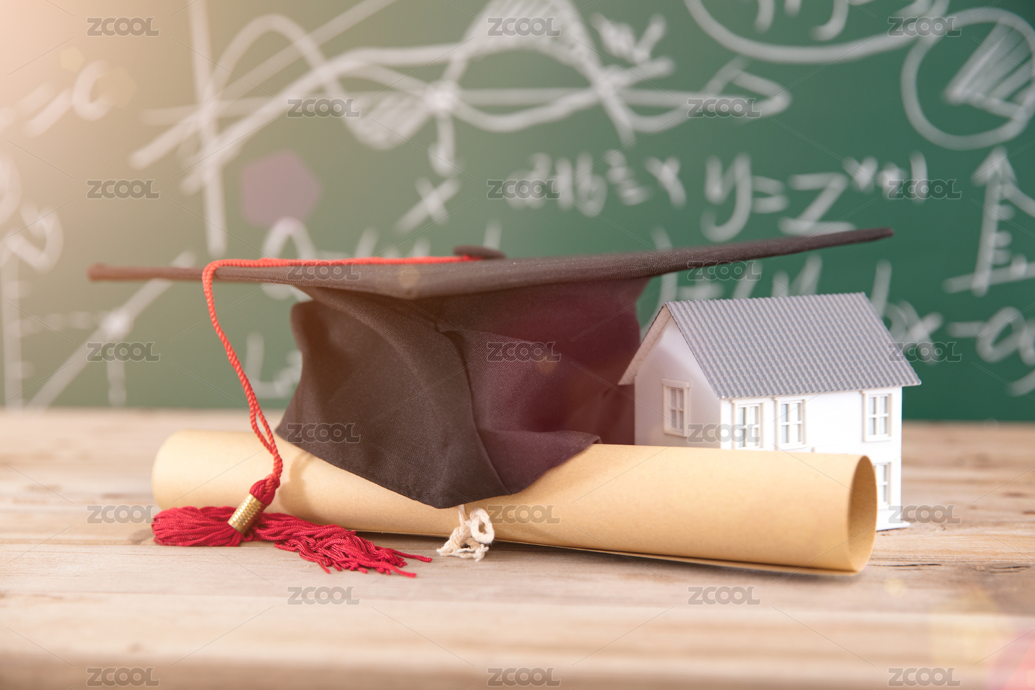 黑板前的博士帽和卷著的畢業(yè)證書及小房子模型