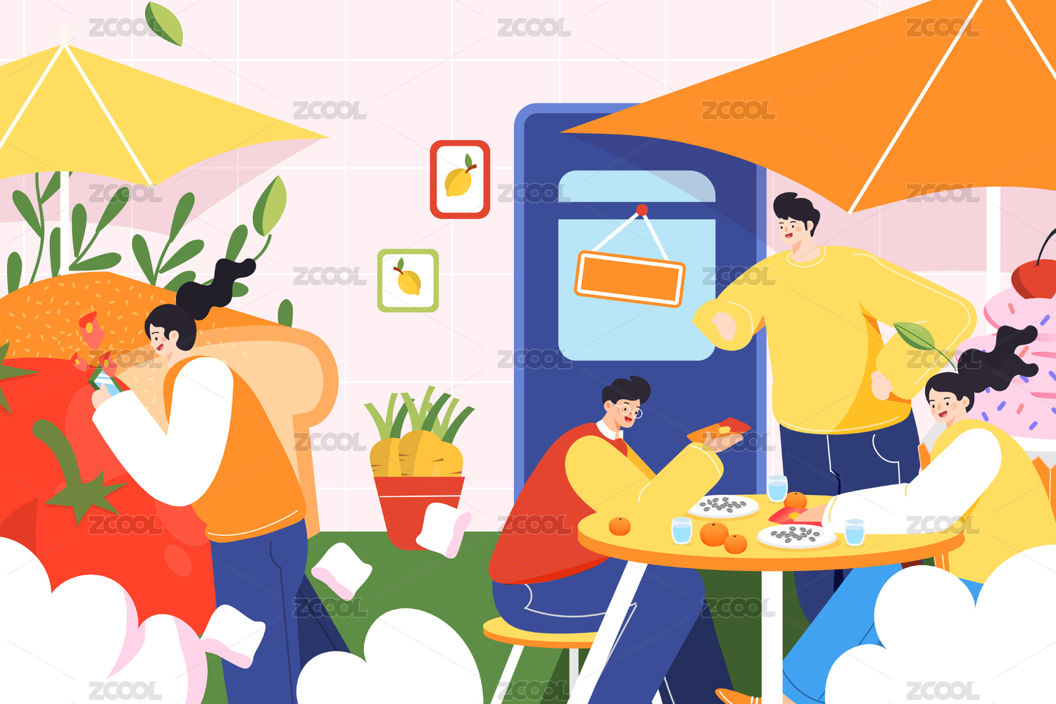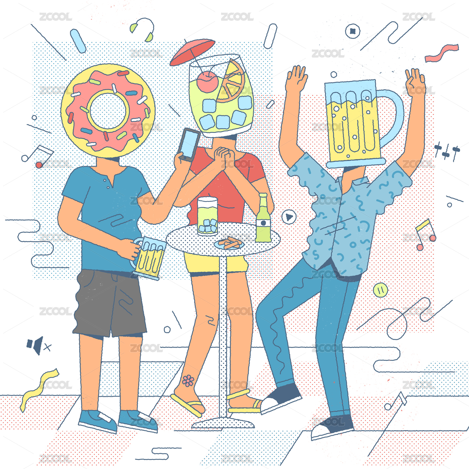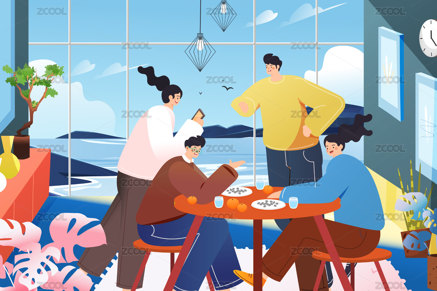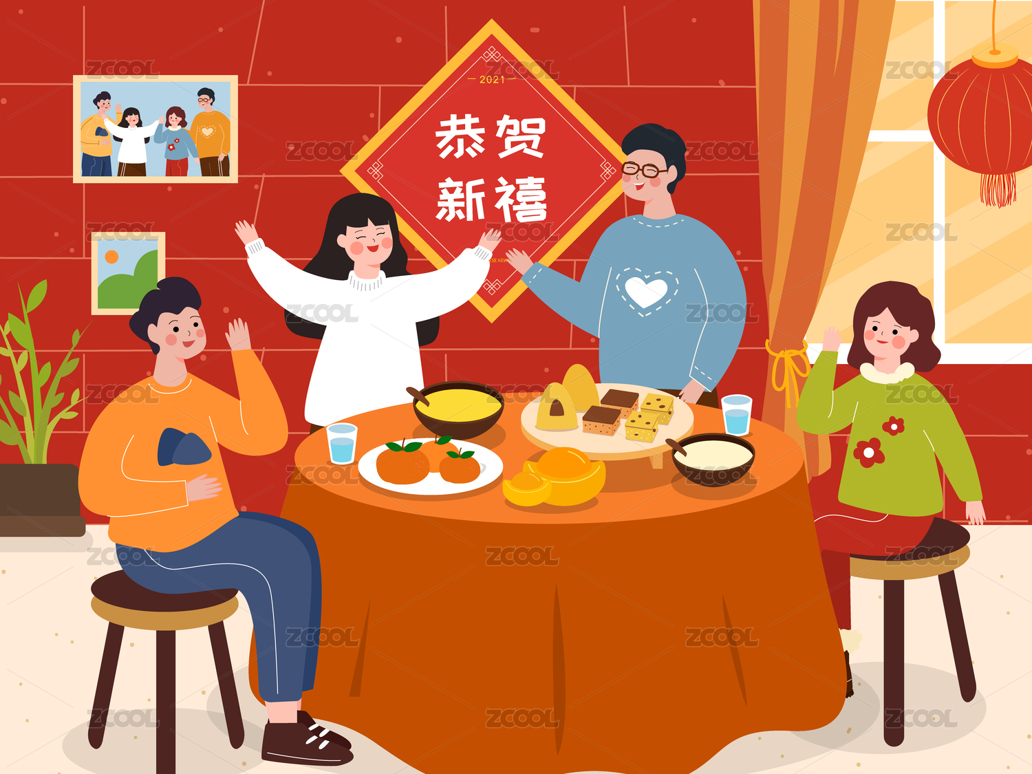 正月初四春節(jié)朋友聚會年俗插畫海報