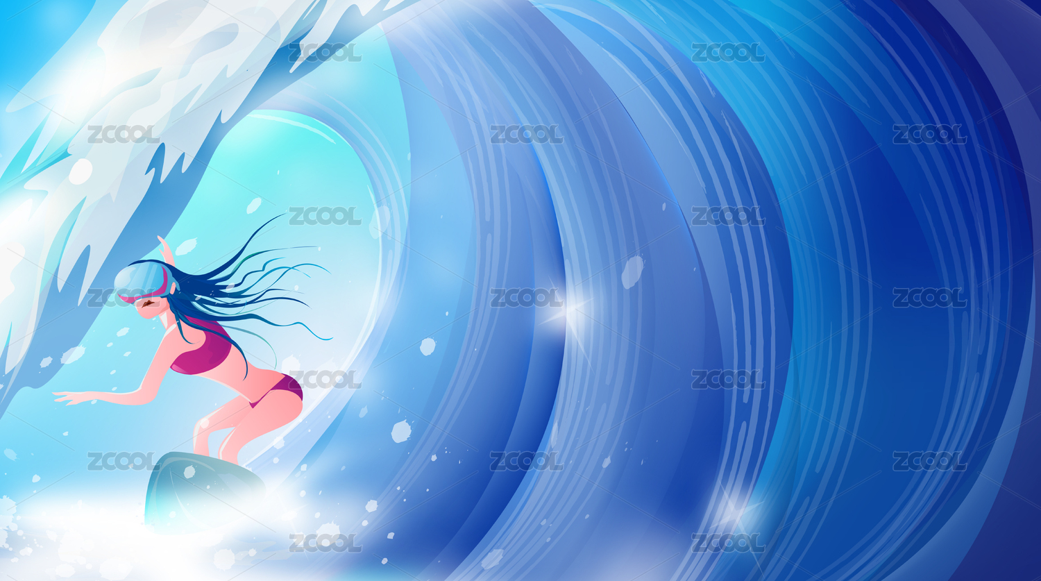 一個(gè)美少女在藍(lán)色大海中沖浪的唯美圖片