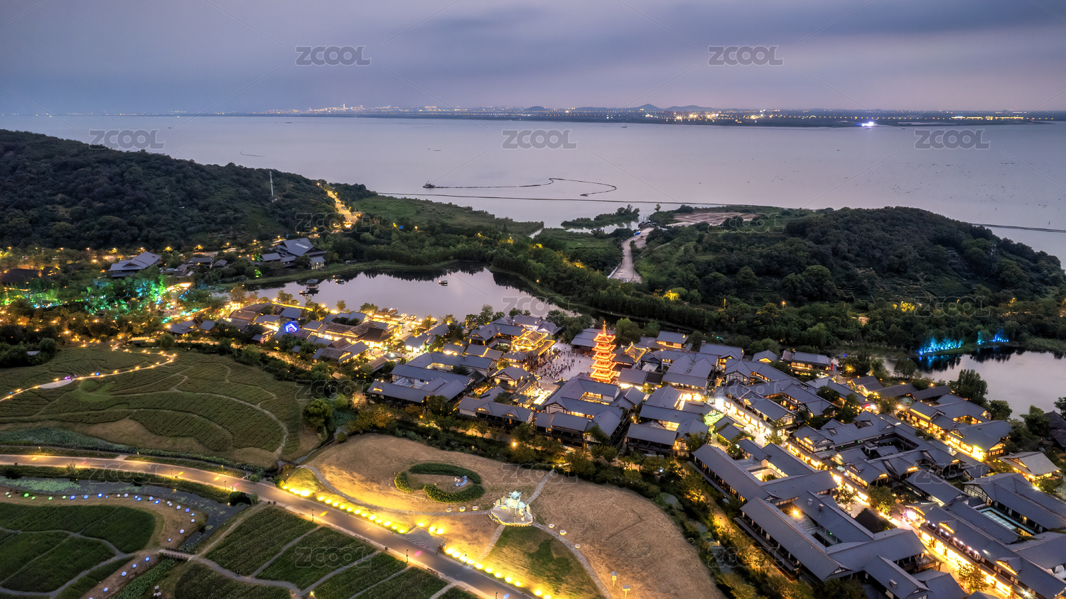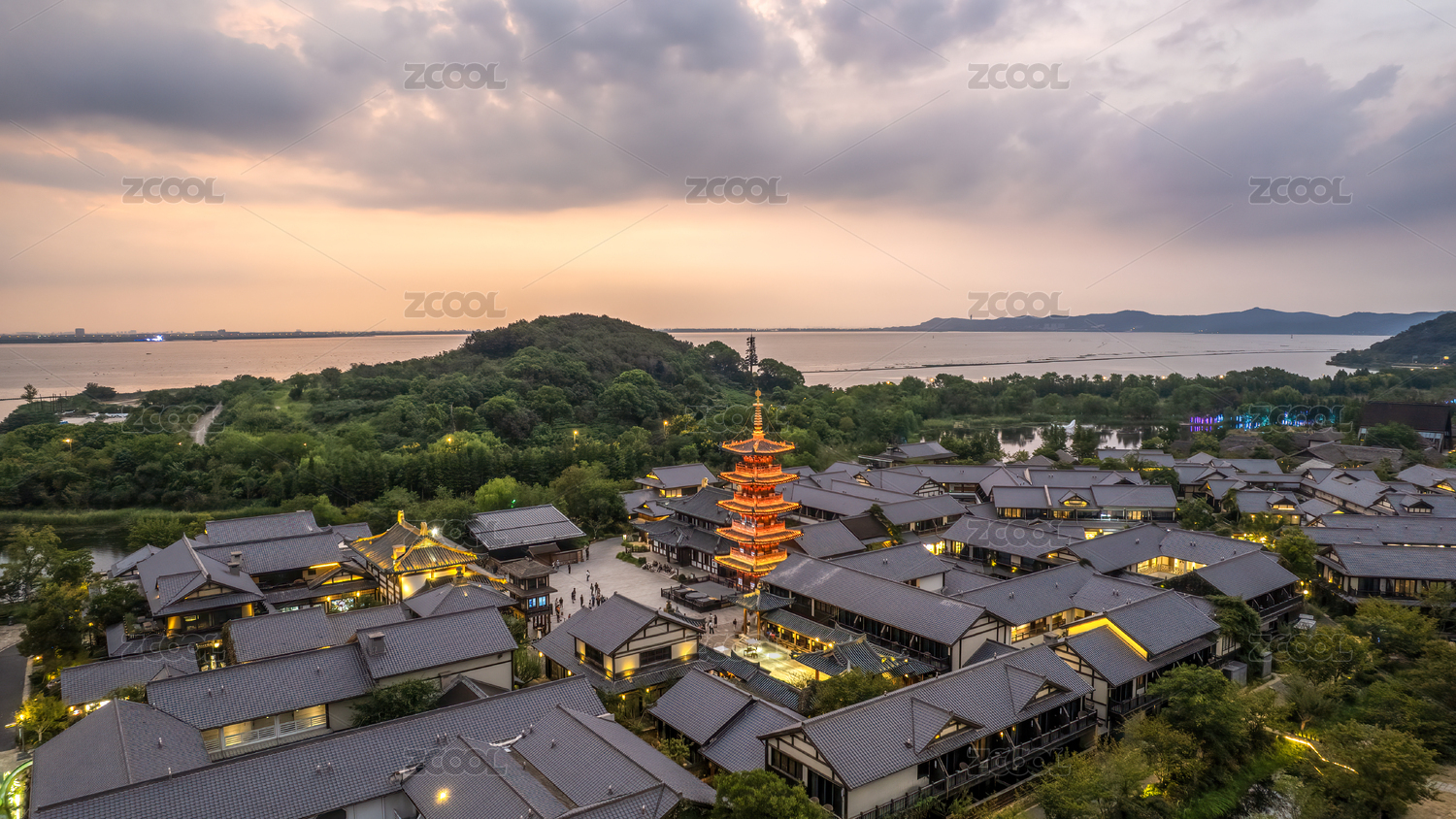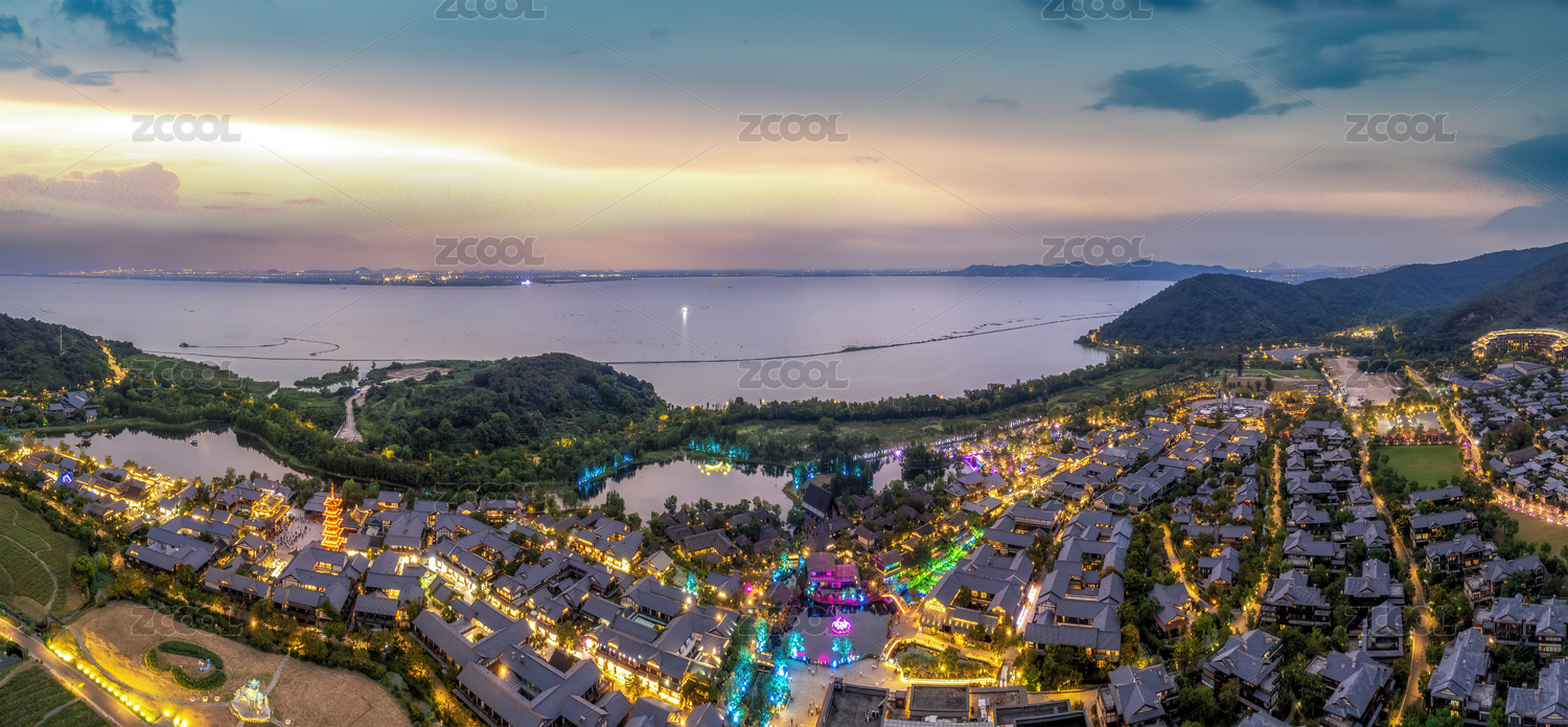 航拍無錫太湖湖畔拈花灣風情小鎮(zhèn)夜景