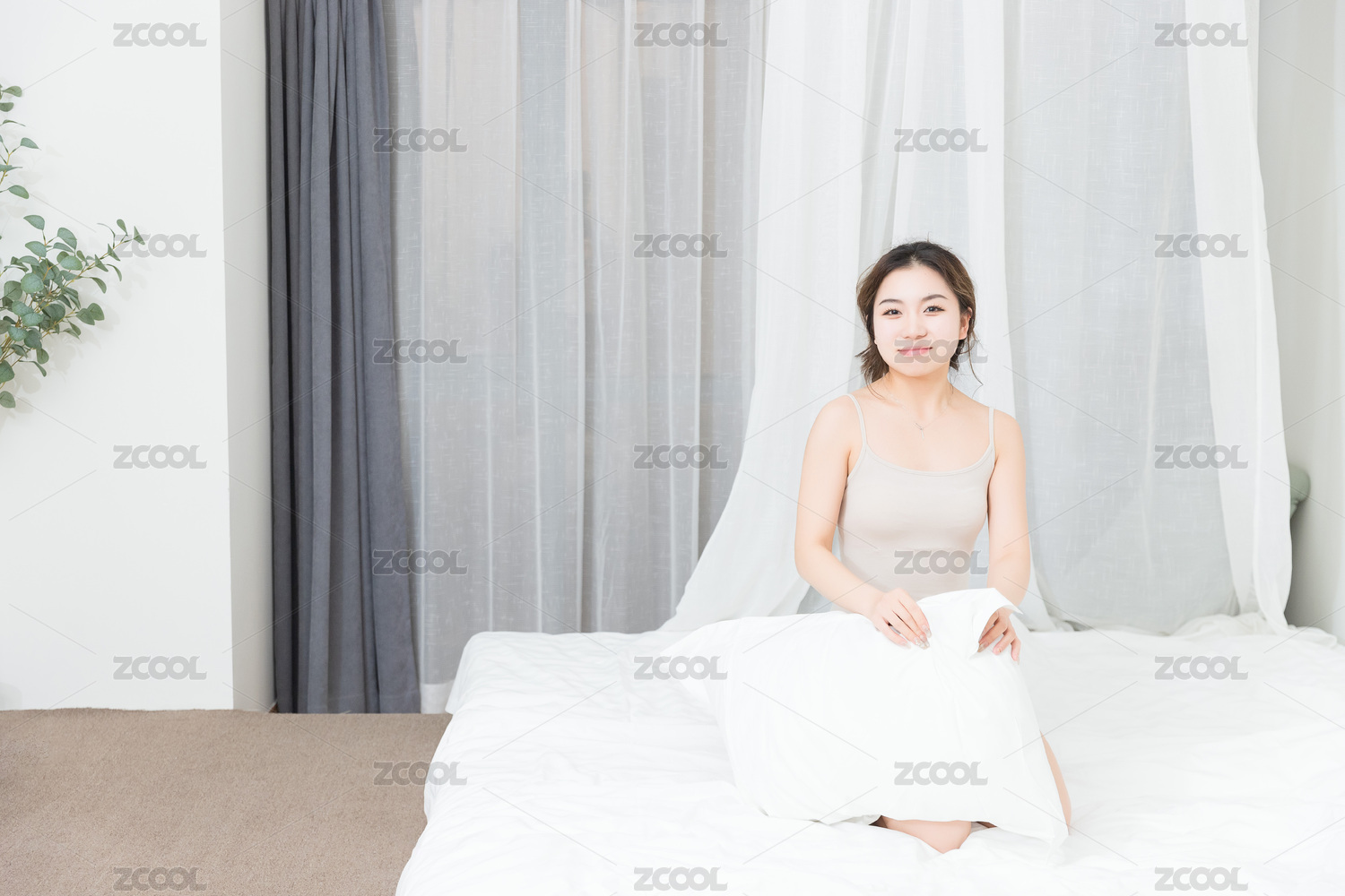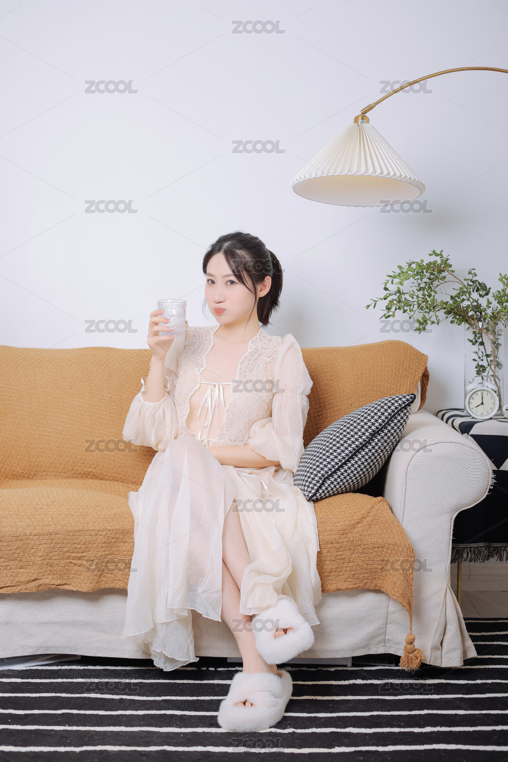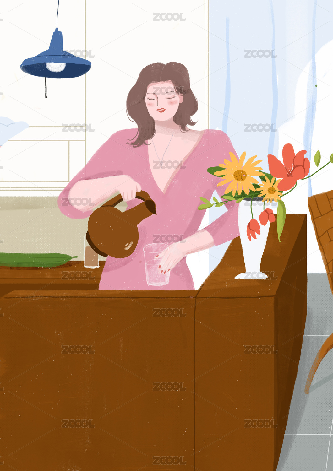 年輕女性端著水杯在廚房區(qū),美女,居家生活