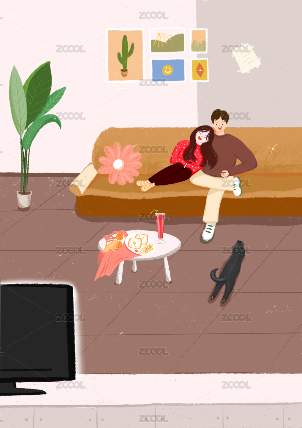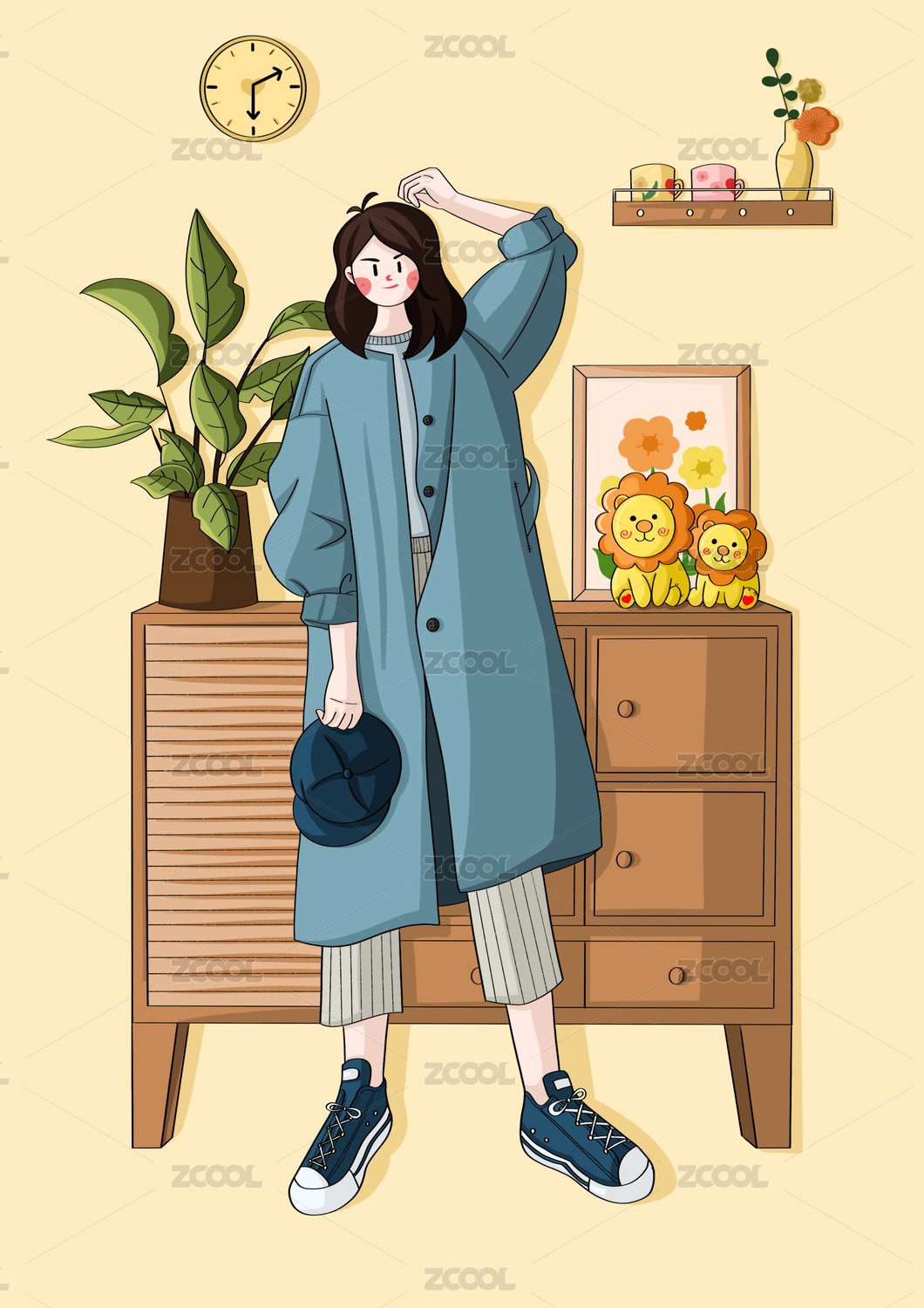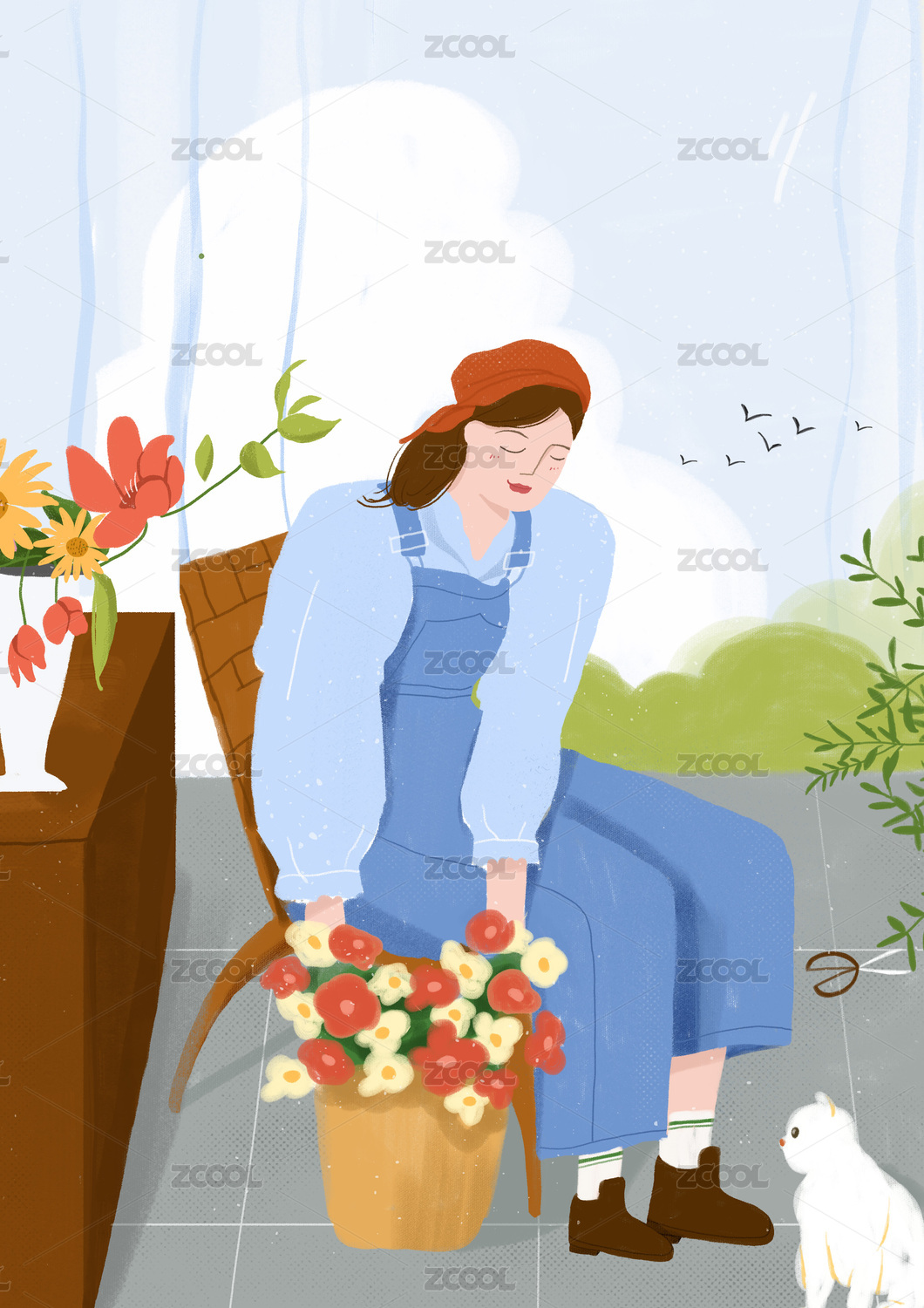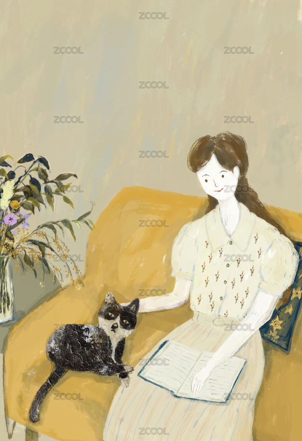 小清新居家生活擼貓喂貓吃馬卡龍的女孩插畫