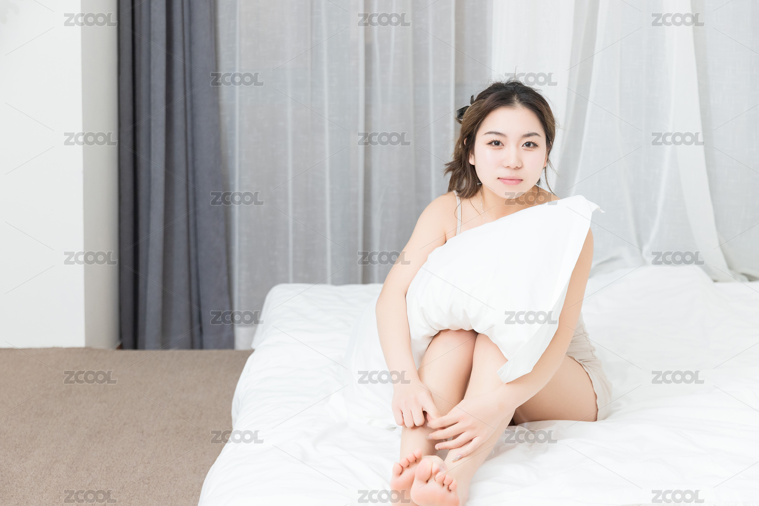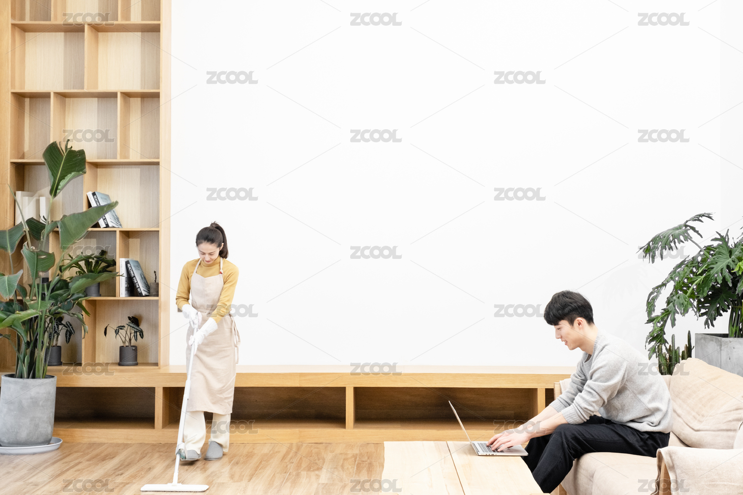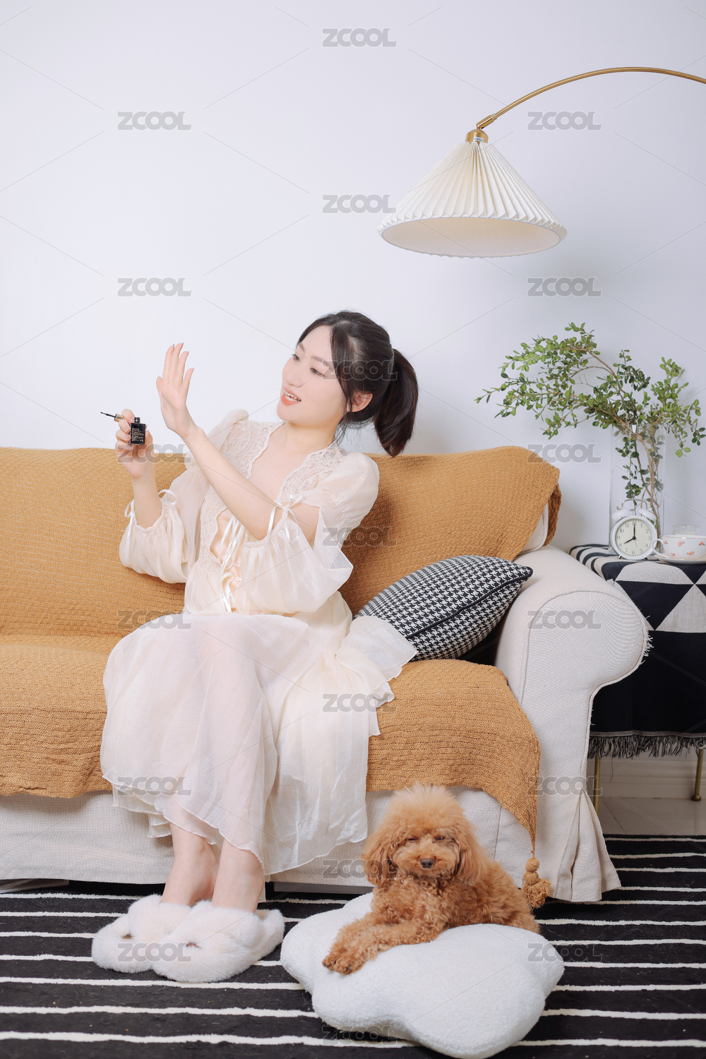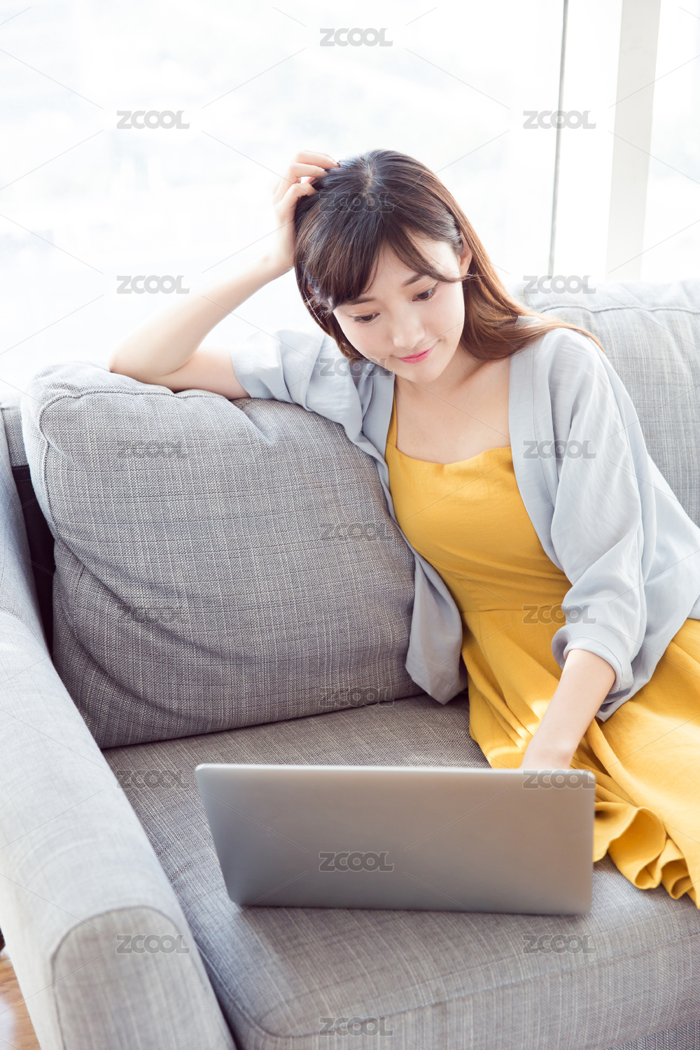 美女坐在沙發(fā)上使用筆記本電腦,居家生活