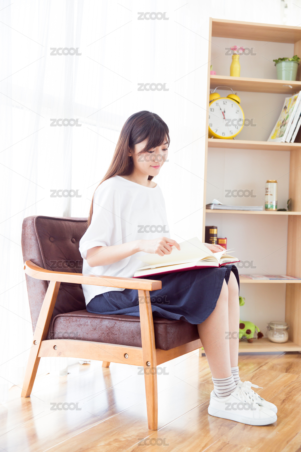 年輕女子坐在客廳椅子上看書學(xué)習(xí),居家生活
