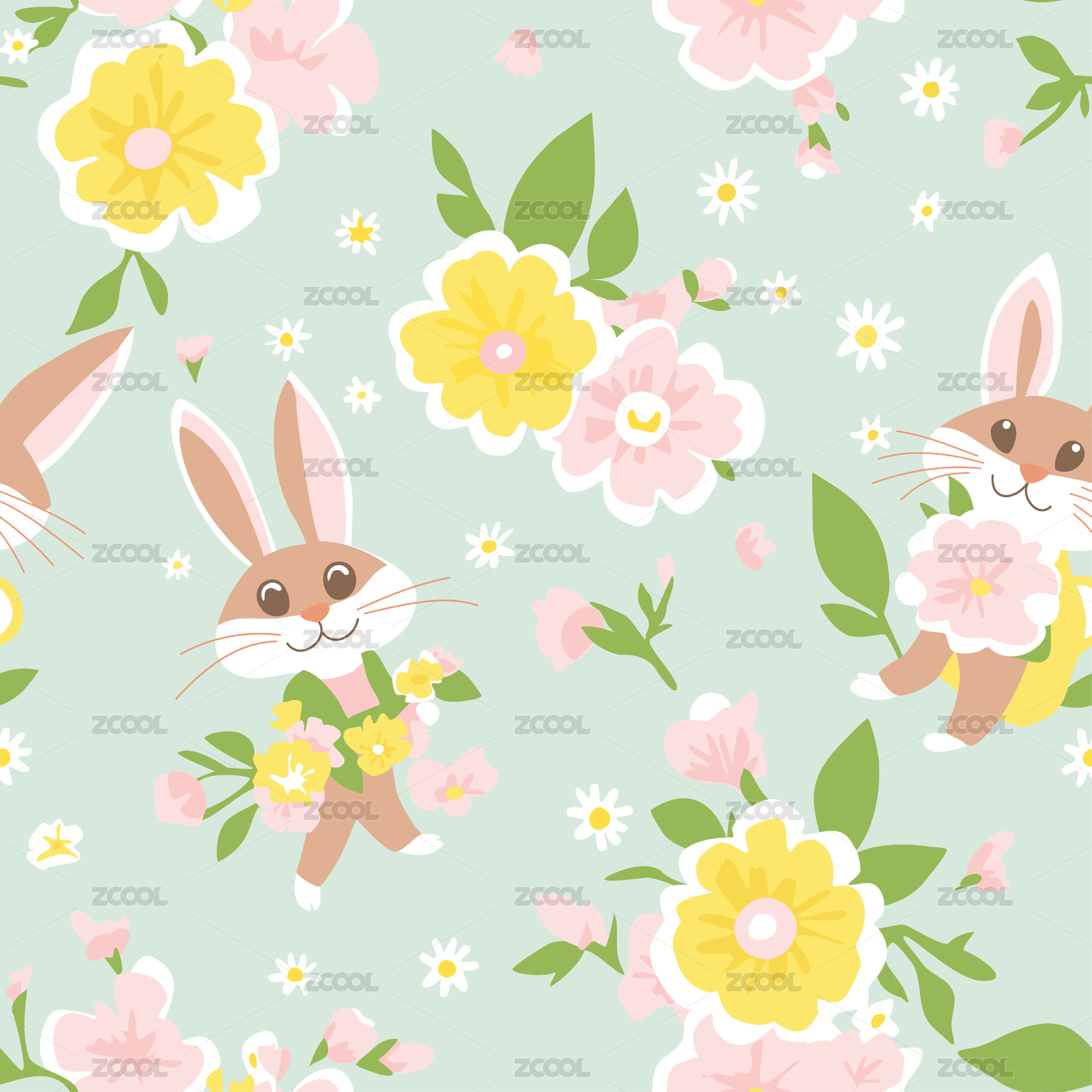 卡通兔子和粉色花朵四方連續(xù)童趣圖案
