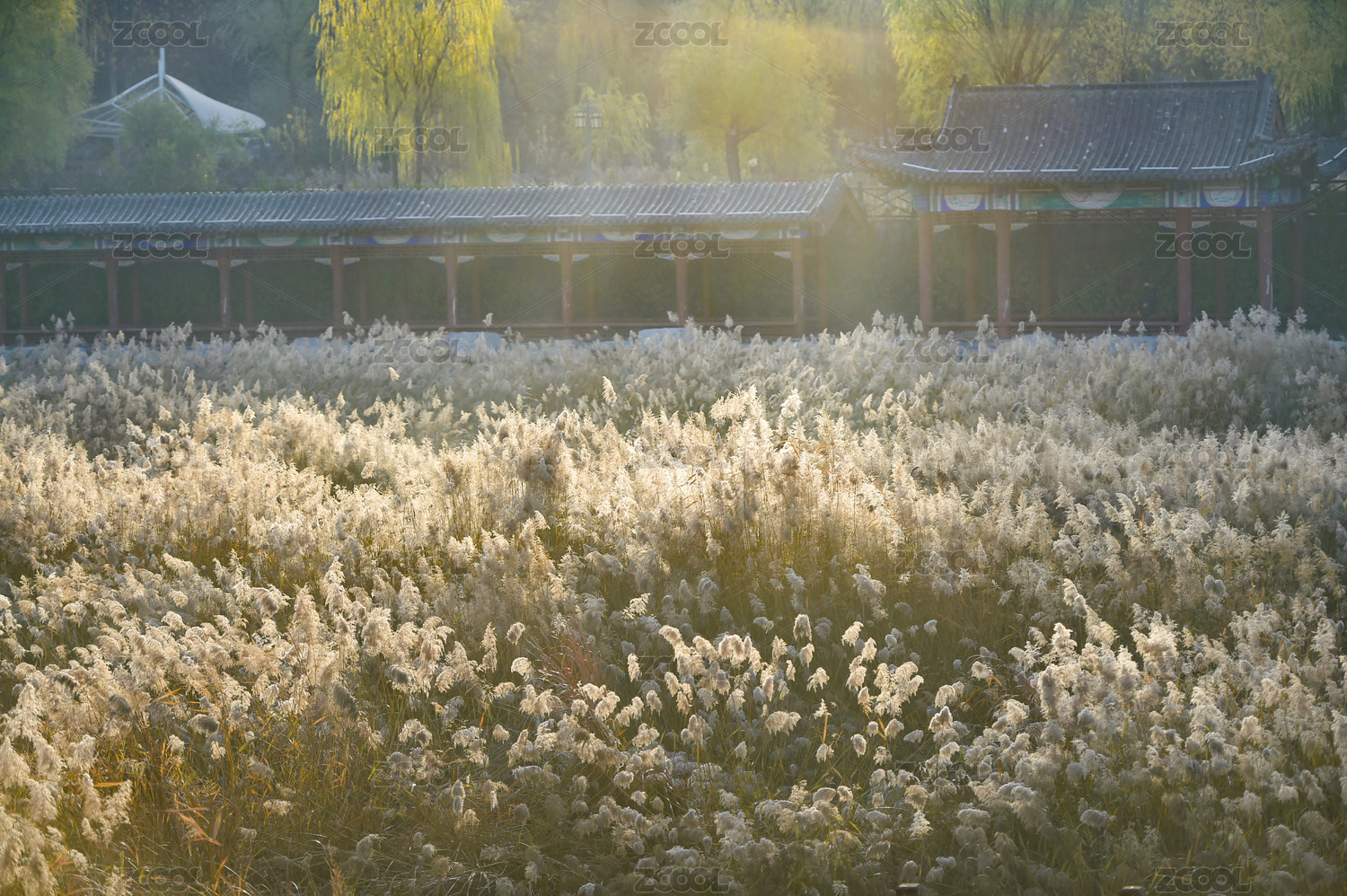秋天田野逆光下飛舞的蘆花