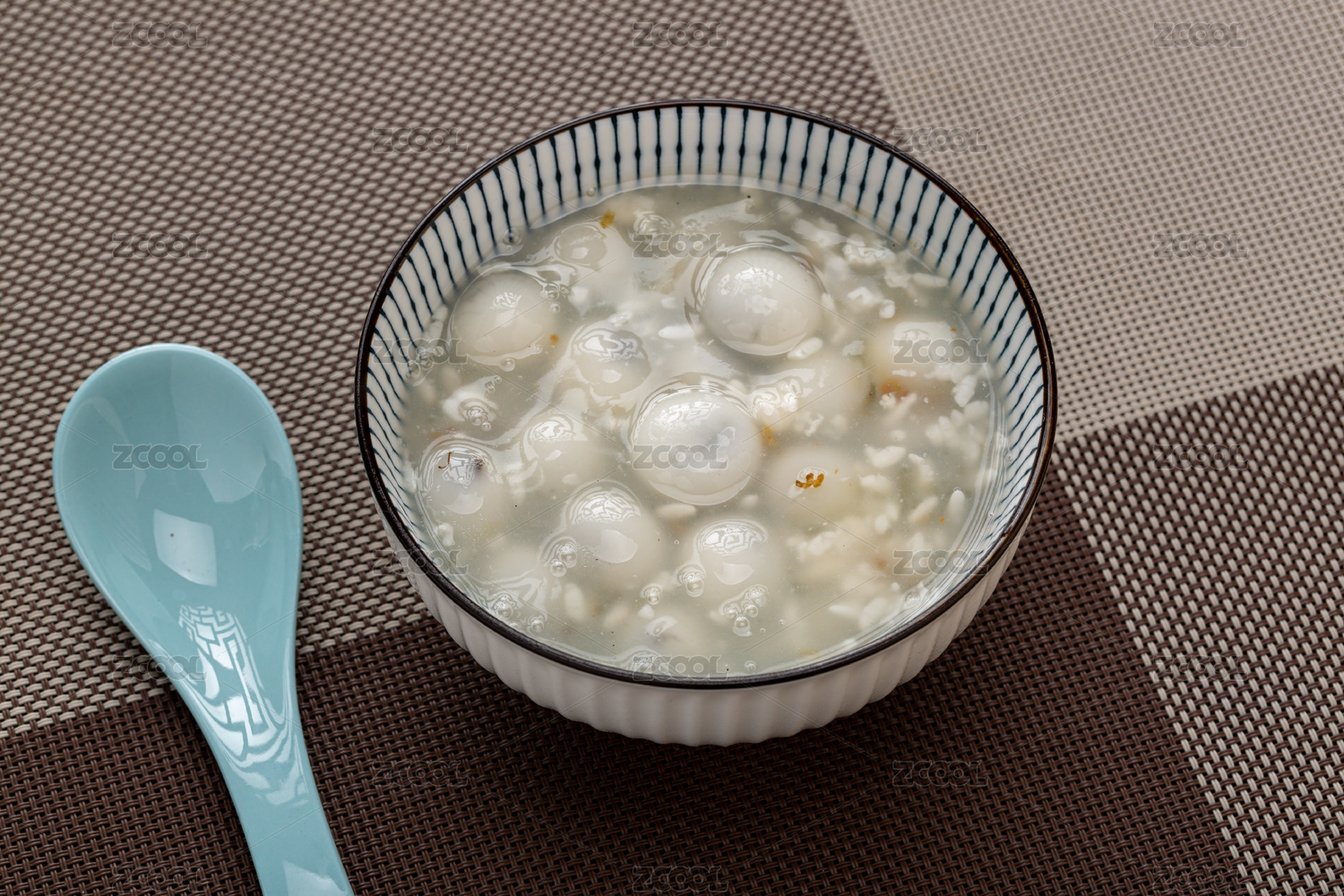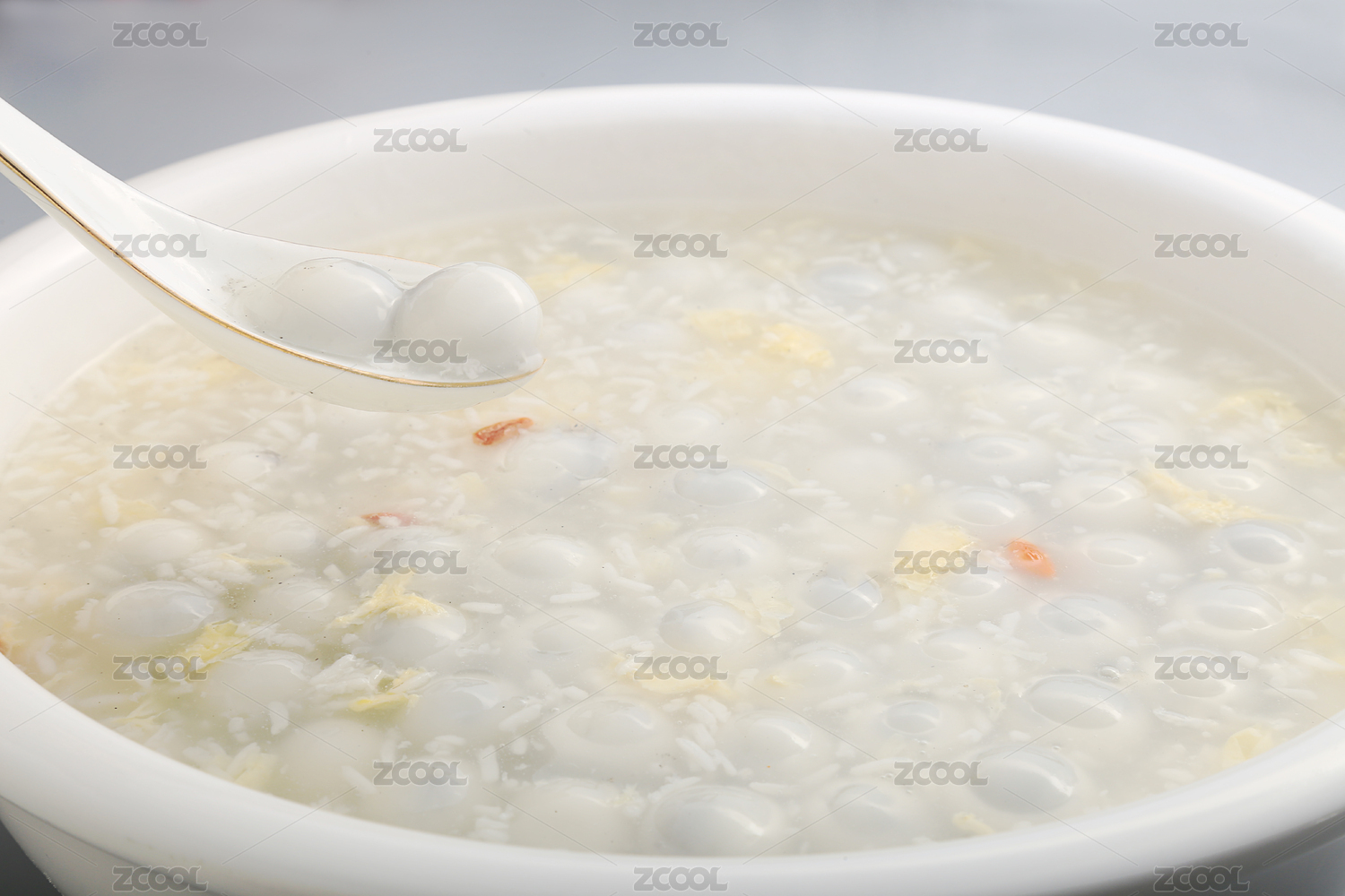灰色背景上白瓷湯碗里的米酒湯圓