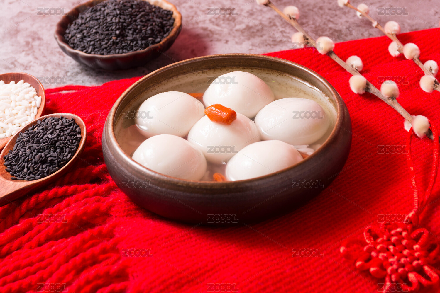用碗裝著的米酒湯圓放在紅色圍巾上