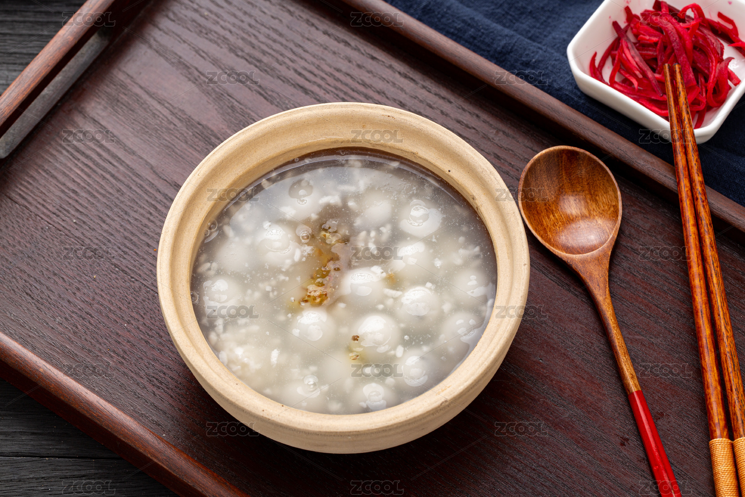 木托盤上的一碗桂花米酒湯圓,正在用湯匙舀