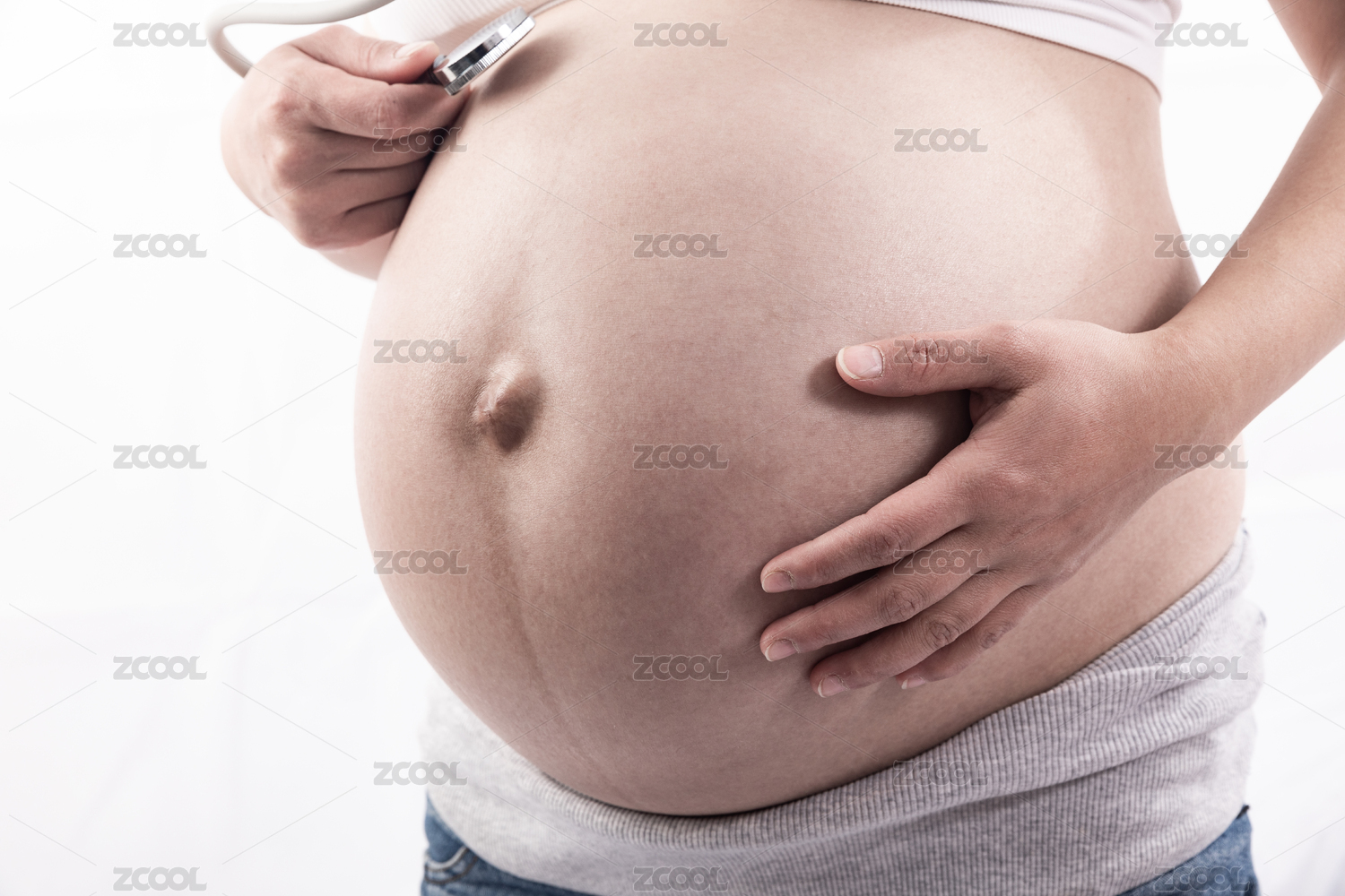 妊娠期的孕媽媽拿聽(tīng)診器聽(tīng)肚子中胎兒的心跳