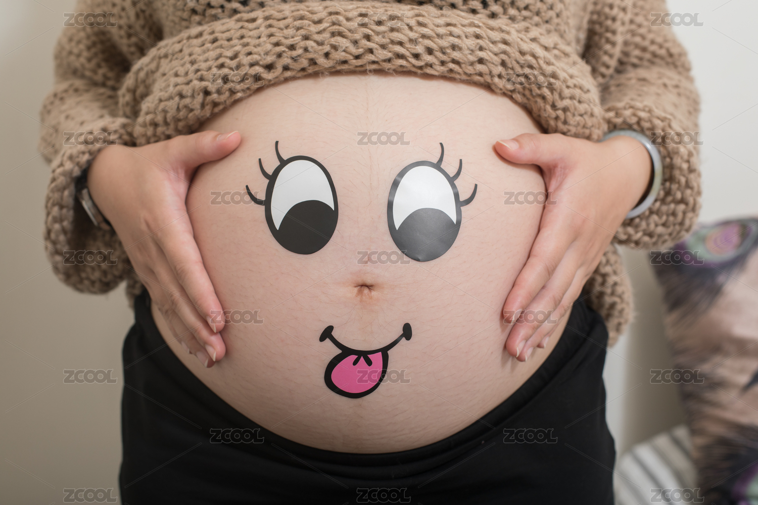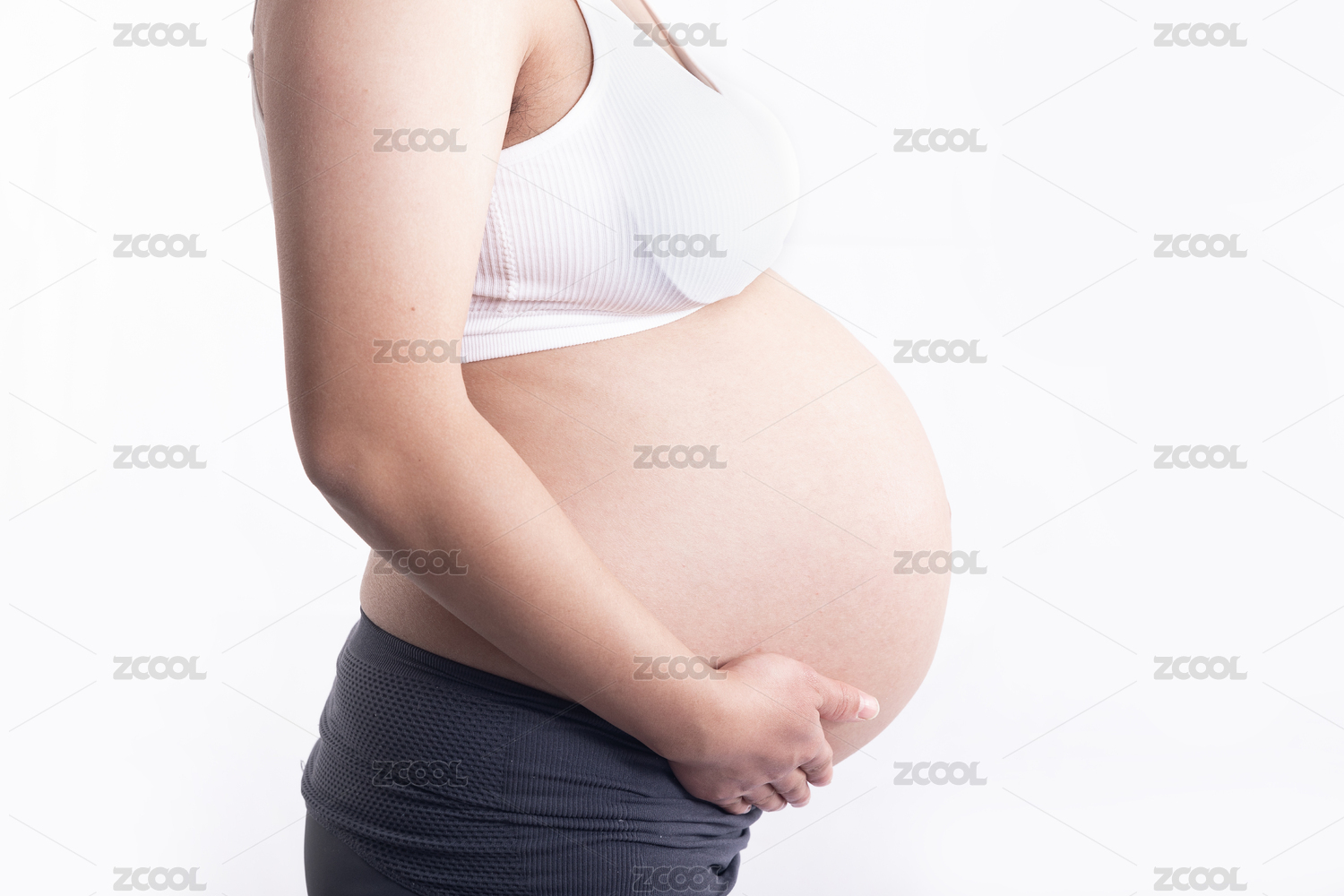 白色背景前挺著大肚子的孕婦用手扶著肚子