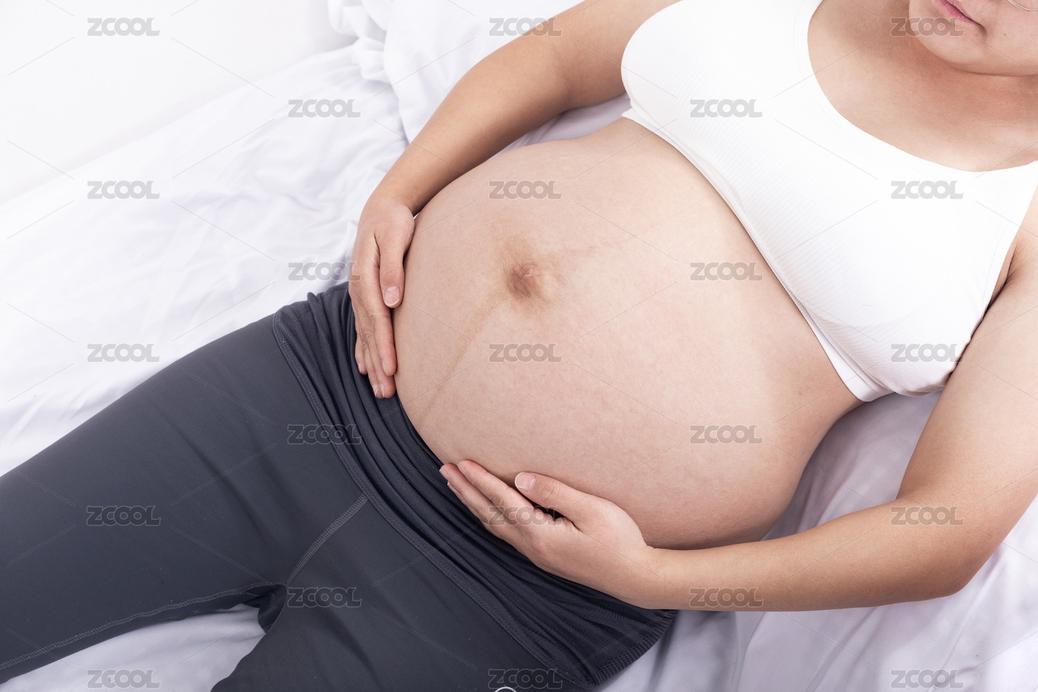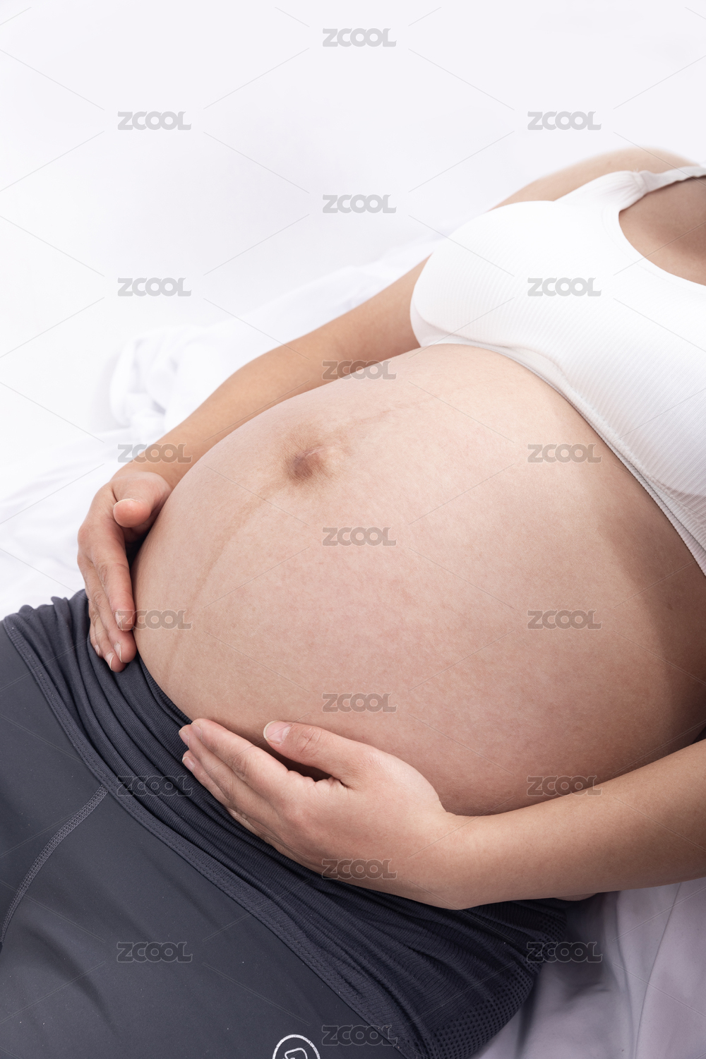 孕媽媽躺著用雙手扶著懷孕的大肚子