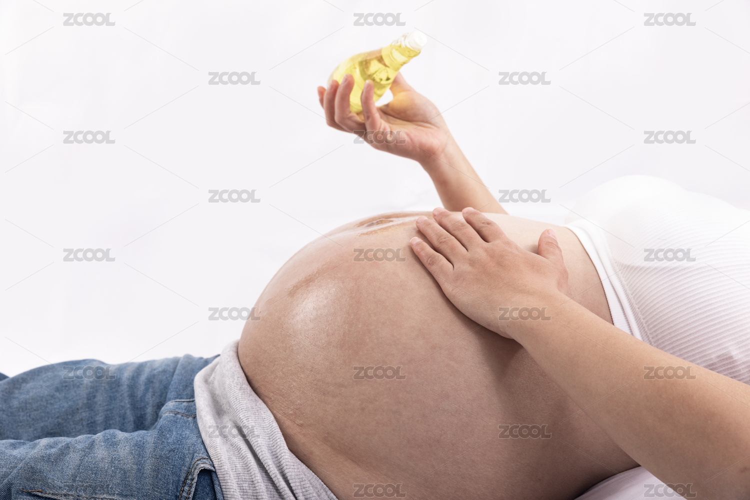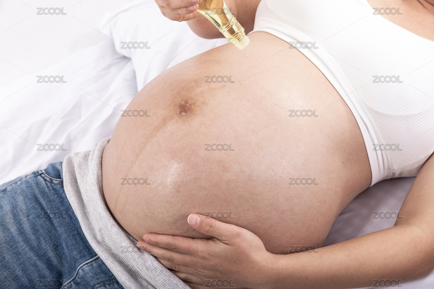 孕婦躺著一手拿著橄欖油給肚皮涂油去妊娠紋