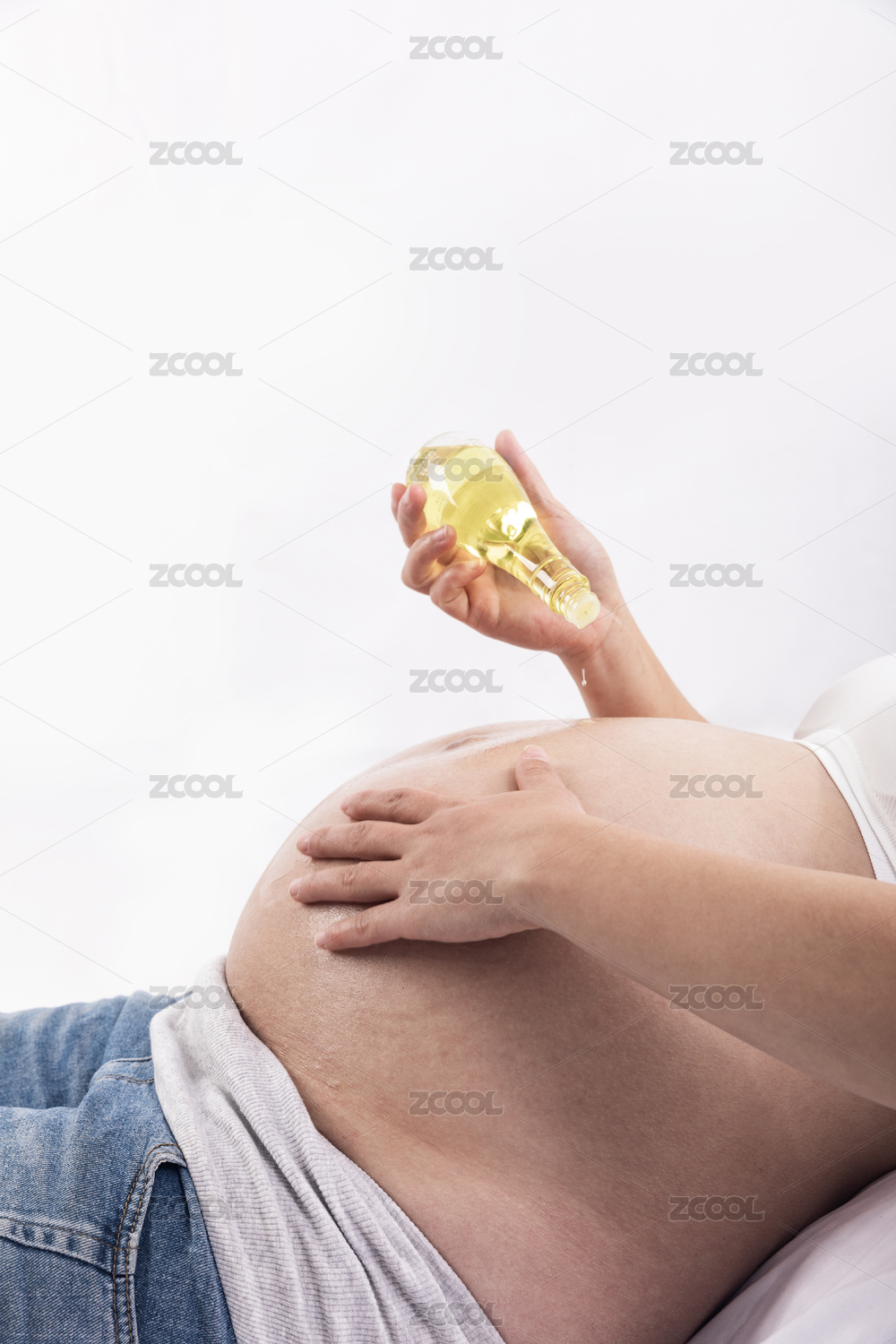 孕婦拿著橄欖油給肚皮涂油去除妊娠紋