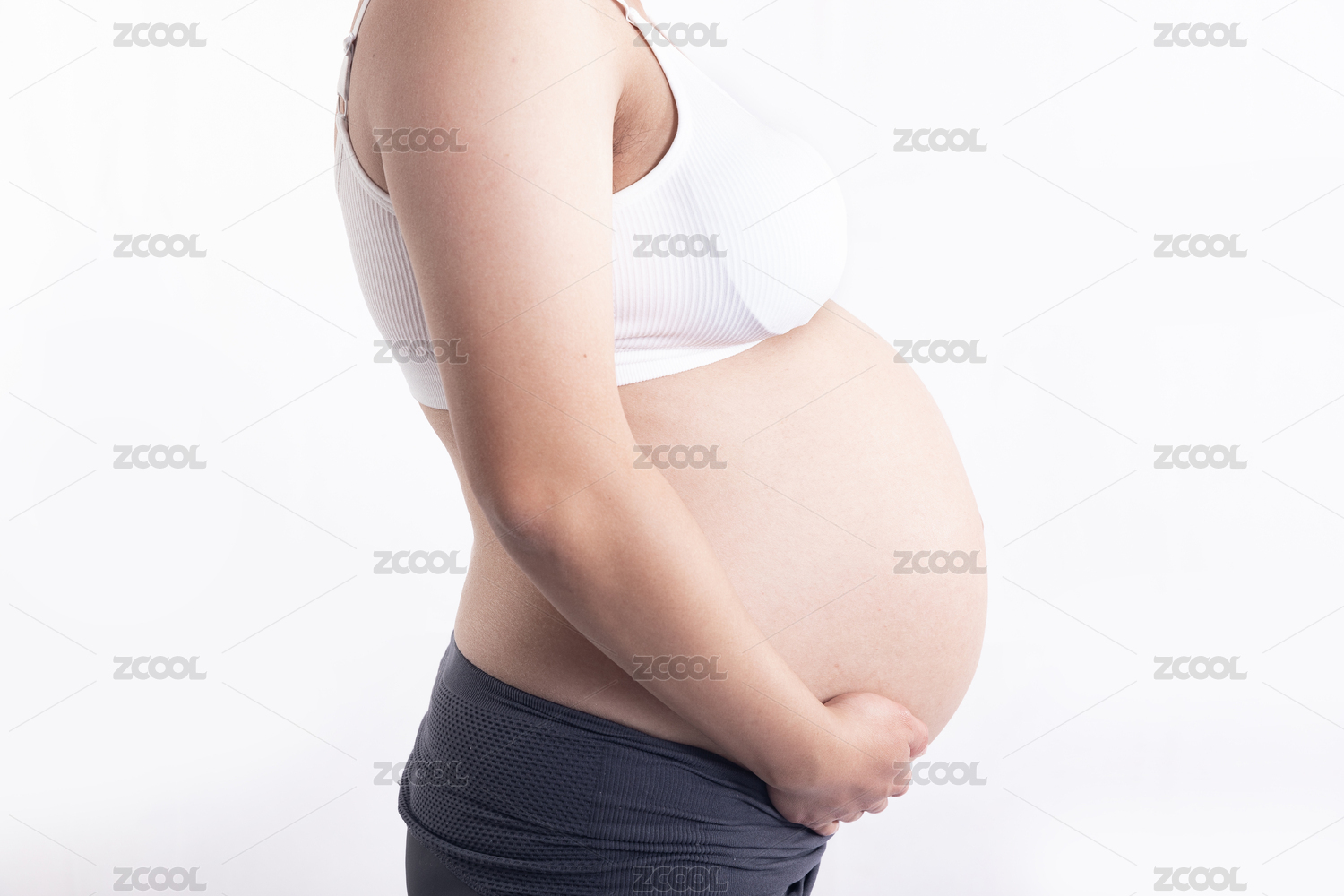 側(cè)面拍攝白色背景前的孕婦用雙手托著大肚子