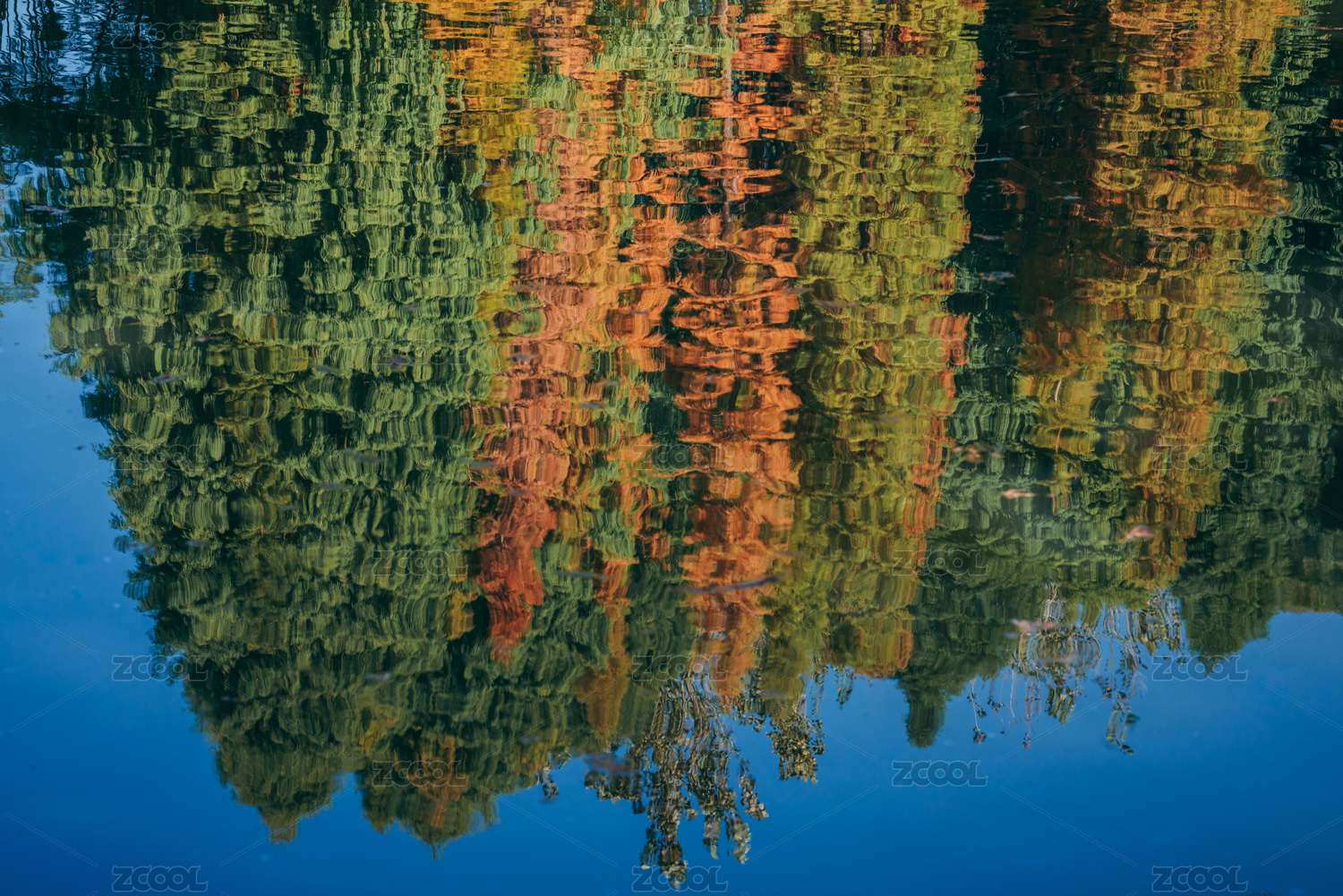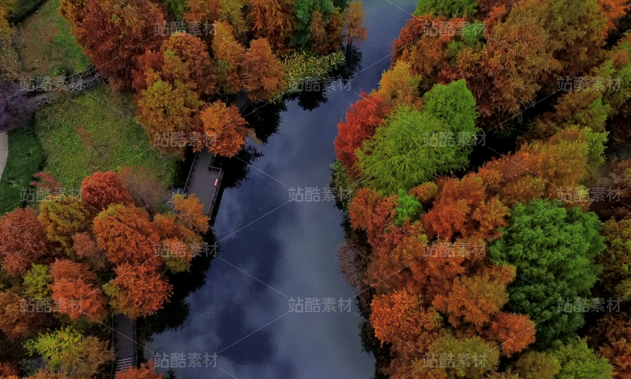 秋日河道兩岸水杉與落葉喬木層疊出橙紅