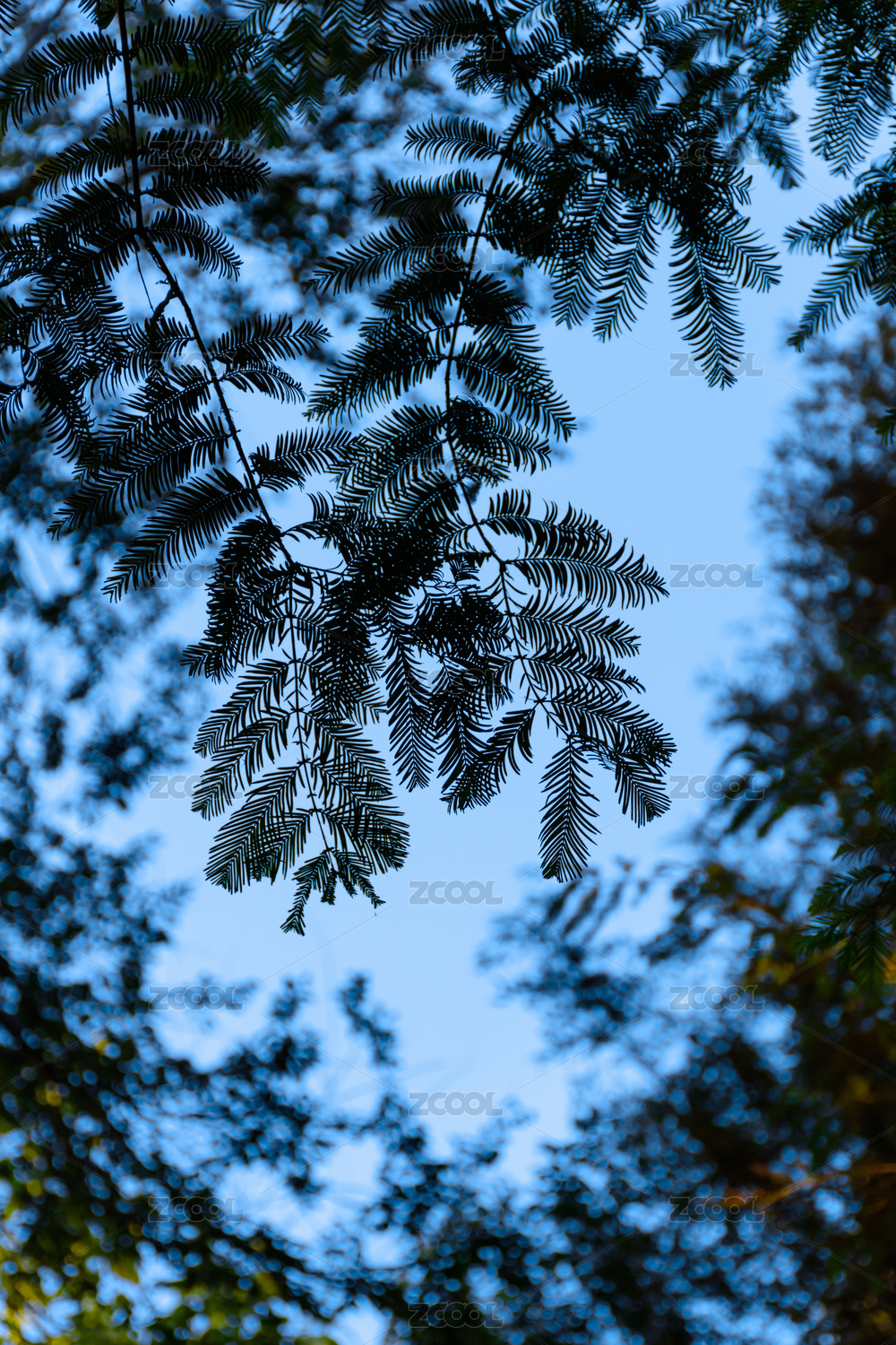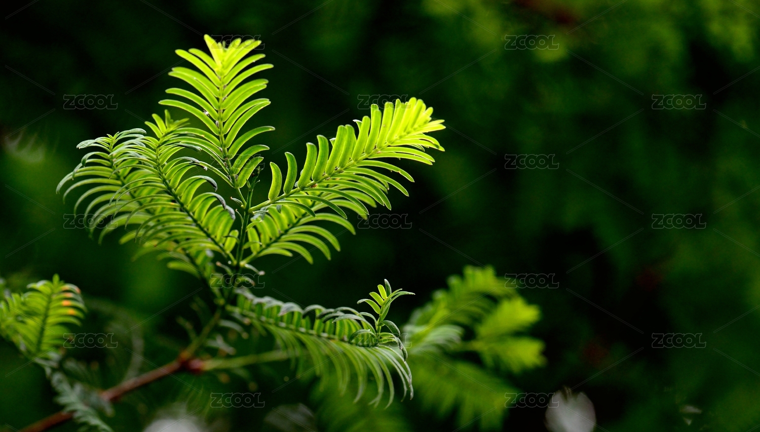 側(cè)逆光中的嫩綠水杉樹葉特寫