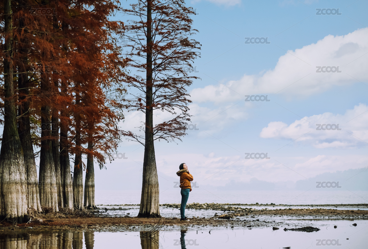 中國女性在寧波余姚四明湖深秋的水杉林游玩