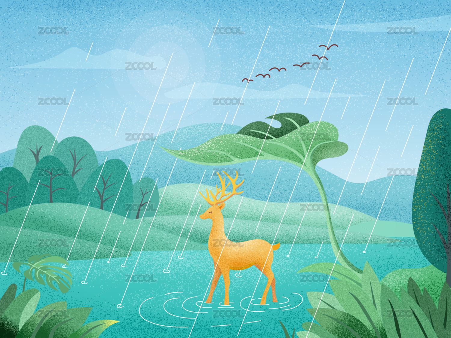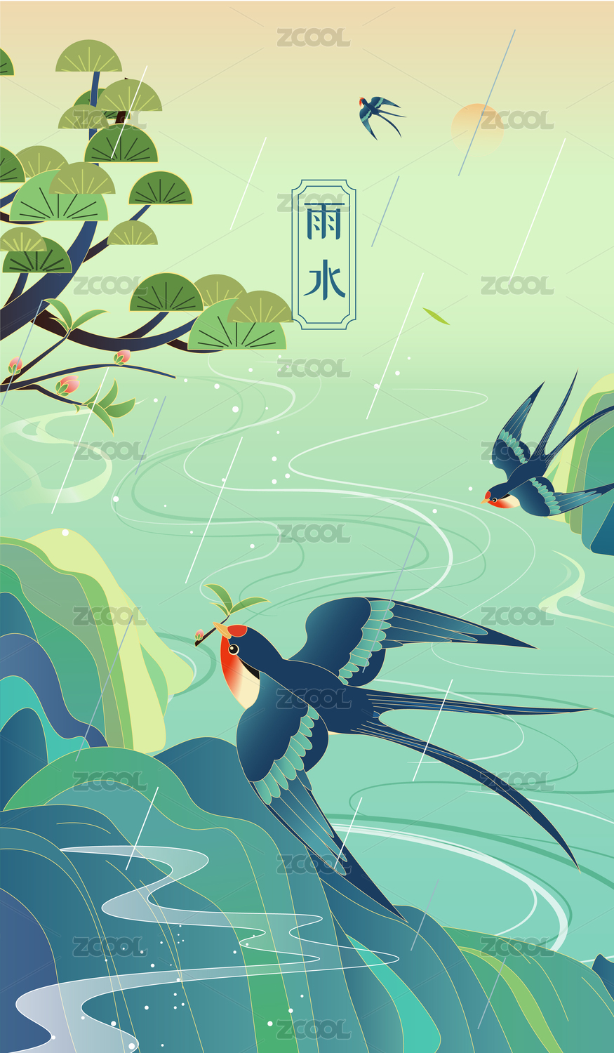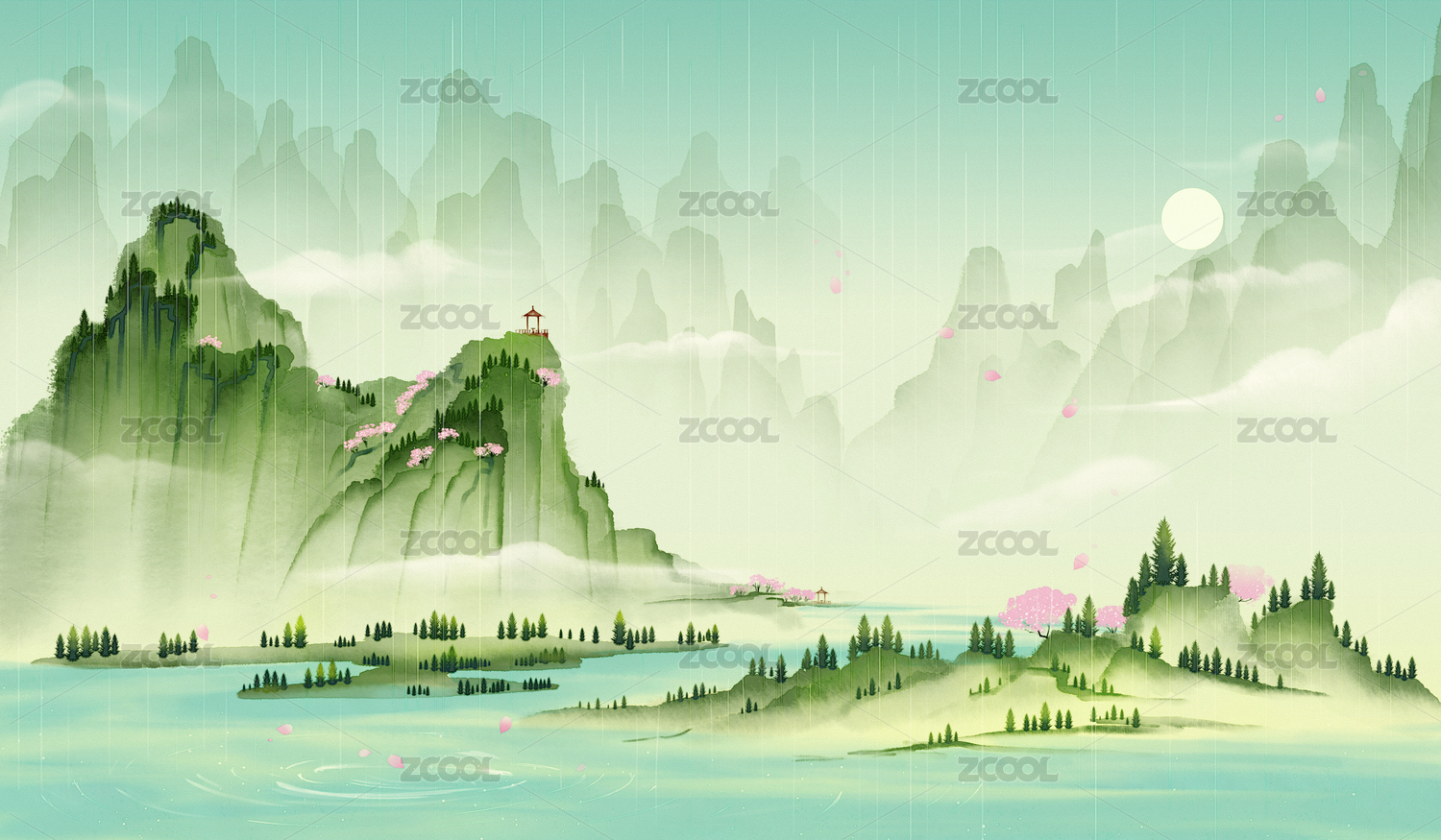 綠色調(diào)國風(fēng)山水畫雨水插畫